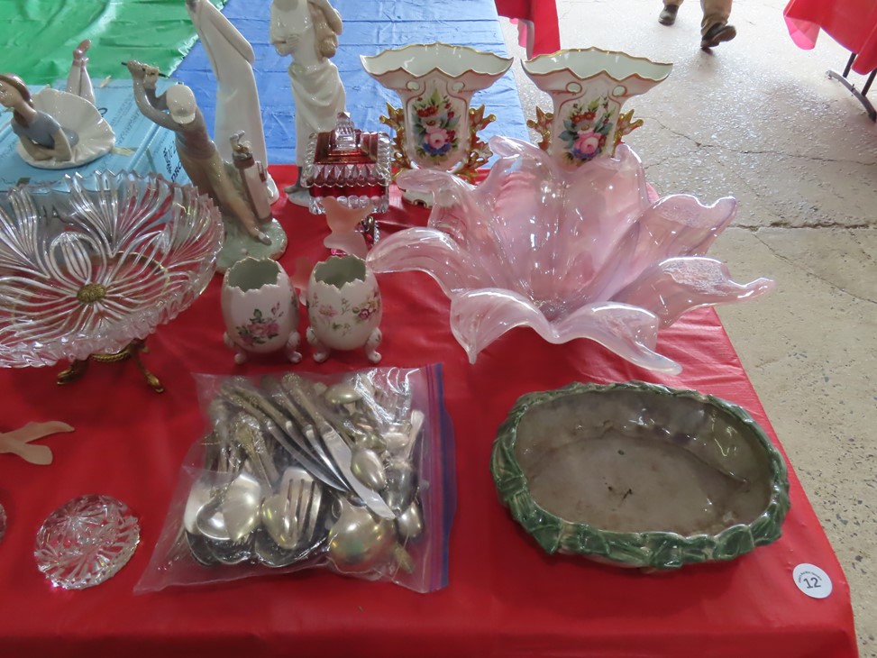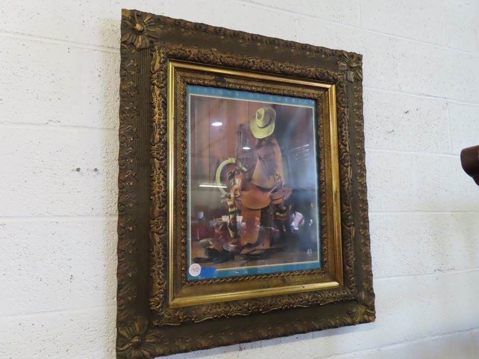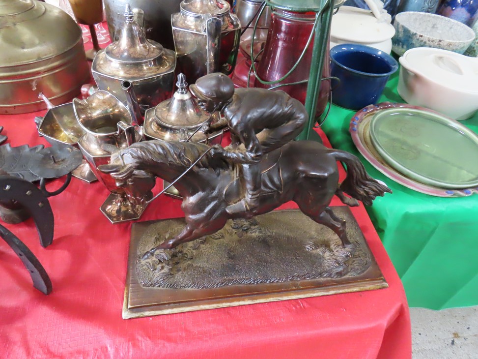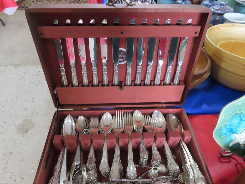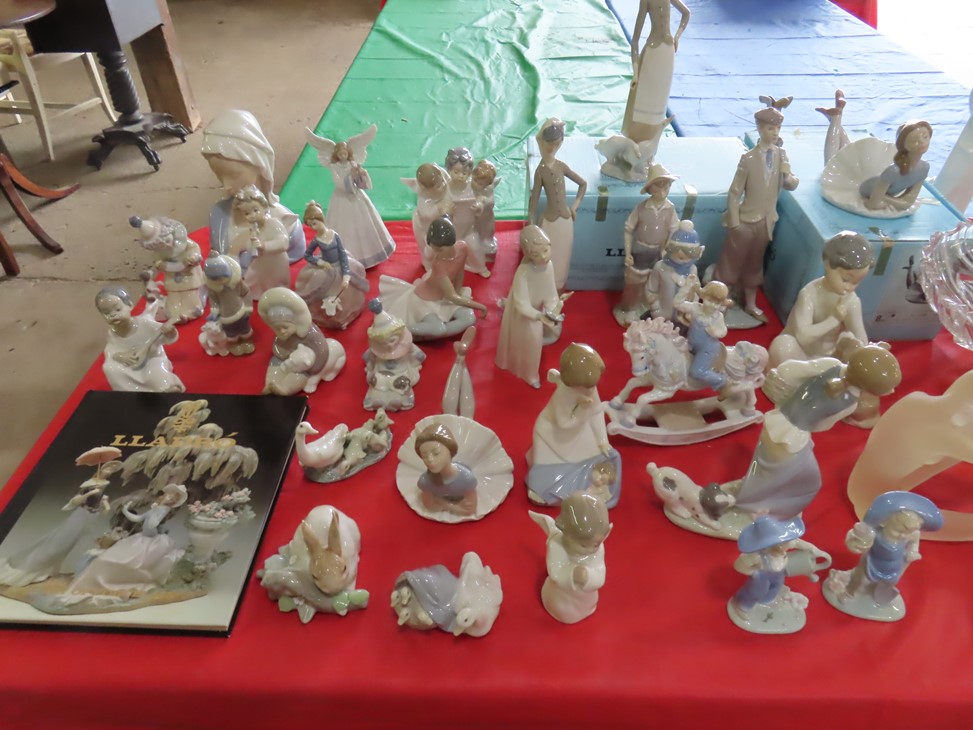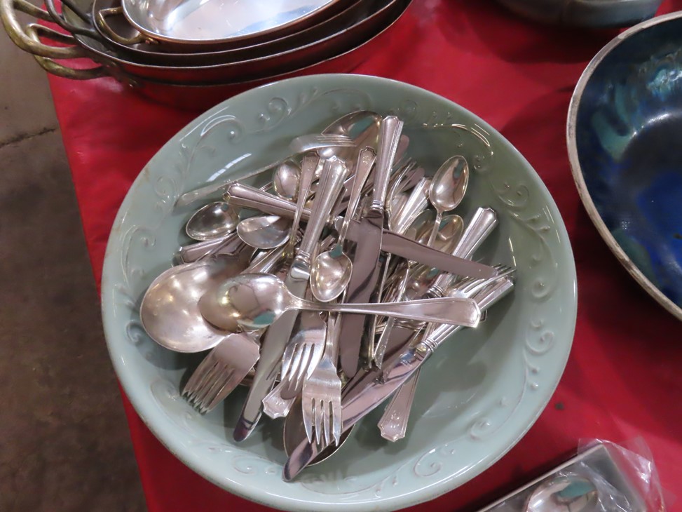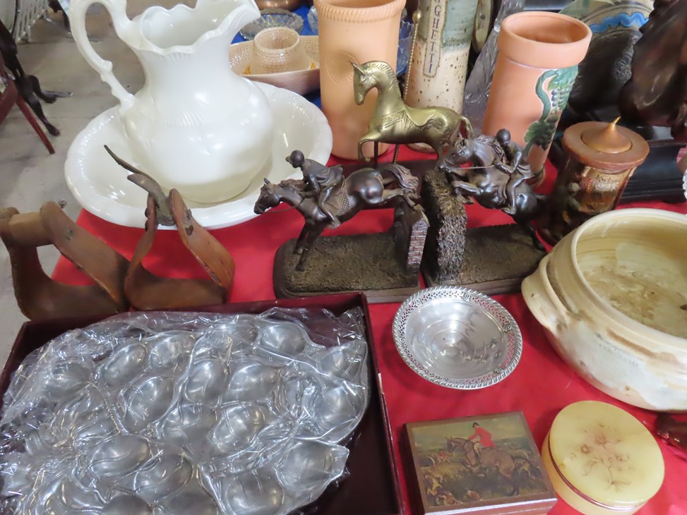 ART & SILVER: Numerous Lladro’ figurines; Great art! Civil War prints; Old riverside cottage scene; Hunt prints; “Visions of America” print; Printer’s tray with knick-knacks; Brass horses; Horsehead; Nice horse & rider sculpture; More horse figurines; Glass shark figure; Sterling & silver-plate! 2 sets of sterling flatware; More flatware; Coffee & tea service; Creamers; Spoons; Stirrup cups; Mugs; S&P shakers; Teaspoons; Pewter sugar & creamer set & much more!
