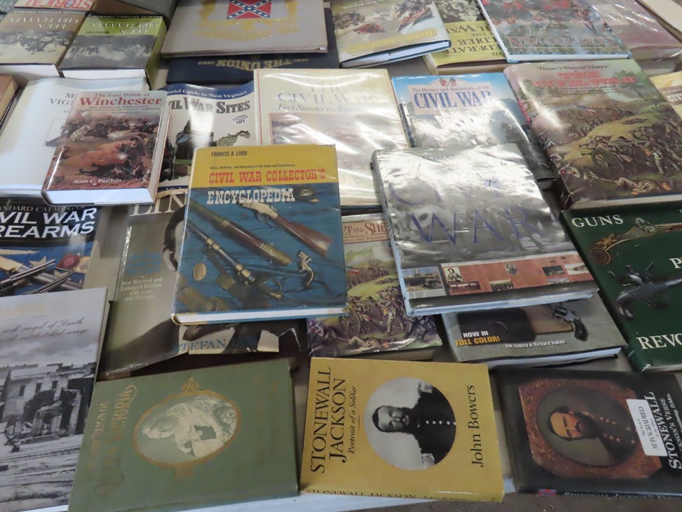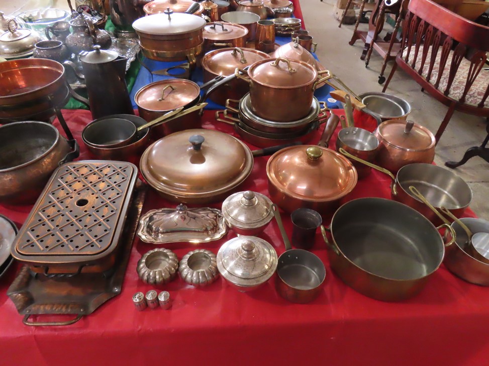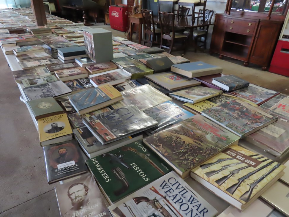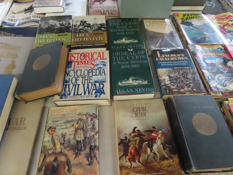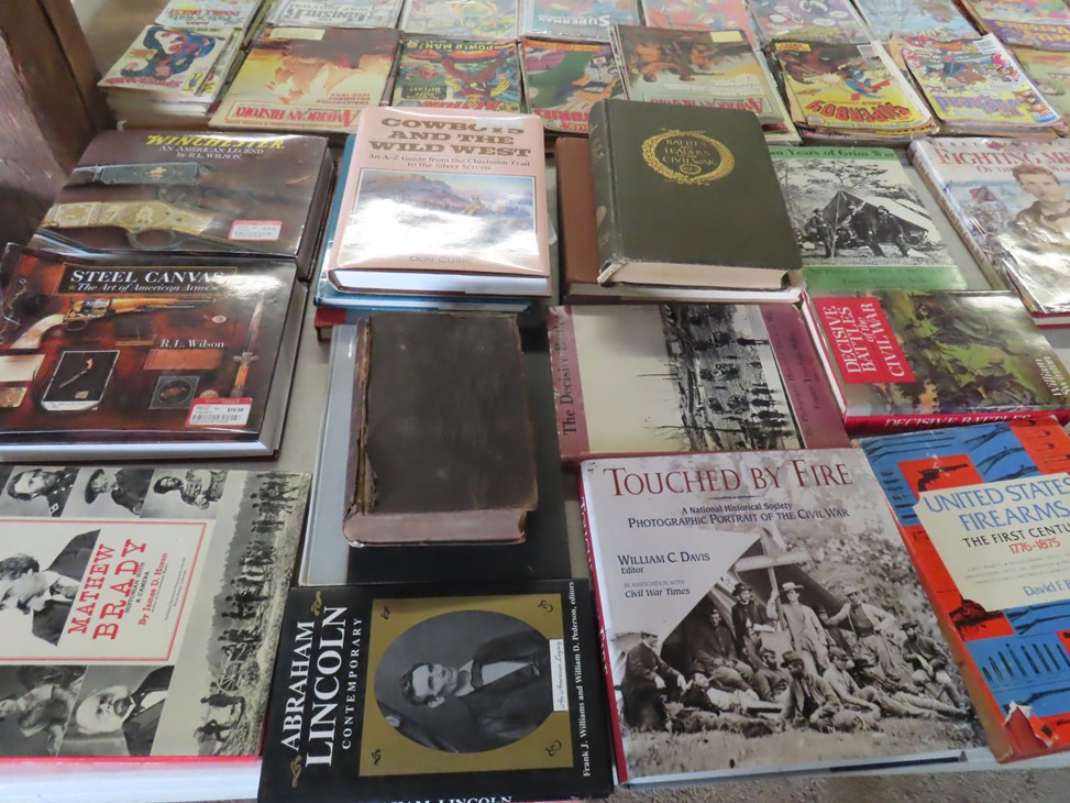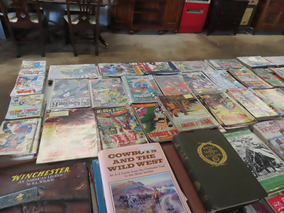 MORE: Huge old church bell; Old Coca-Cola store box cooler; Large Lance vending machine; Old portable cooler; Wooden Coke carrier box; Old cameras; Nikon Kalimar; Wonderful pair of Jumping horse bookends; Saddles; Stirrups; Old salt glaze crock; Oil lamps; RR lanterns; Wooden rolling pins; Pizza peel; Turned woodenware; Sad iron; Old food grinder; Old razors; Fine & costume jewelry; Coins, Currency; Silver dollars; Tables full of copper pots & pans; Tin lined copper bowl; Mugs; Chafing dishes; Large oval covered server; Bed warmers; Copper ham boiler; Painted ham boiler; Nail keg; Painted milk can; English saddles; Numerous wood boxes; Horse brasses; Inkwell; valet tray; Carriage clock; Dresser bottles; Seashells; Terra-cotta wine coolers; Horseshoe candleholder; Stone tree; Enameled acorn box; Old blue jars; Stone serving bowl; Cast iron ham boilers; Metal shelf; Old Comic books! Hopalong Cassidy; Wings Comics; Red Circle; Navy Heros; Lois Lane; Superboy; Supergirl; Superman; Batman; Shazam; G.I. Combat; True Comics; New Teen Titans; Sgt. Rock; Flintstones; Spider-man; Tarzan; Blondie; Archies; Veronica; Jughead; Wonder Woman; Many more 10¢ and 12¢ comic books by the stack! Should be some unresearched treasures here!; Old Toys! Dinky toys with boxes-dozens of Dinky Toys! Corgi models with boxes; Solida; models; Old car models in boxes; Lots of metal toy cars, trucks, buses & fire engine; Hair Bear Bunch & another metal lunch box; Toy Soldiers in sets & collections; Britain’s Toy Soldiers in boxes; Dinky mint road signs; Toy planes; Farm animals, Trees; Signposts, Fences; Robin Hood arrows in boxes; More Great Old toys!; Great old Books on Civil War & Guns! Winchester; Cowboys and the Wild West; Battles and Leaders of the Civil War; Matthew Brady; Abraham Lincoln; Touched by Fire; Steel Canvas; United States Firearms; Lee’s Lieutenants; Weapons of the Civil War; Civil War Collector’s Encyclopedia; A few old guns & much much more!