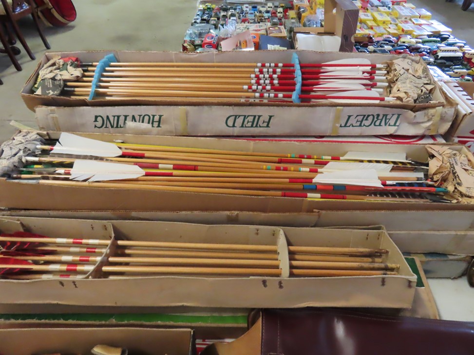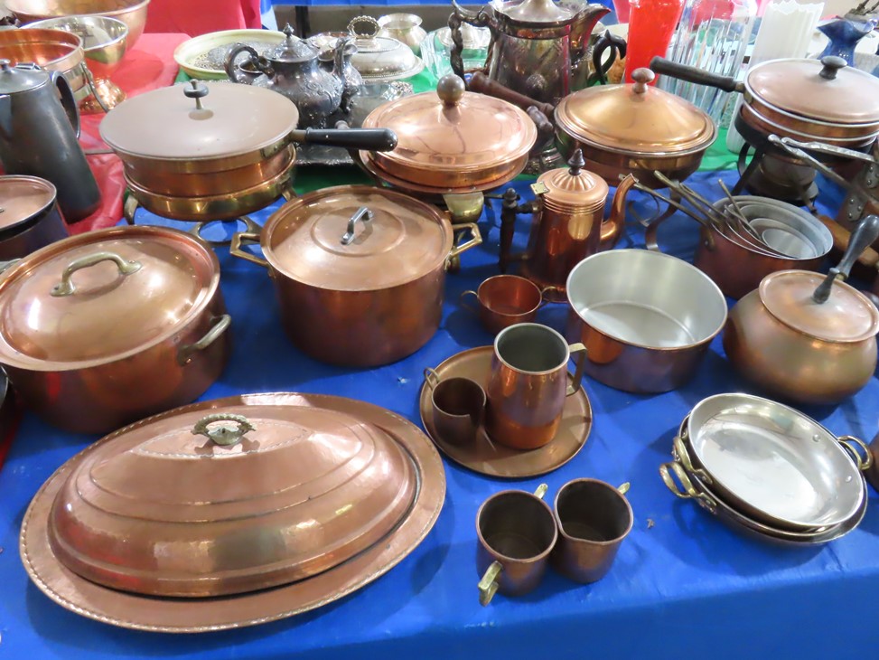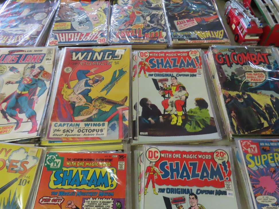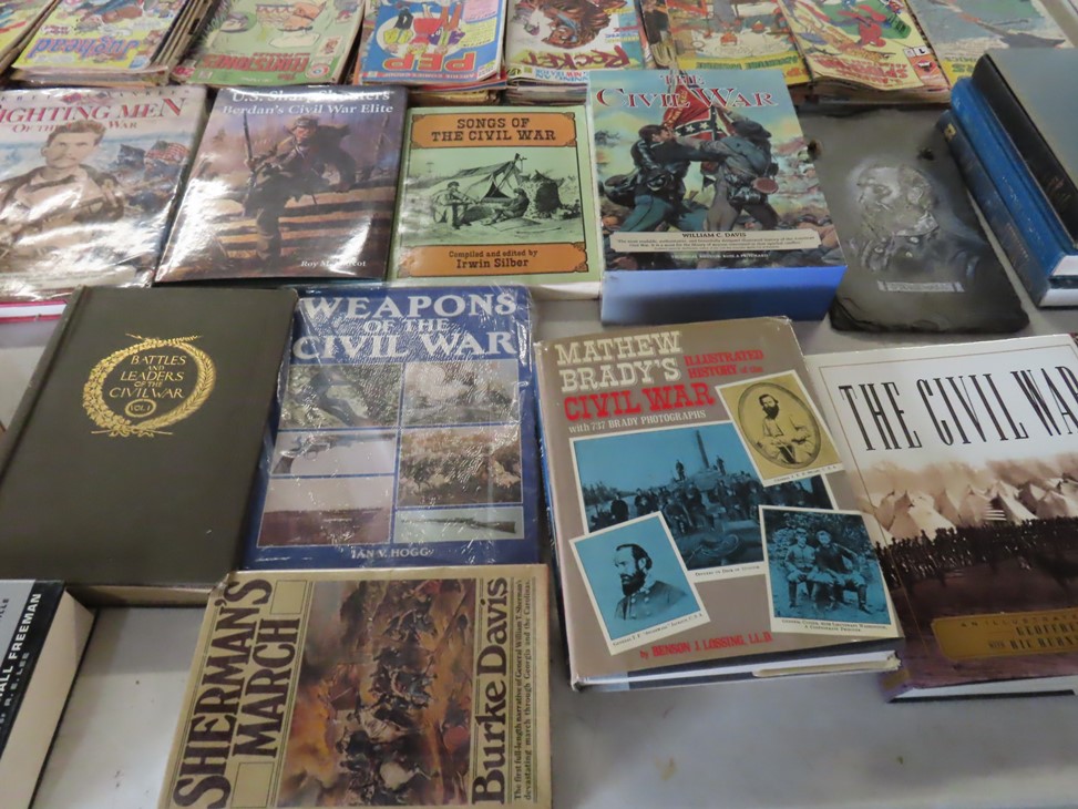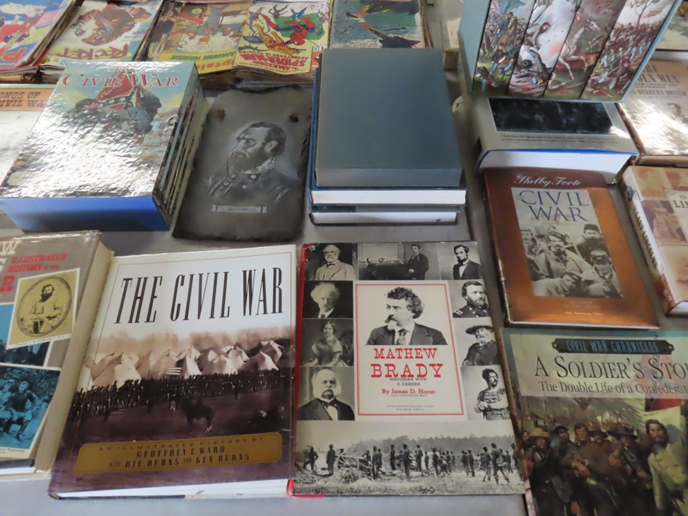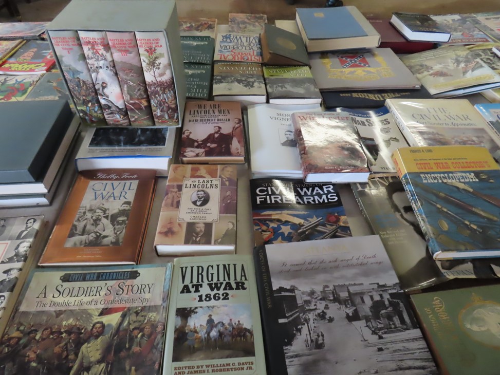 MORE: Huge old church bell; Old Coca-Cola store box cooler; Large Lance vending machine; Old portable cooler; Wooden Coke carrier box; Old cameras; Nikon Kalimar; Wonderful pair of Jumping horse bookends; Saddles; Stirrups; Old salt glaze crock; Oil lamps; RR lanterns; Wooden rolling pins; Pizza peel; Turned woodenware; Sad iron; Old food grinder; Old razors; Fine & costume jewelry; Coins, Currency; Silver dollars; Tables full of copper pots & pans; Tin lined copper bowl; Mugs; Chafing dishes; Large oval covered server; Bed warmers; Copper ham boiler; Painted ham boiler; Nail keg; Painted milk can; English saddles; Numerous wood boxes; Horse brasses; Inkwell; valet tray; Carriage clock; Dresser bottles; Seashells; Terra-cotta wine coolers; Horseshoe candleholder; Stone tree; Enameled acorn box; Old blue jars; Stone serving bowl; Cast iron ham boilers; Metal shelf; Old Comic books! Hopalong Cassidy; Wings Comics; Red Circle; Navy Heros; Lois Lane; Superboy; Supergirl; Superman; Batman; Shazam; G.I. Combat; True Comics; New Teen Titans; Sgt. Rock; Flintstones; Spider-man; Tarzan; Blondie; Archies; Veronica; Jughead; Wonder Woman; Many more 10¢ and 12¢ comic books by the stack! Should be some unresearched treasures here!; Old Toys! Dinky toys with boxes-dozens of Dinky Toys! Corgi models with boxes; Solida; models; Old car models in boxes; Lots of metal toy cars, trucks, buses & fire engine; Hair Bear Bunch & another metal lunch box; Toy Soldiers in sets & collections; Britain’s Toy Soldiers in boxes; Dinky mint road signs; Toy planes; Farm animals, Trees; Signposts, Fences; Robin Hood arrows in boxes; More Great Old toys!; Great old Books on Civil War & Guns! Winchester; Cowboys and the Wild West; Battles and Leaders of the Civil War; Matthew Brady; Abraham Lincoln; Touched by Fire; Steel Canvas; United States Firearms; Lee’s Lieutenants; Weapons of the Civil War; Civil War Collector’s Encyclopedia; A few old guns & much much more!