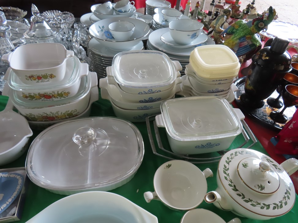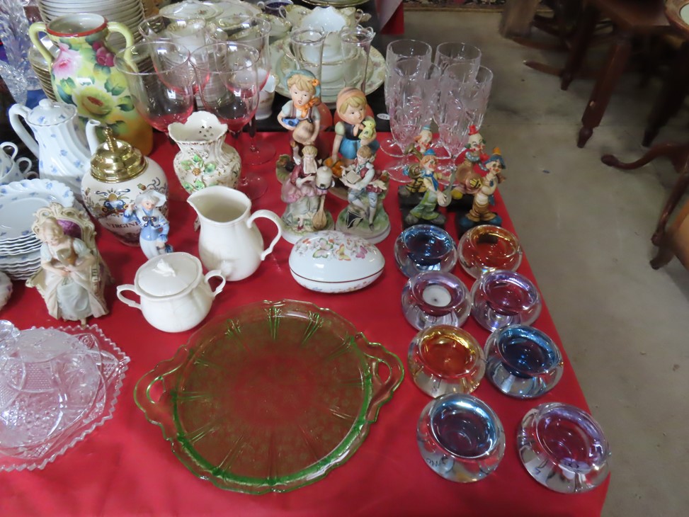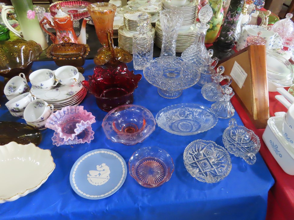 CHINA & GLASS: Royal Worcester Evesham collection including colander, mugs, egg coddler, & more; Pair of fan top decorated vases; Noritake dinnerware set; Pair of egg vases; Figurines; Washbowl & pitcher; Studio pottery; Devil egg holder; Elephants; Hand-painted ceramics; Dinnerware set; Figurines; Clown figures; Teapots; Cat in basket; Pitchers; Wedgwood lighter; Wedgwood plates; Blue Danube dinnerware; Fairing; Cabbage leaf plates; Dessert set; Wedgwood ashtrays; Frosted crystal figurine; Large art glass flower bowl; Green depression master berry & serving bowls; Cobalt glass bowl; Pyrex mixing bowls; Candy container; Corning ware in several sizes, patterns & pieces with lids; Wine coaster; Green depression plates; Pink depression candy dish; Crystal bowl with metal feet; Paperweight; Heavy ashtray; Crystal bowl; Decanter; Stemware; Art glass vase; Opalescent hobnail dish; Candleholders; Cake stands; Carnival glass vase; Glass box; Etched bowl; Amber glass collection; Ruby glass; Cruets; Large glass canister; Glasses; Crystal S&P and more!