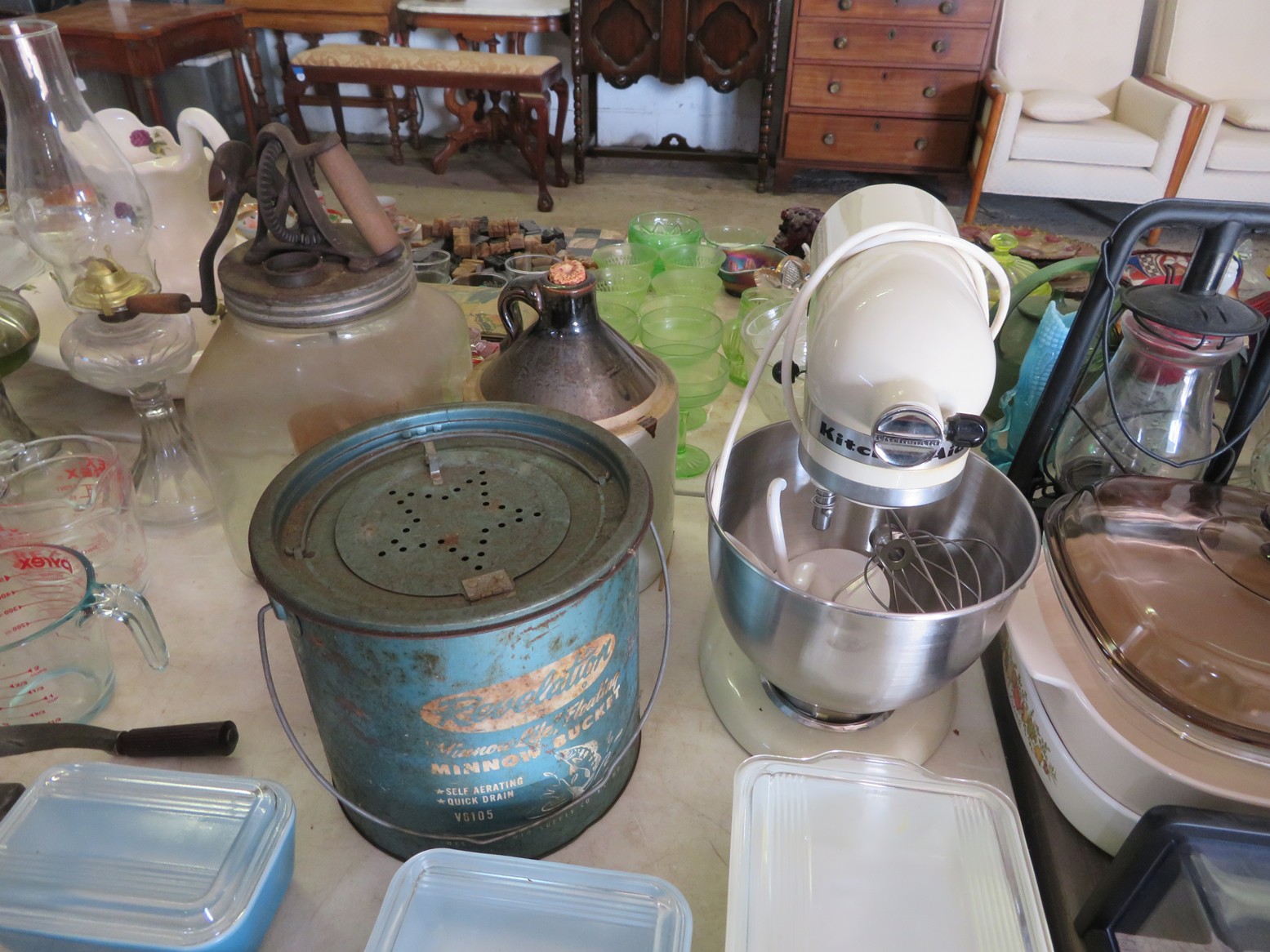 MORE: KitchenAid mixer; Dazey churn; Pyrex refrigerator dishes; Corning ware casseroles with lids; Old lantern; Minnow bucket; Stoneware jug; Pyrex measuring cups; Oil lamps; Red rimmed white enameled kitchen pans; Meat grinder; Cast iron frying pans; Sad irons; Screw nutcracker; Cast iron kettle; Lots of old bottles; Lots of blue canning jars; Canning funnels; Old razor strop; Cast iron kettle with hanging handle; Chess set; Butter churn; Pickling crock; Blue graniteware pail; Graniteware coffee kettle; Thermos;