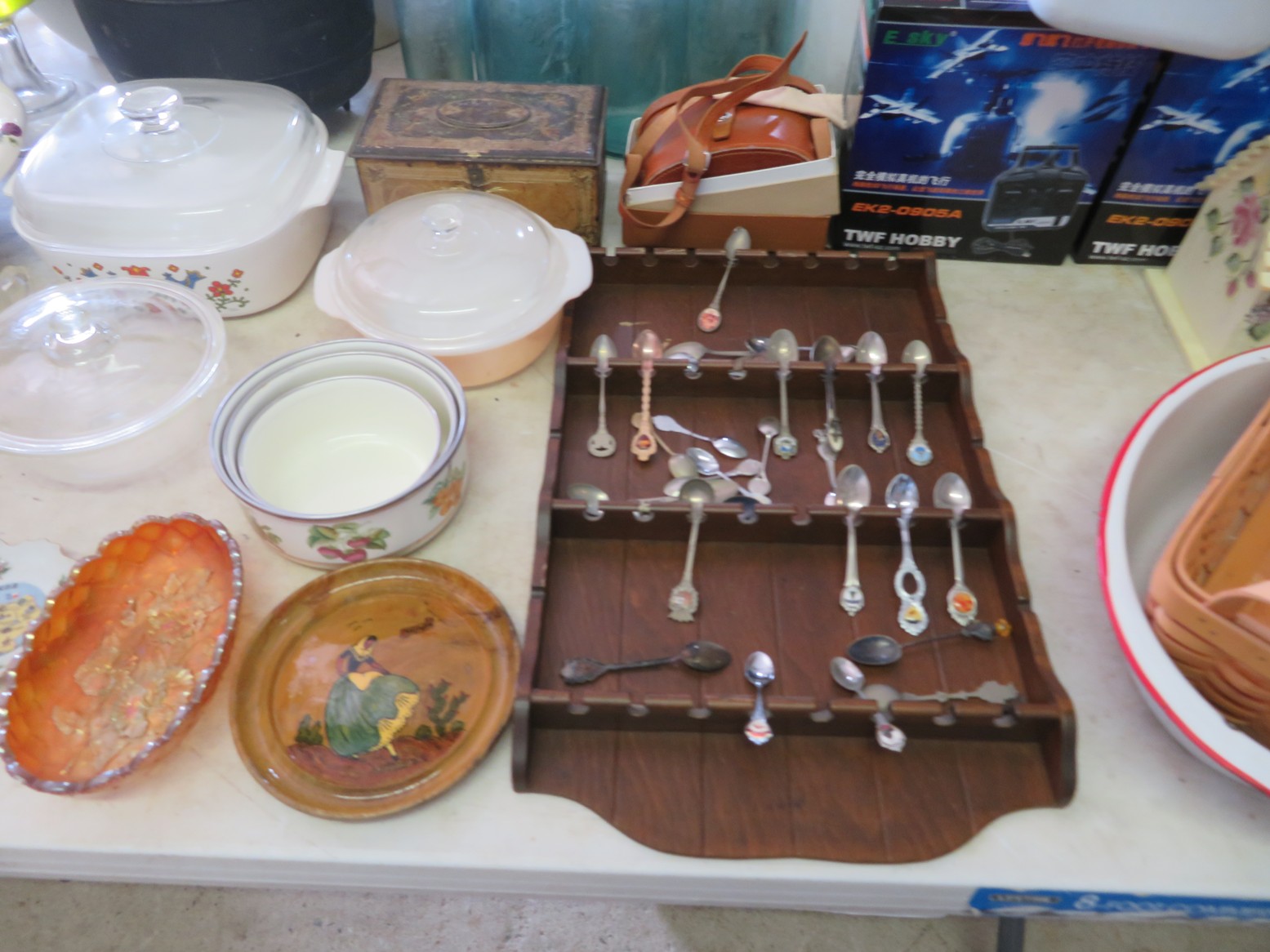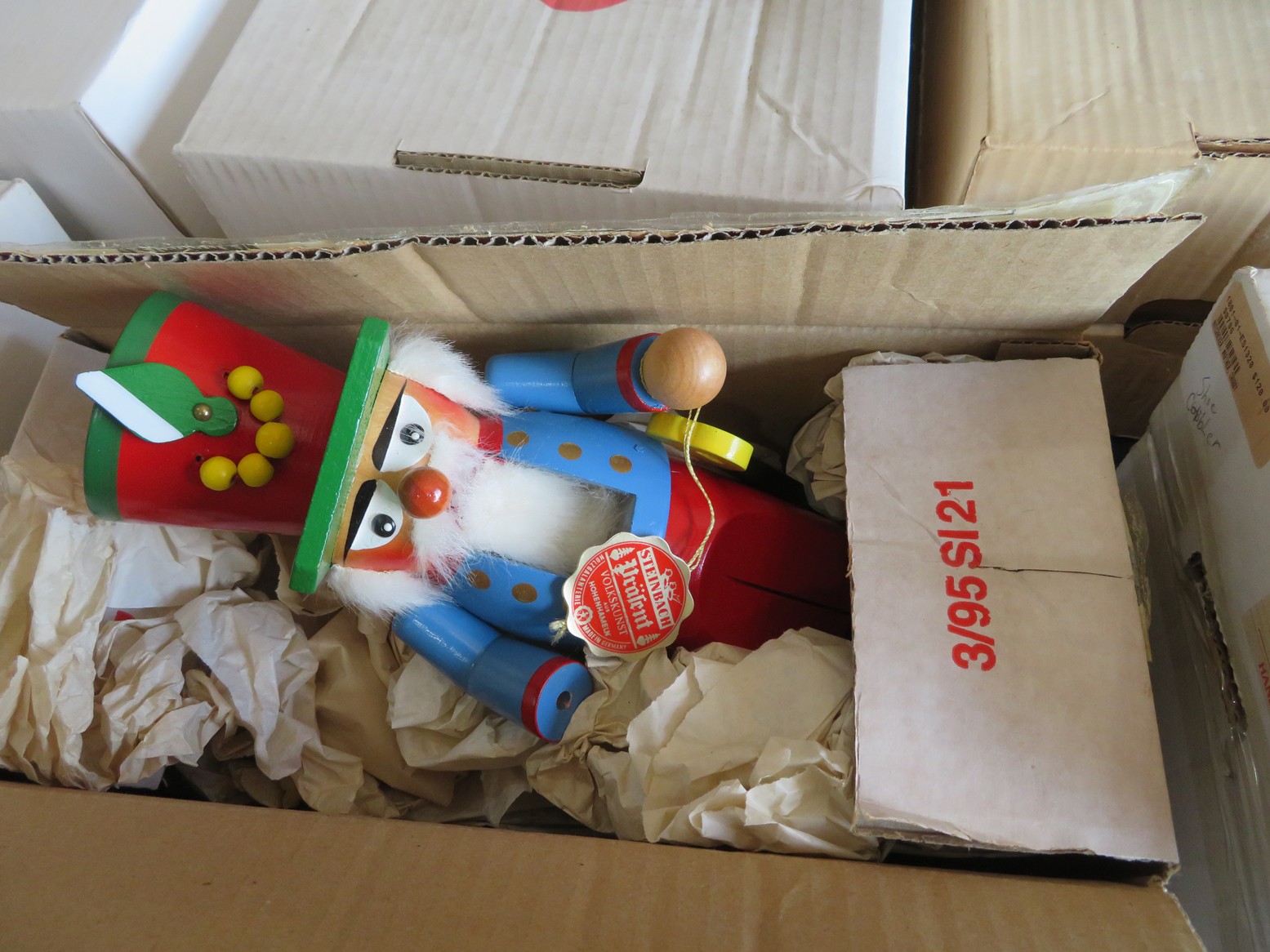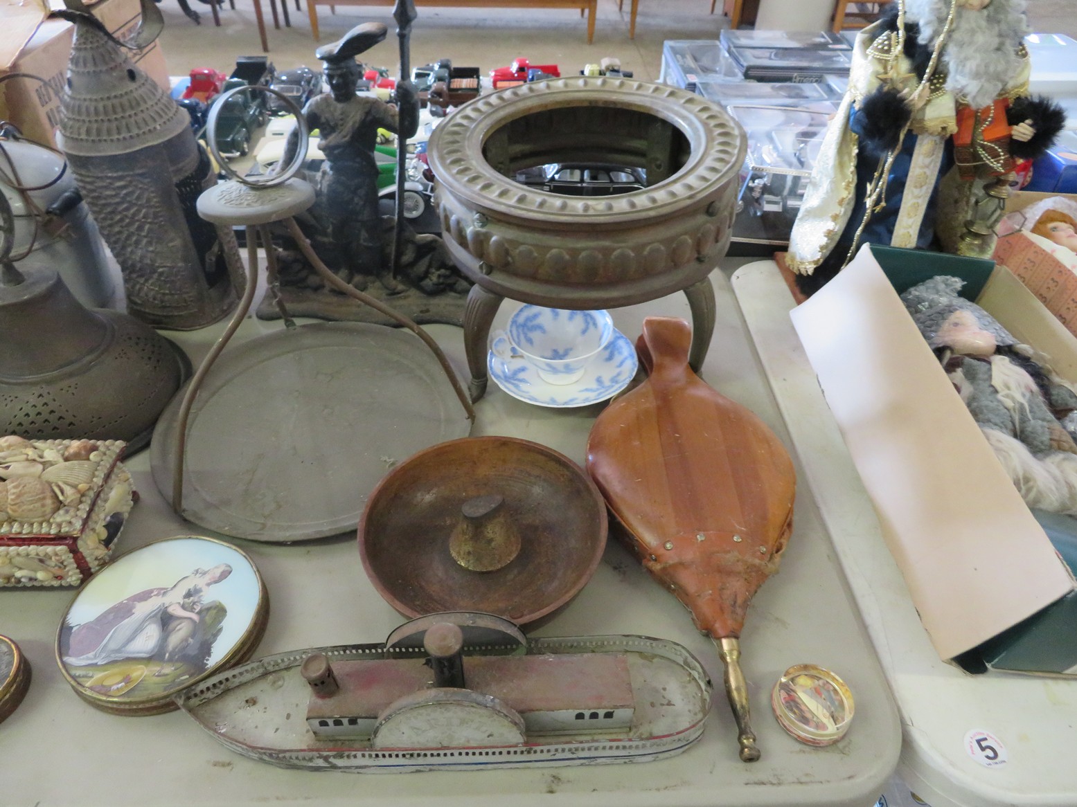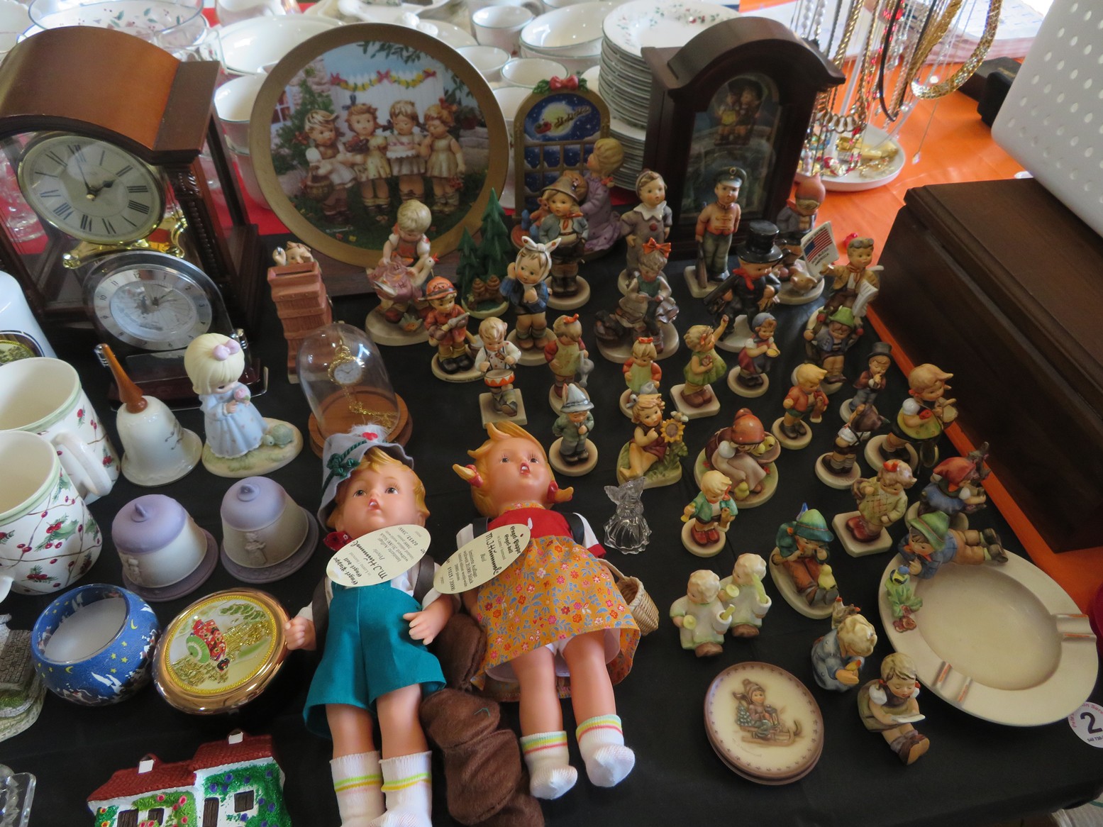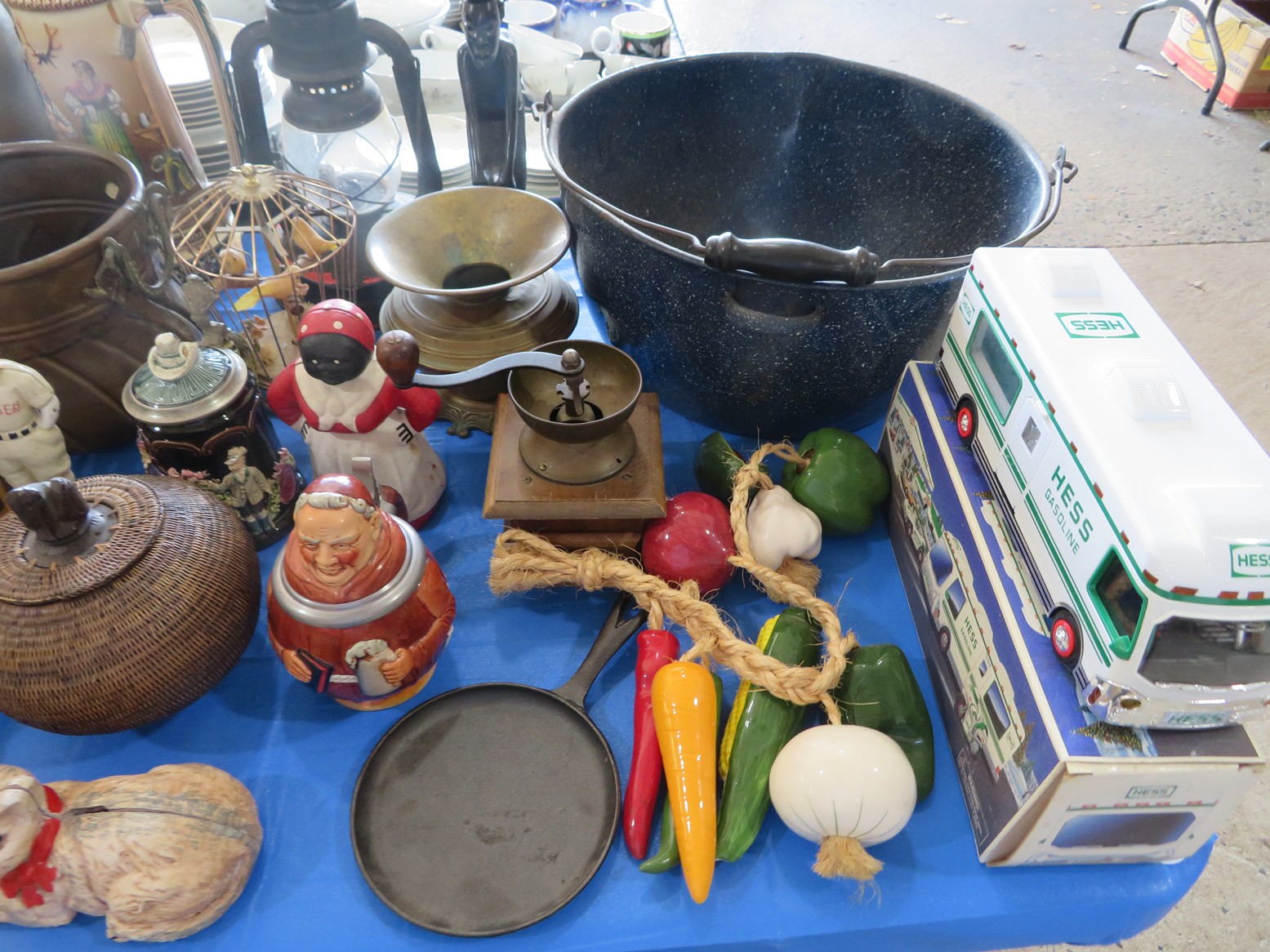Steinbach nutcrackers with tags & boxes; Hummel dolls; Hummels; Hummel plate, ashtray & more; Lots of old milk bottles including cream tops; Vinegar bottles; Bail canning jars; Lots of scale model cars; Old dolls; Collectible dolls; Bellows; Tin steamboat toy; Pierced tin candle holder lantern; Father Christmas doll; Seashell encrusted box; Wooden bucket with brass bands; Old photos & frames; Brass coal bucket; Glass trinket box; Collectible spoons & display; Binoculars in case; Set of enamel on metal bowls; Foo dog; Doll carriage; Hess RV;