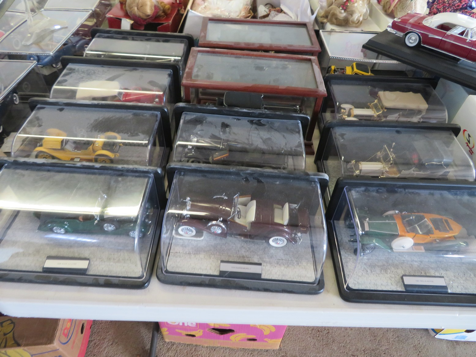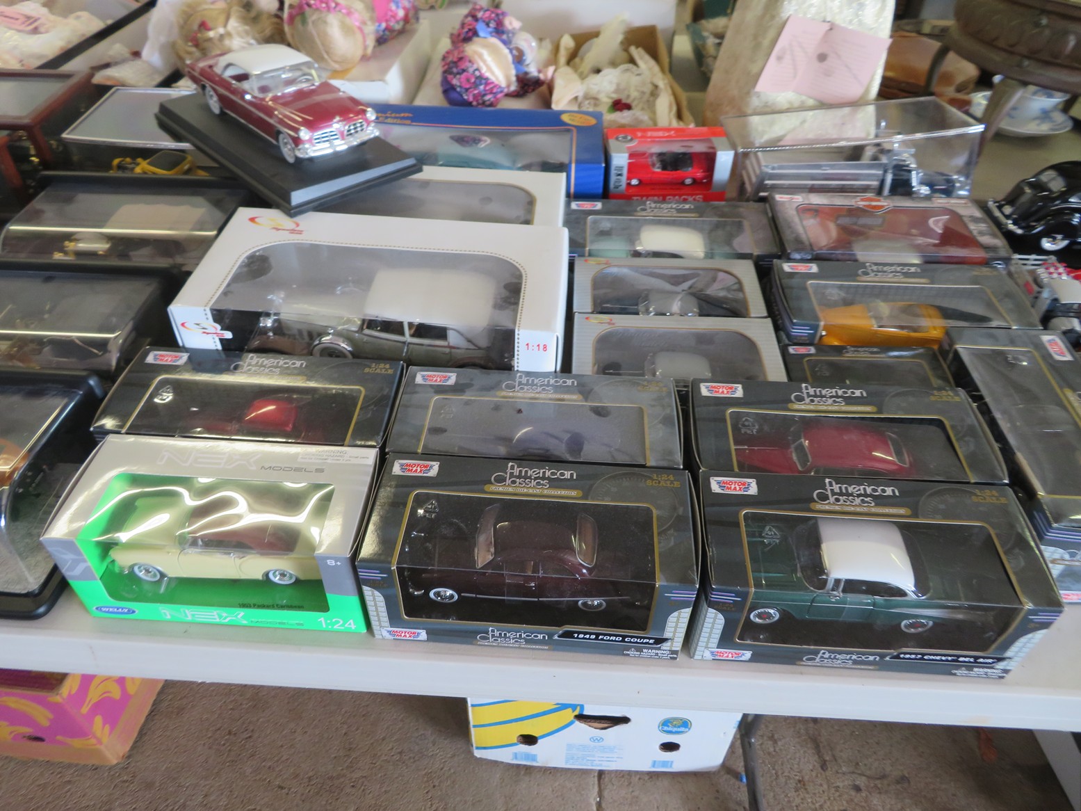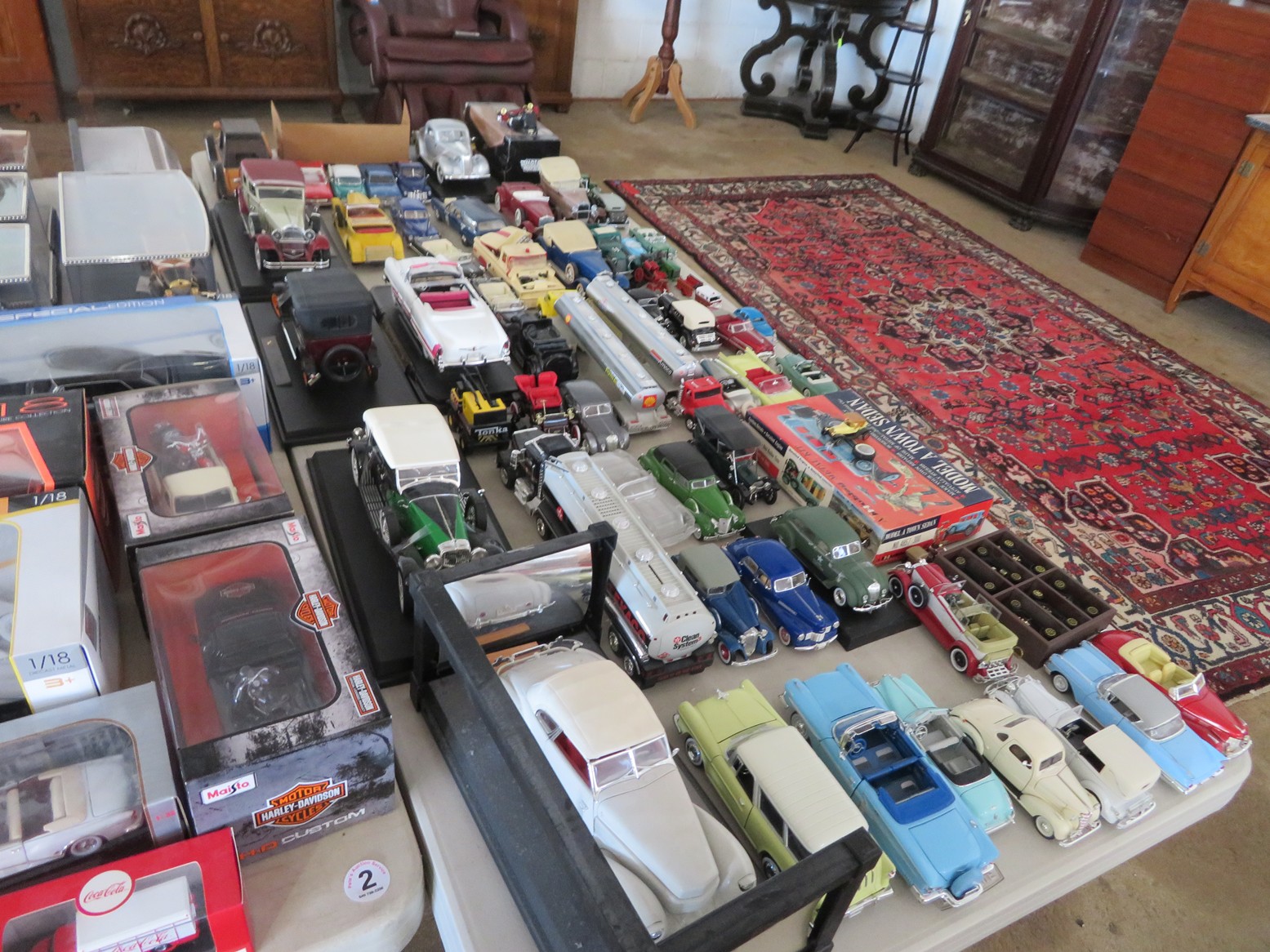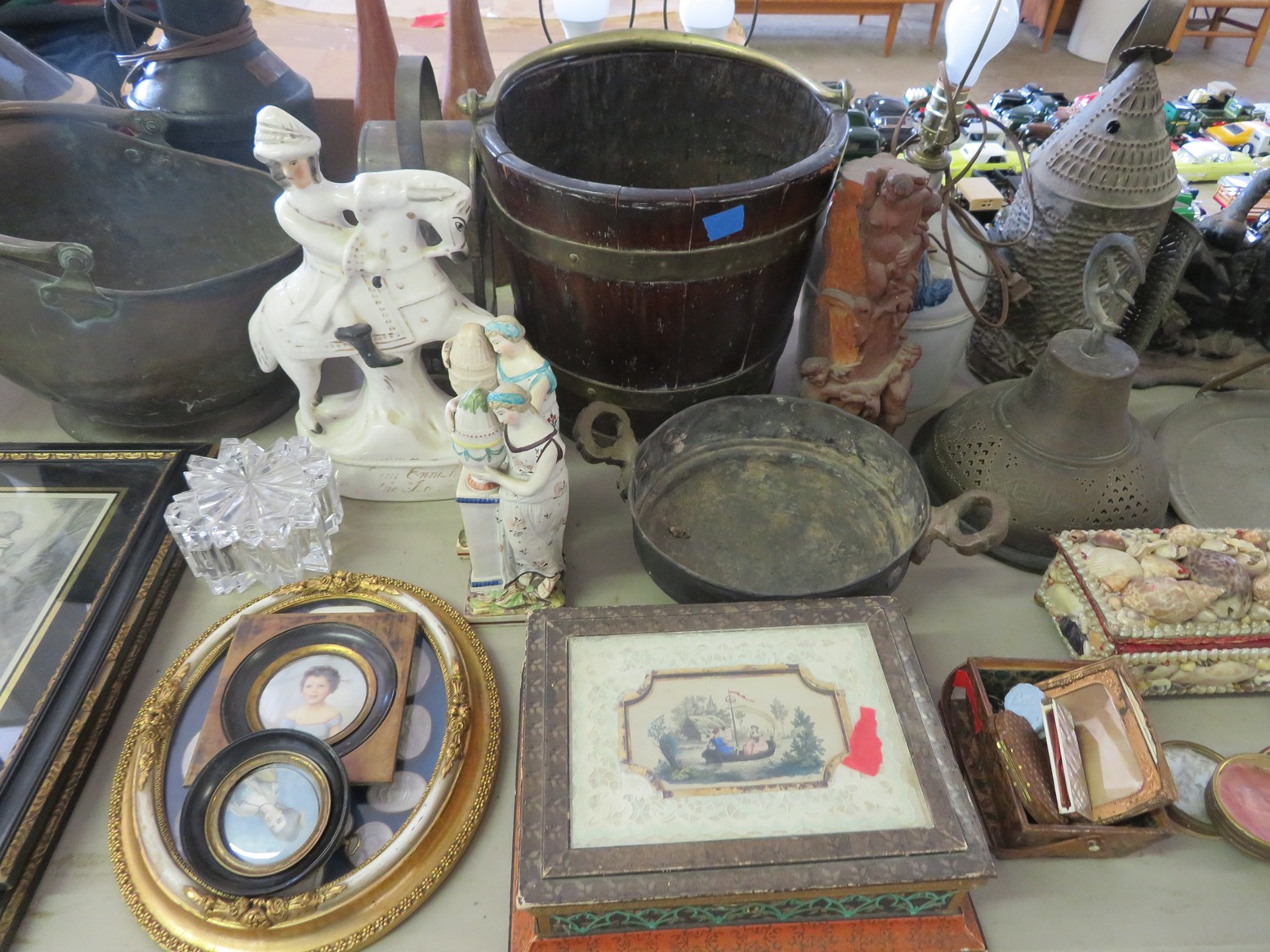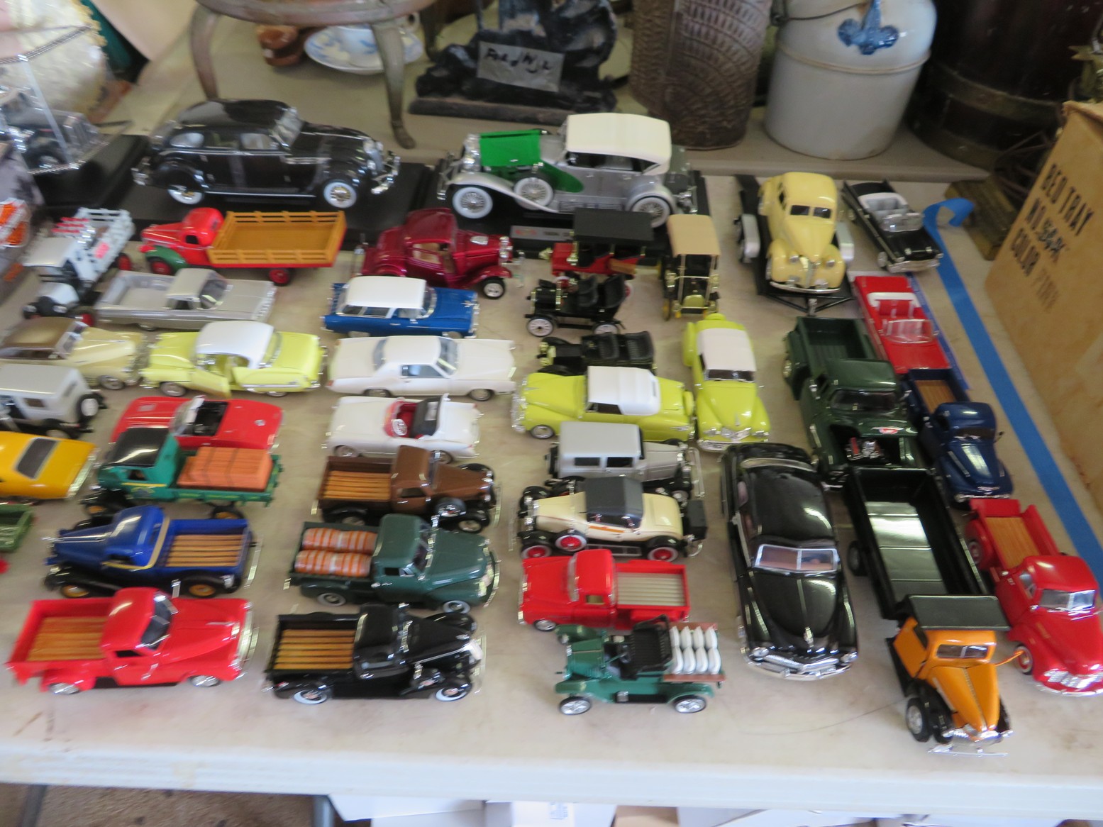 Steinbach nutcrackers with tags & boxes; Hummel dolls; Hummels; Hummel plate, ashtray & more; Lots of old milk bottles including cream tops; Vinegar bottles; Bail canning jars; Lots of scale model cars; Old dolls; Collectible dolls; Bellows; Tin steamboat toy; Pierced tin candle holder lantern; Father Christmas doll; Seashell encrusted box; Wooden bucket with brass bands; Old photos & frames; Brass coal bucket; Glass trinket box; Collectible spoons & display; Binoculars in case; Set of enamel on metal bowls; Foo dog; Doll carriage; Hess RV;