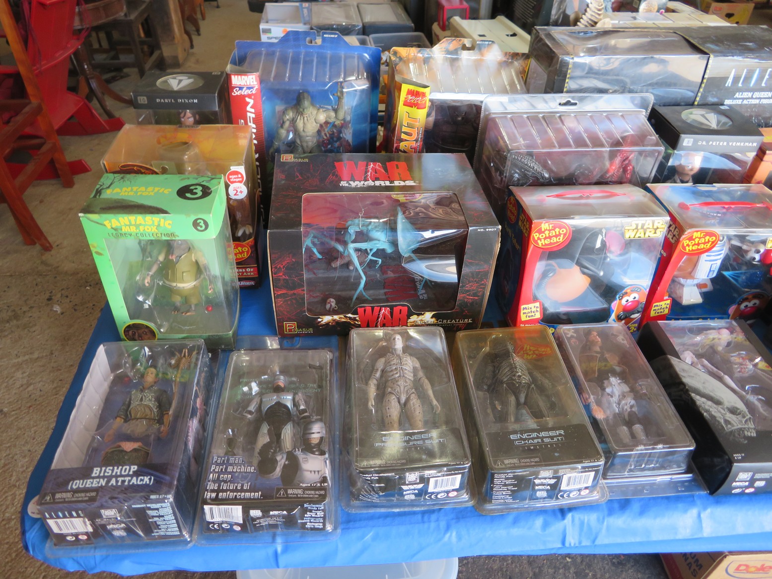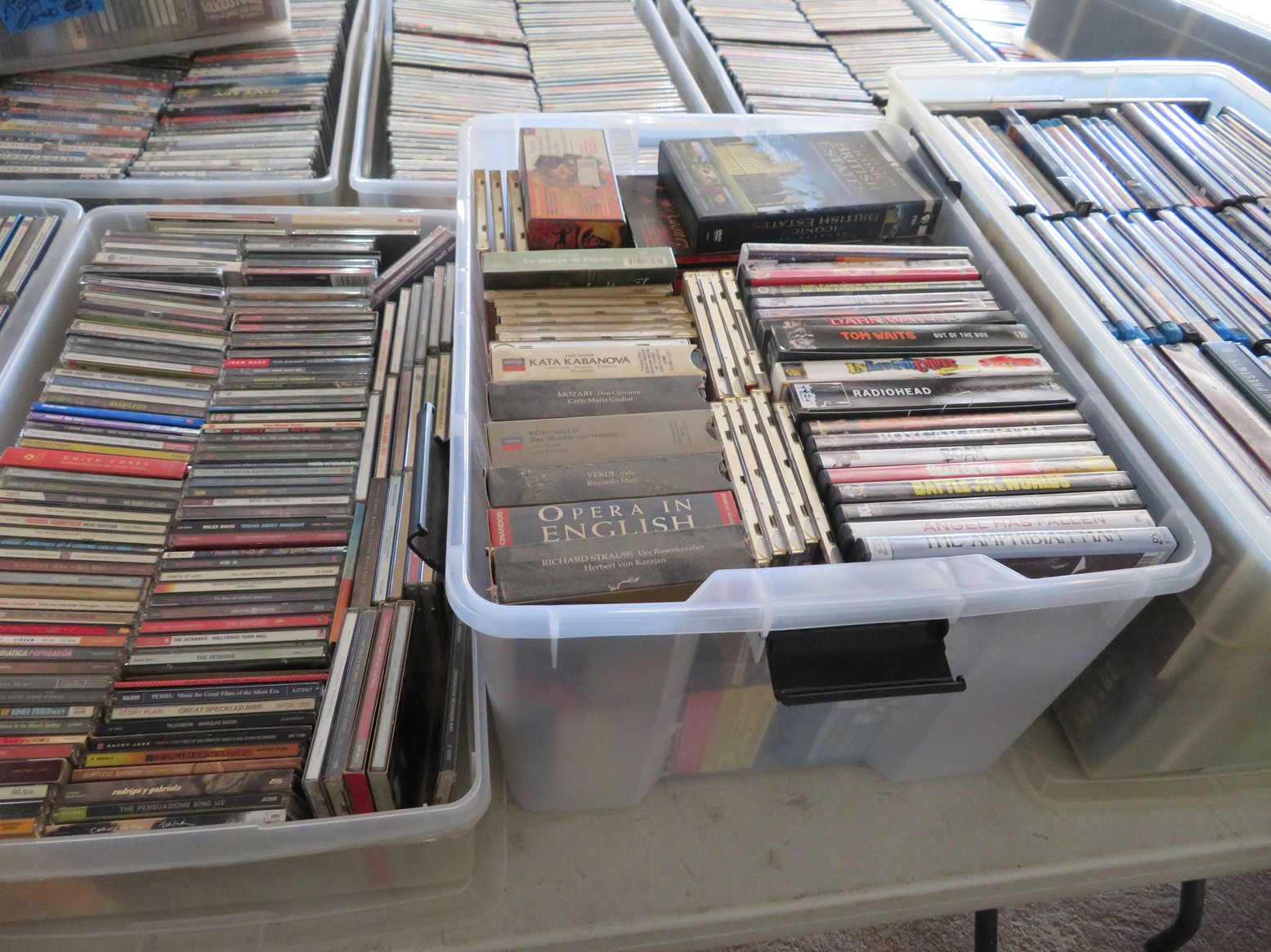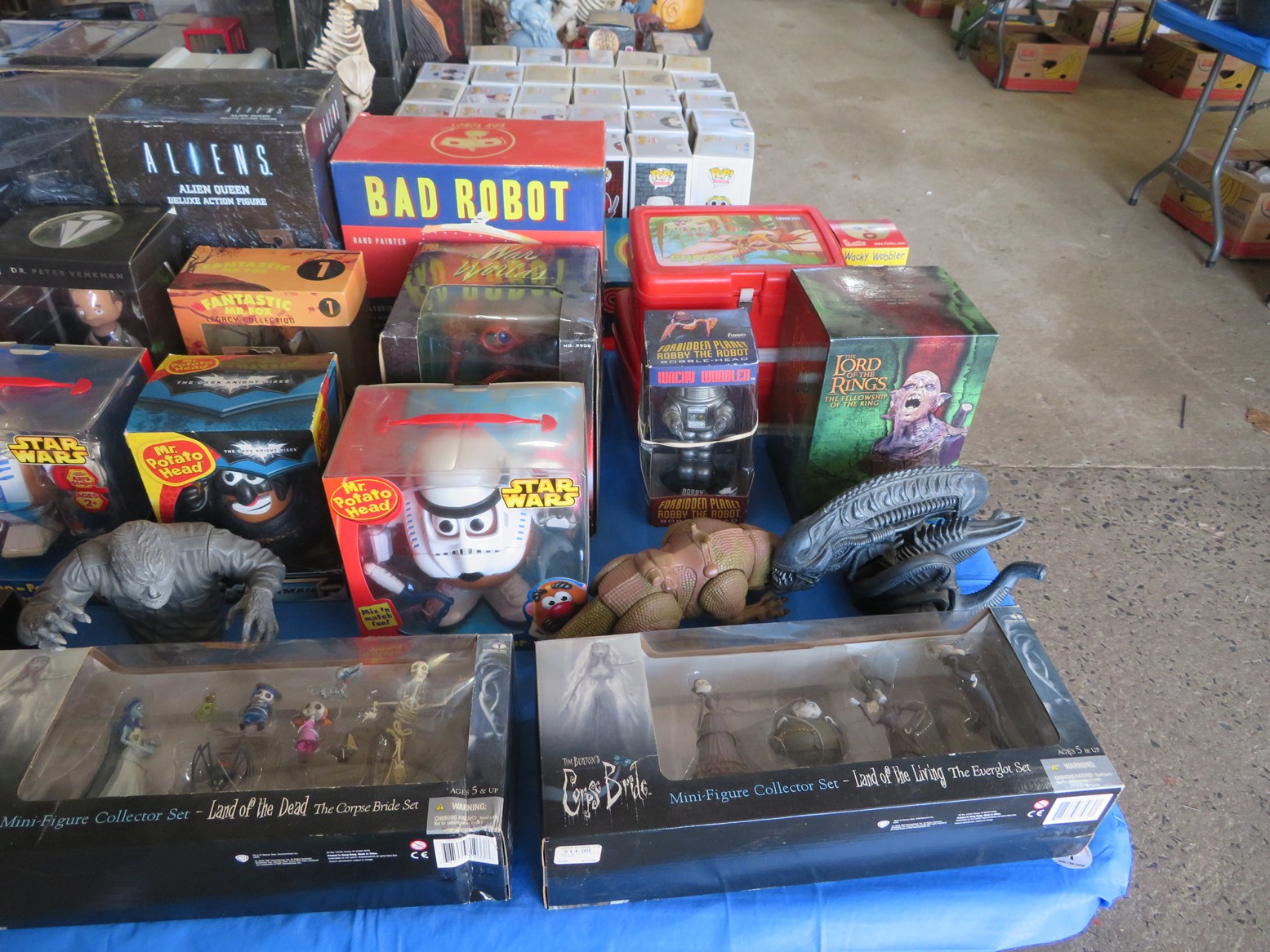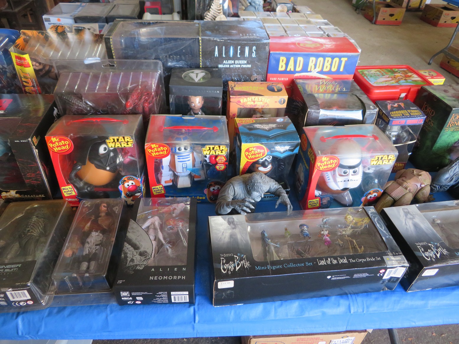 Table after table of CDs & DVDs – all genres, including Blu-Rays; LeCreuset dutch oven; Boxed toys & collectibles; Star Wars Mr. Potato Head; Bad Robot; Aliens; Tim Burton figurines; Scale model cars with inner & outer boxes; Stereoview & Much Much More!