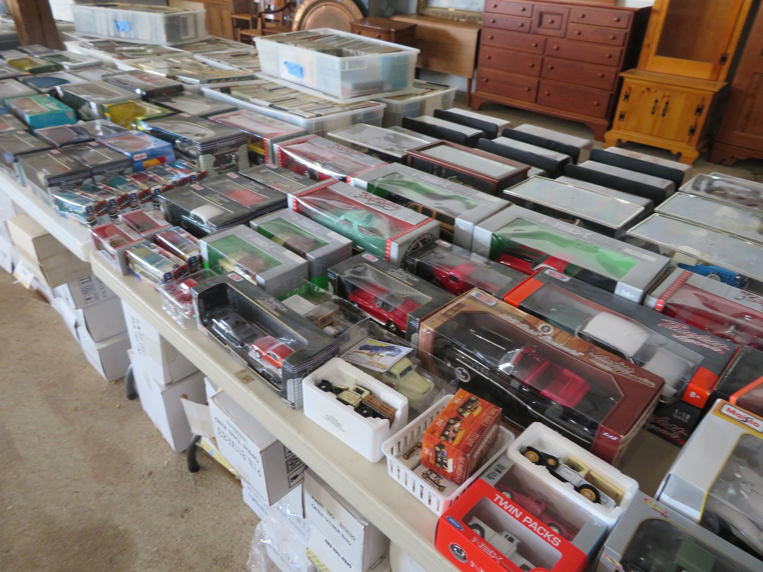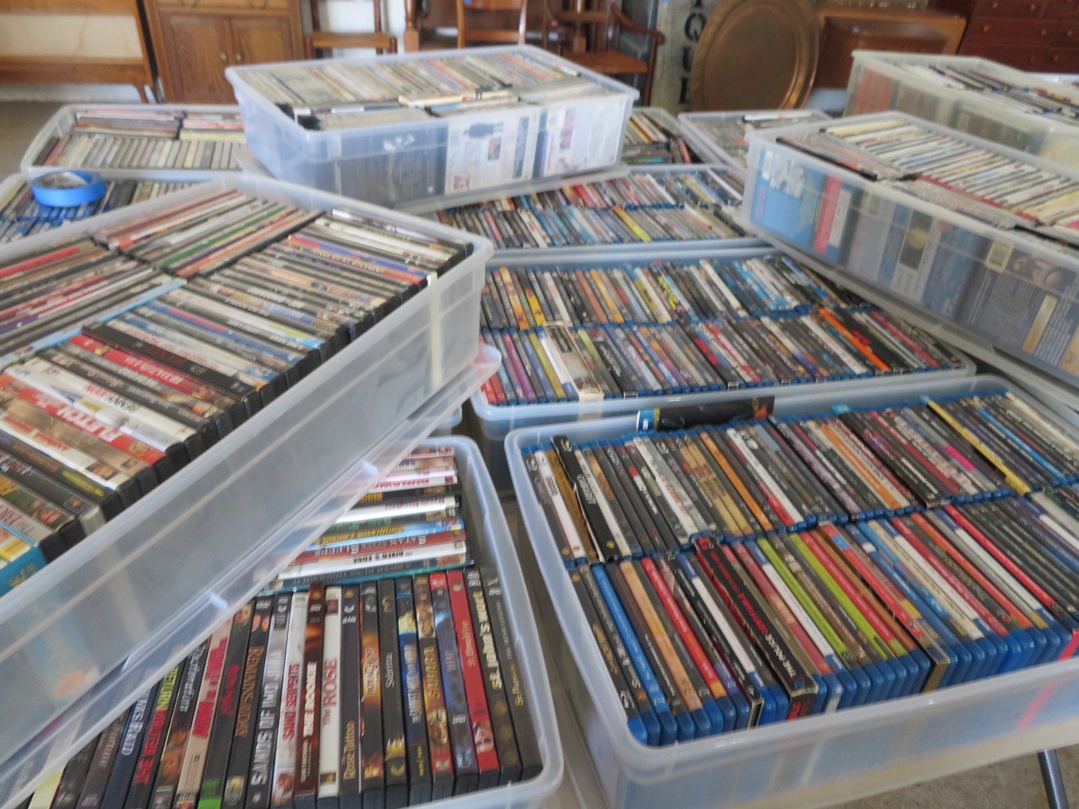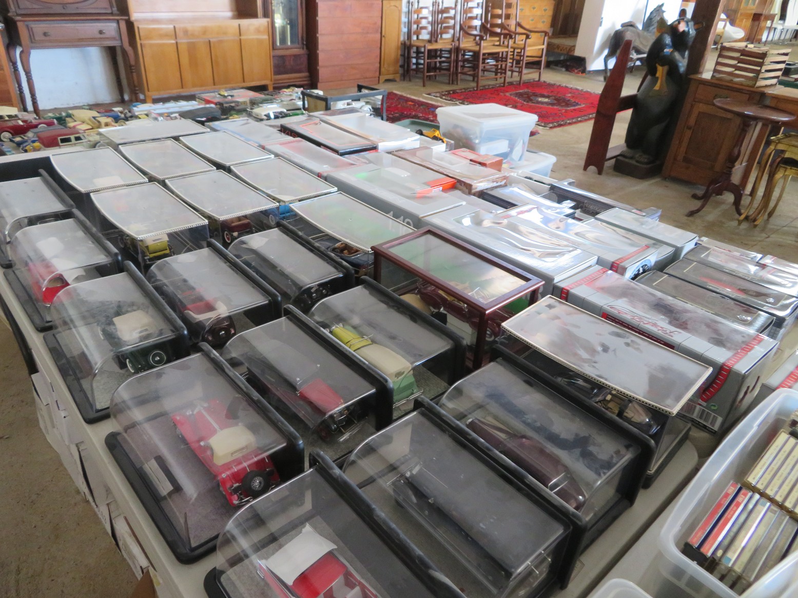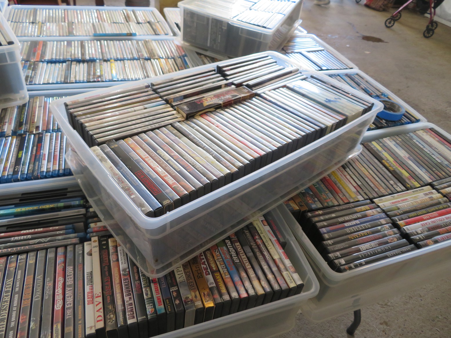 Table after table of CDs & DVDs – all genres, including Blu-Rays; LeCreuset dutch oven; Boxed toys & collectibles; Star Wars Mr. Potato Head; Bad Robot; Aliens; Tim Burton figurines; Scale model cars with inner & outer boxes; Stereoview & Much Much More!