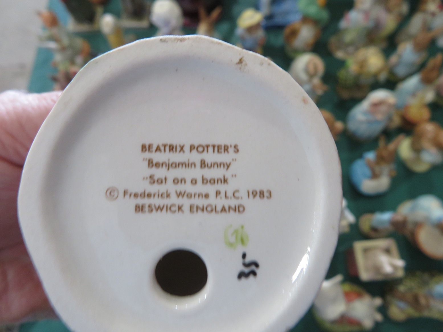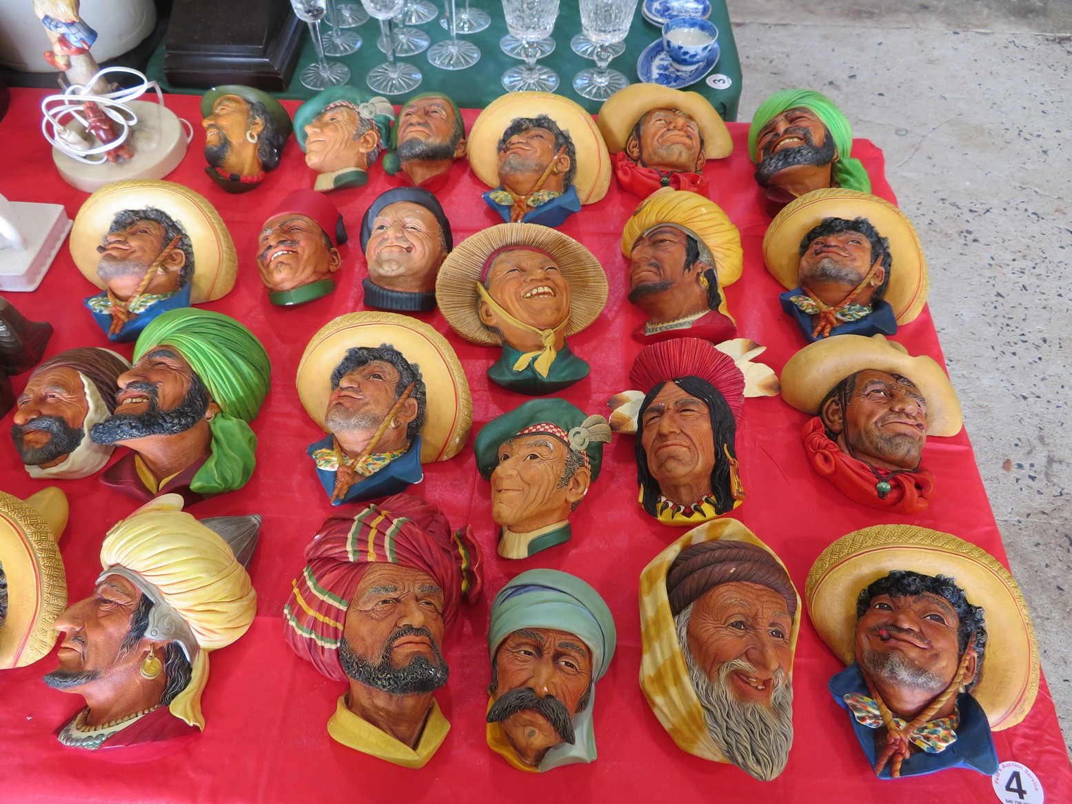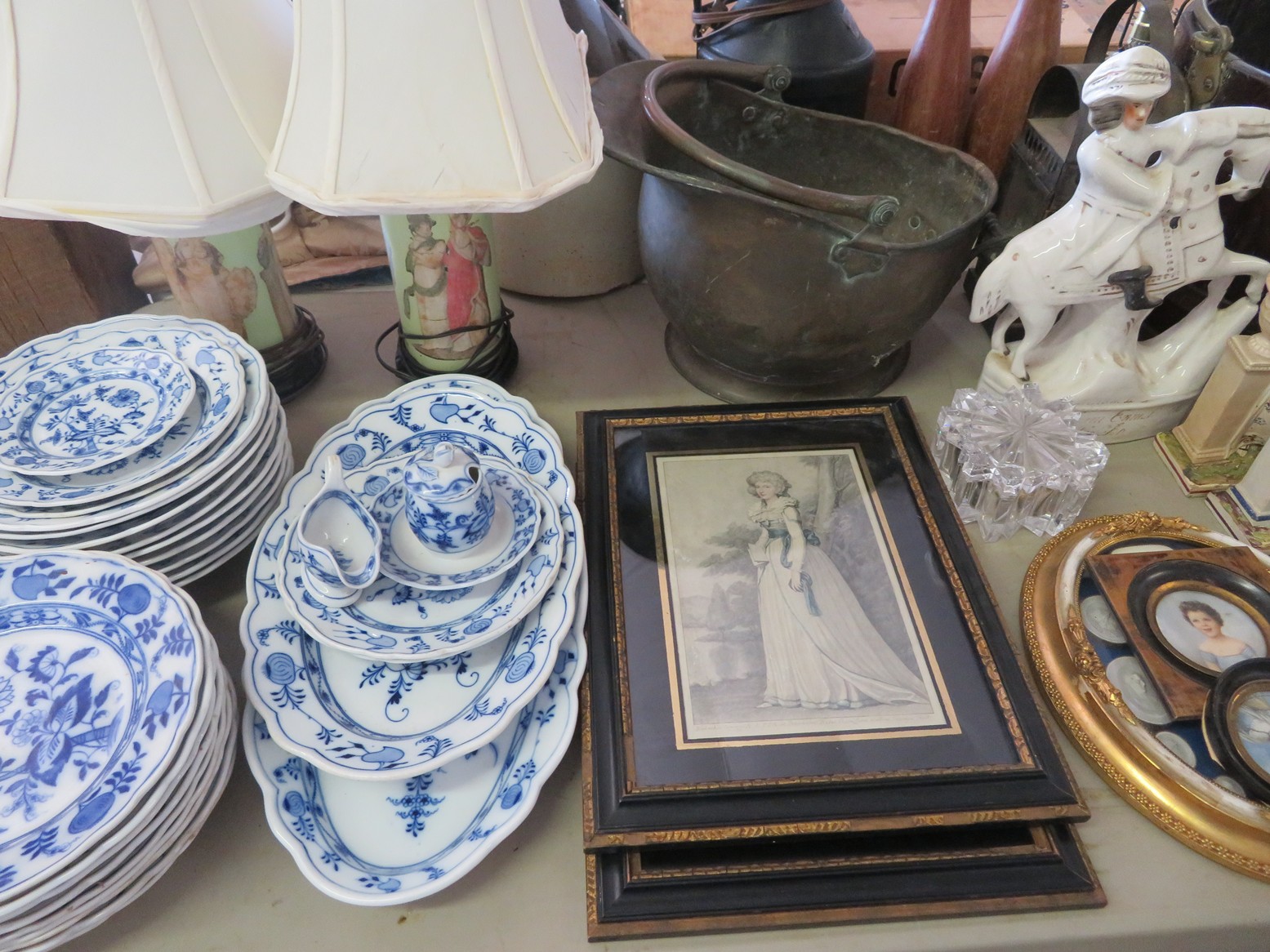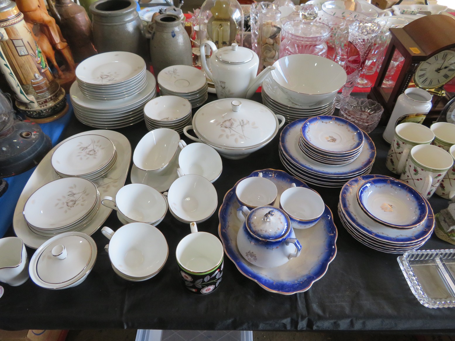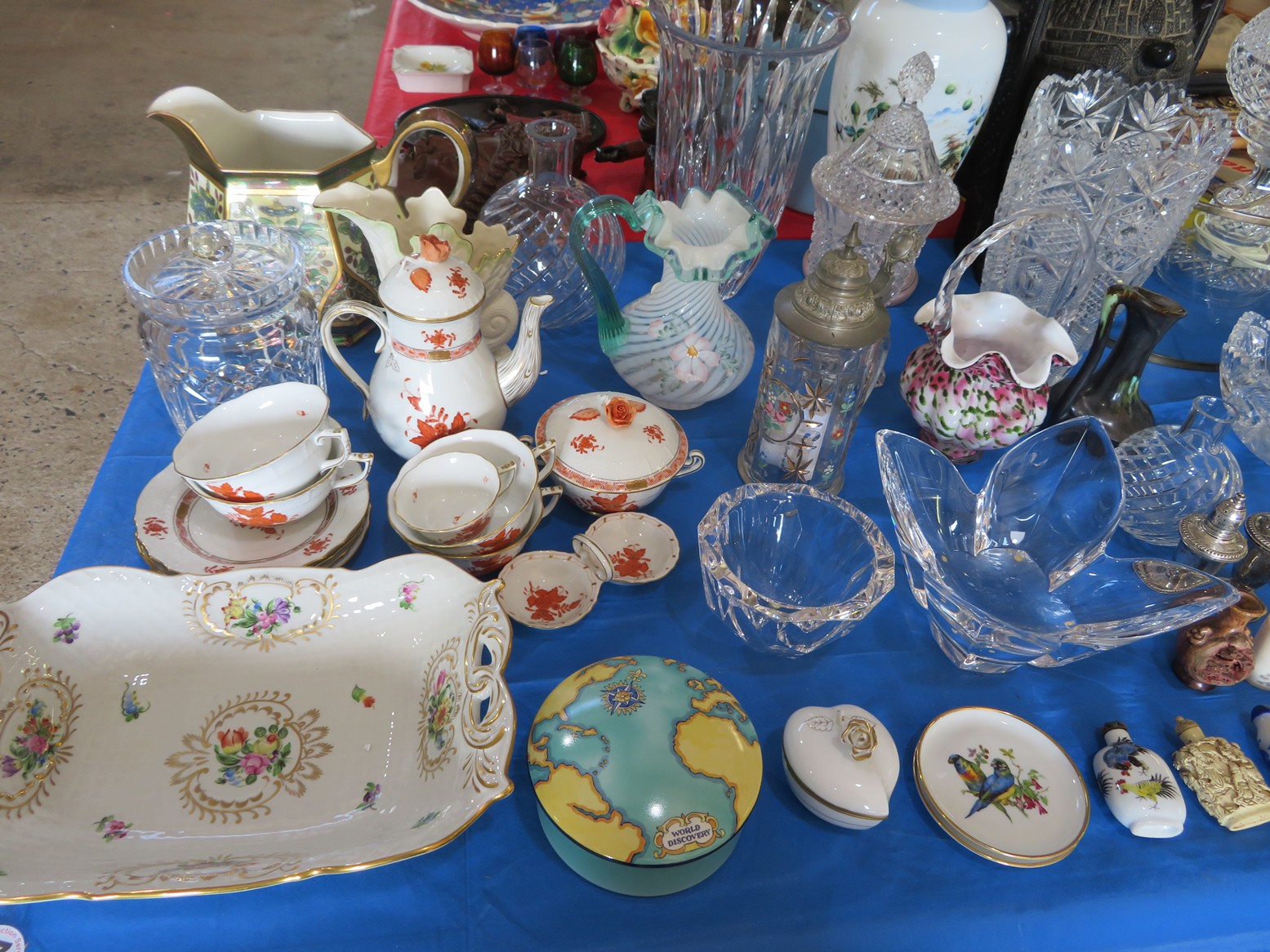 CHINA & GLASS: Herend Chinese Bouquet tea set; Roseville teapot; Collectible cup & saucer; Blue Onion china; Ceramic table lamps; Washbowl & pitcher set; Cake stand; MCM swan vase; Dinnerware sets; Covered tureen; Water pitcher; Large East Indian picture charger; Capodimonte floral basket; Ashtrays; Cream pitcher; 30+ Bossuns; Large blue spongeware dinnerware set including casseroles, flowerpots, ramekins, mixing bowl; plates, platters & more; Blue Willow; Hummels; Bells; Beswick figurines; Royal Albert figurines & more!