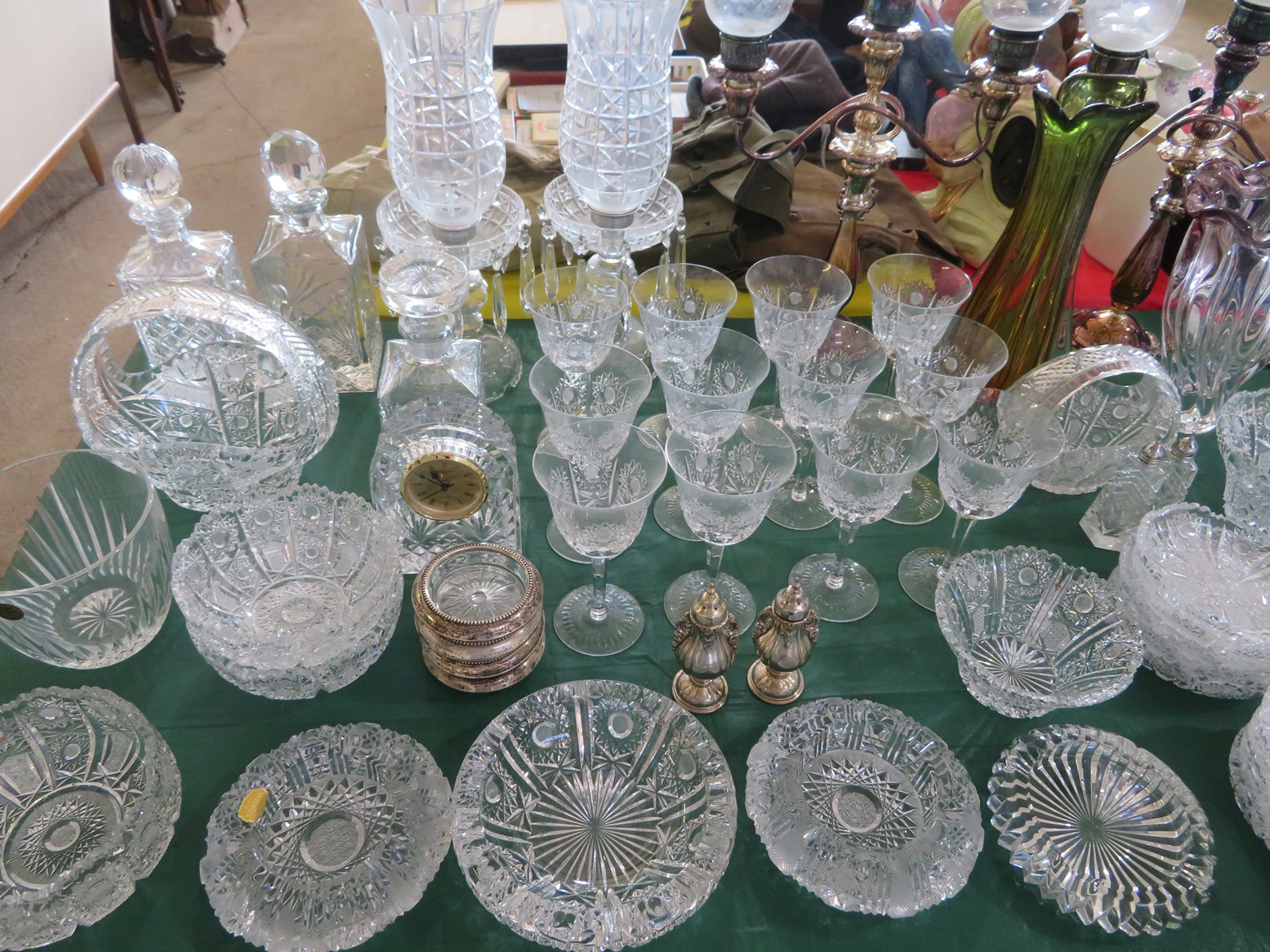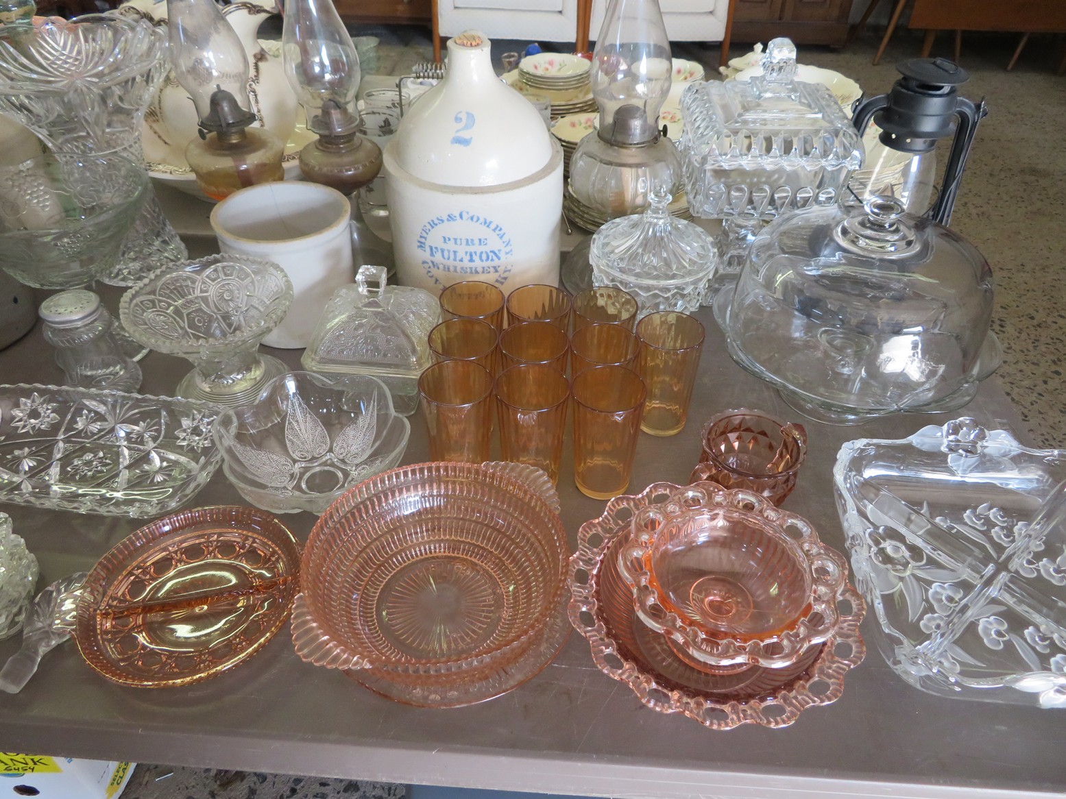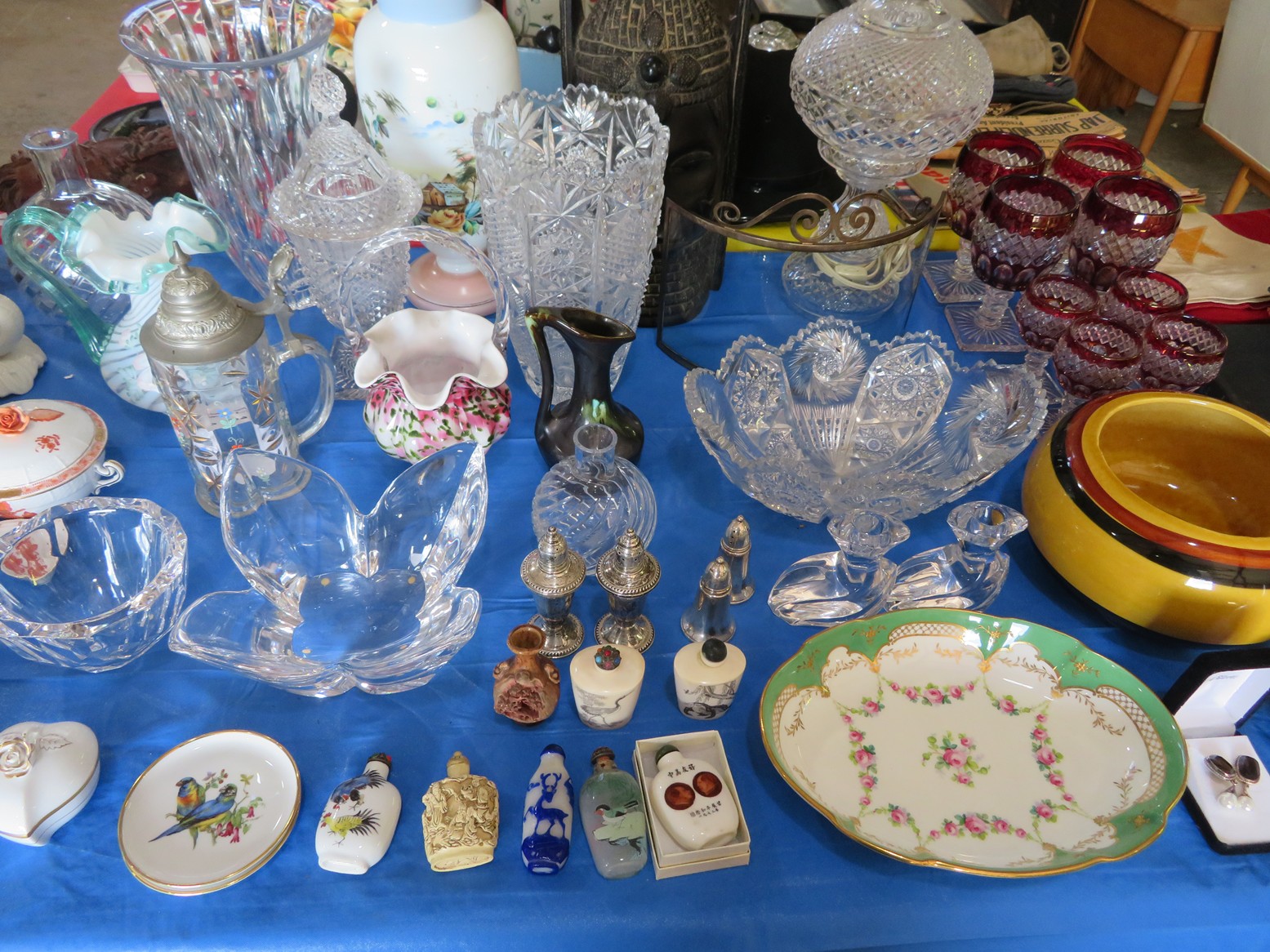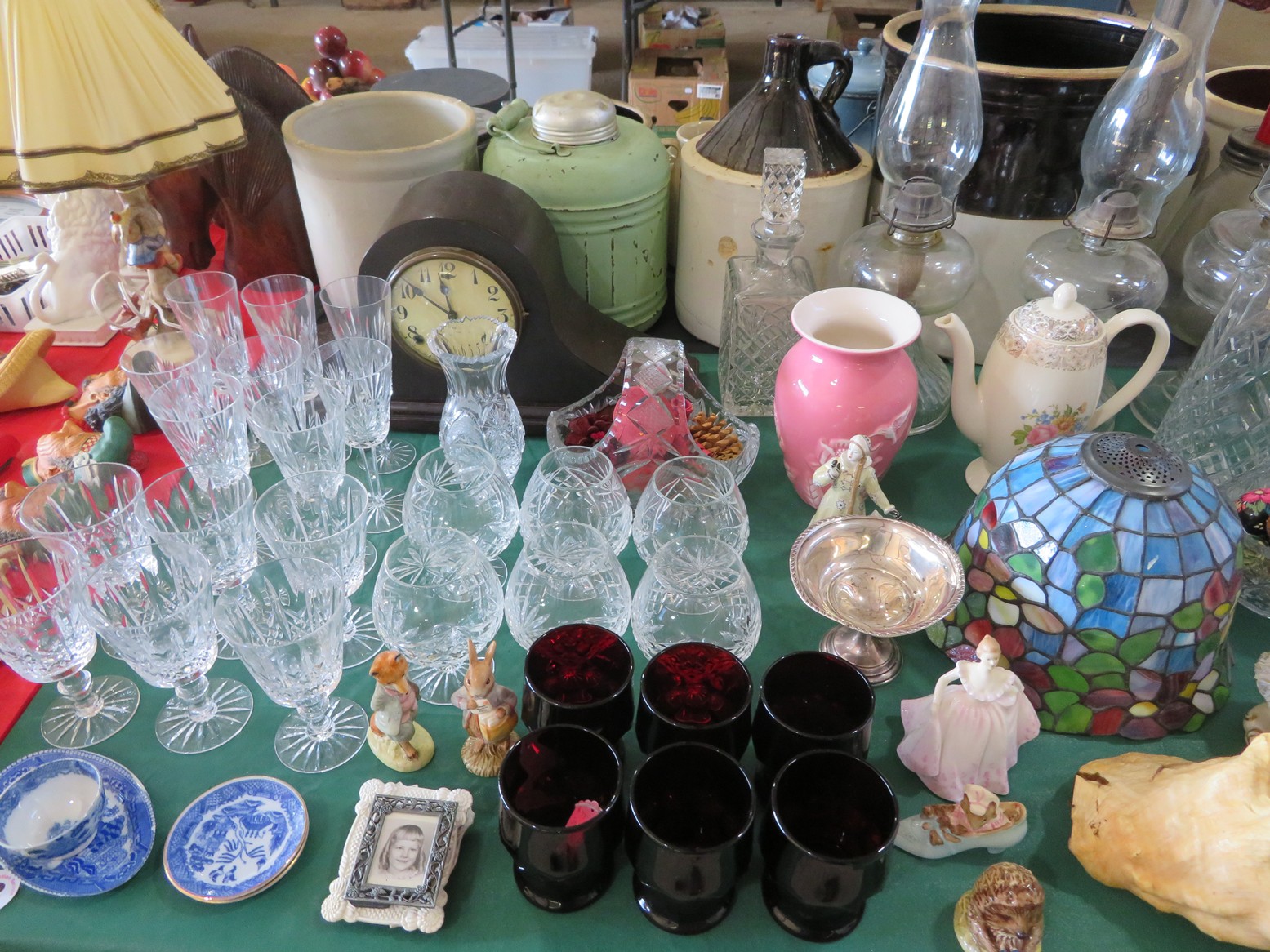 Lots of cut crystal-bowls, basket, goblets, plates, vases, ashtrays & more; Glass basket; Waterford; Clock; Hurricane; Biscuit jar; Candlesticks; Cut crystal; Oil lamps; Stemware sets; Large vases; Decanters; Art glass; Pyrex refrigerator dishes; Corning ware casseroles with lids; Pyrex measuring cups; Punch bowl & cups; Goofus glass platter & plates; Carnival glass bowl; Green depression; Set of leaf glasses in metal carrier; Cruet; Candy dish; Leaded glass hanging light shade; Cristal d’arques goblets in boxes; Ruby red tumblers; Blue rabbit on nest; Red cut to clear stag stein; Pink Depression & more!