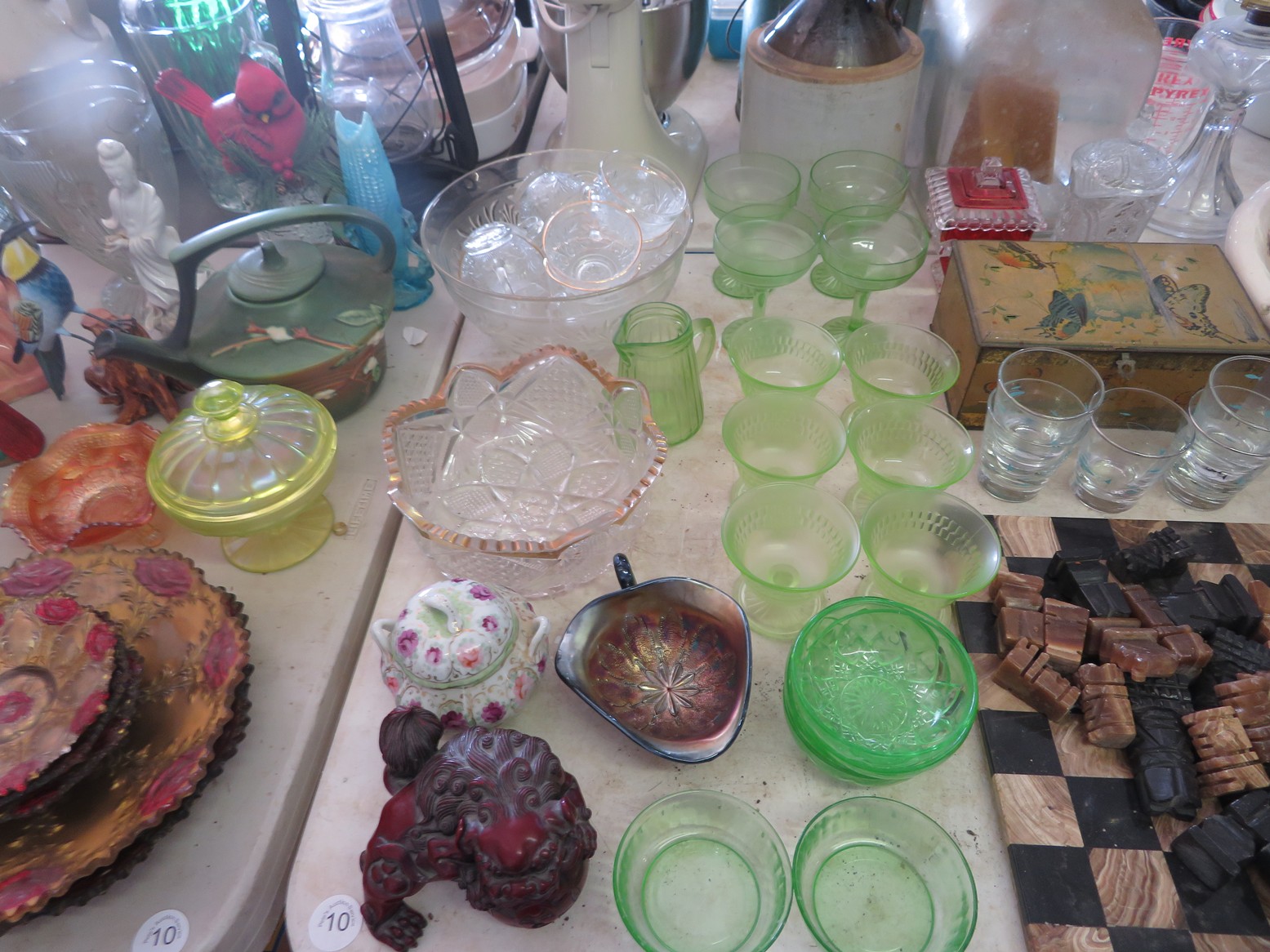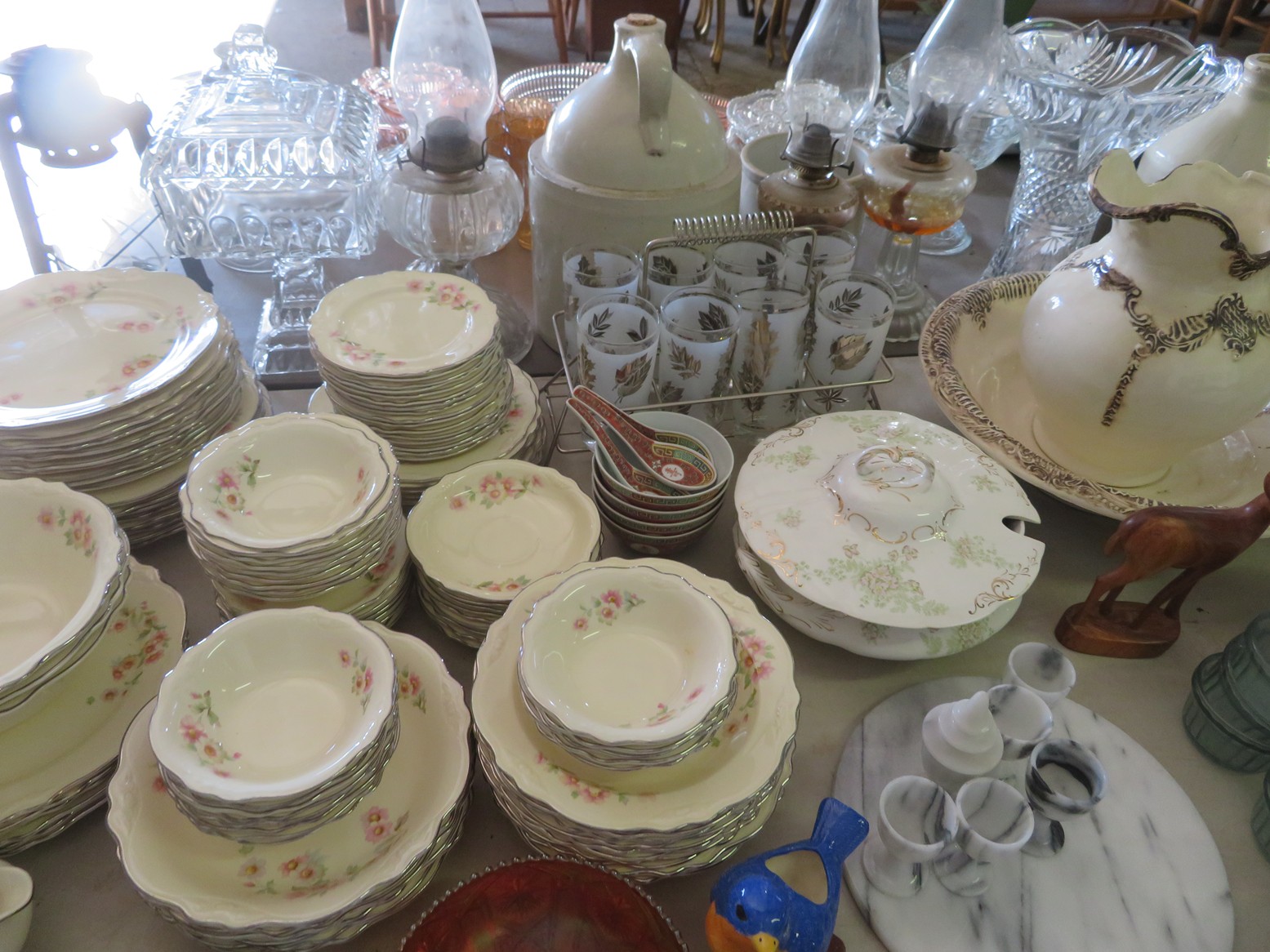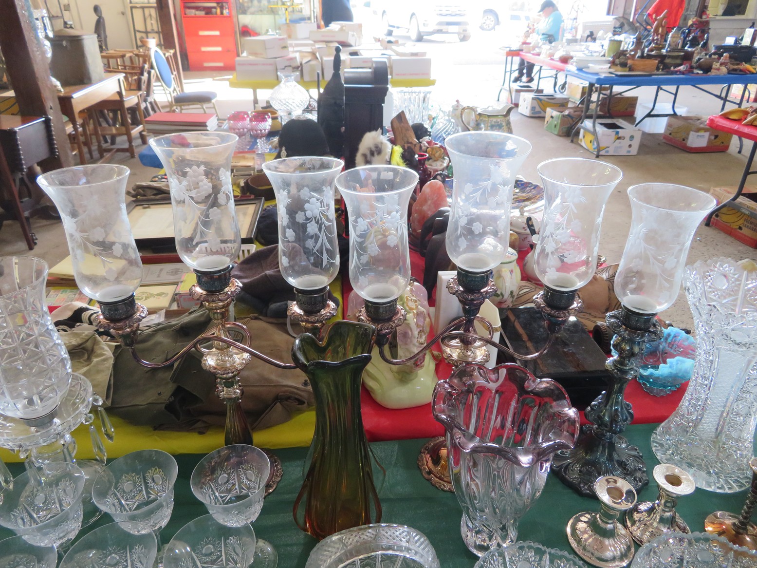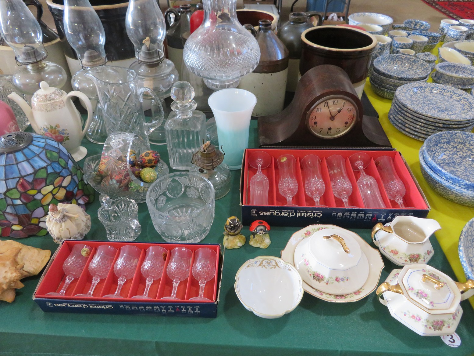 Lots of cut crystal-bowls, basket, goblets, plates, vases, ashtrays & more; Glass basket; Waterford; Clock; Hurricane; Biscuit jar; Candlesticks; Cut crystal; Oil lamps; Stemware sets; Large vases; Decanters; Art glass; Pyrex refrigerator dishes; Corning ware casseroles with lids; Pyrex measuring cups; Punch bowl & cups; Goofus glass platter & plates; Carnival glass bowl; Green depression; Set of leaf glasses in metal carrier; Cruet; Candy dish; Leaded glass hanging light shade; Cristal d’arques goblets in boxes; Ruby red tumblers; Blue rabbit on nest; Red cut to clear stag stein; Pink Depression & more!