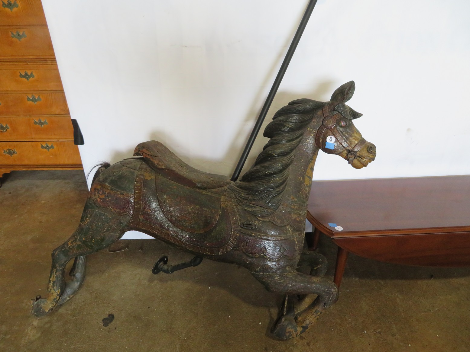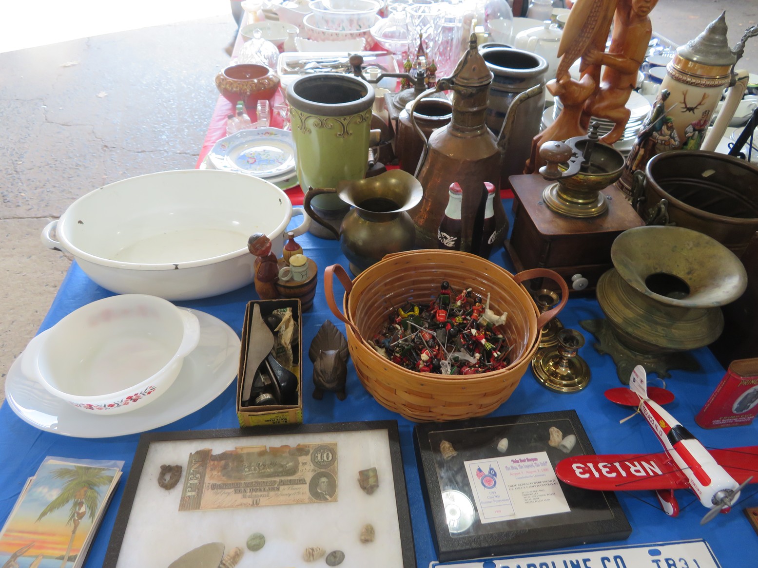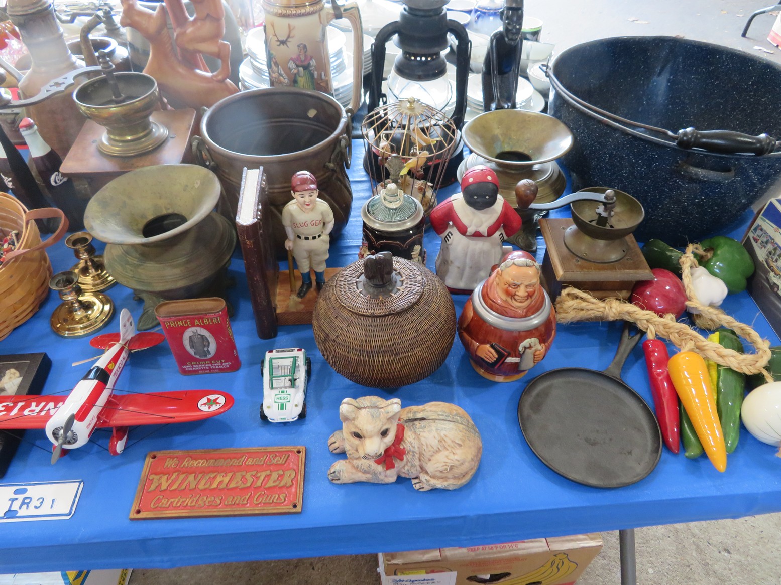 Old, full size carousel pony with support pole; Snuff bottles; Old metal gas can; Old kid’s trike; Honing wheel; Long handled tools; Fruit crates; Galvanized wash tub; Shop heater; Galvanized mop bucket with wringer; Fire mark; Salt lamp; Faux grapes; Old car horn; Coffee grinders; Tabletop churn; Wooden bobbins; Rolling pin; Glass sugar canister; Spittoon; Metal soldiers; Plane model; Civil War currency & buttons in frame; Old shaving plane; Copper ewer; Bookends; Cast iron griddle; Still bank;