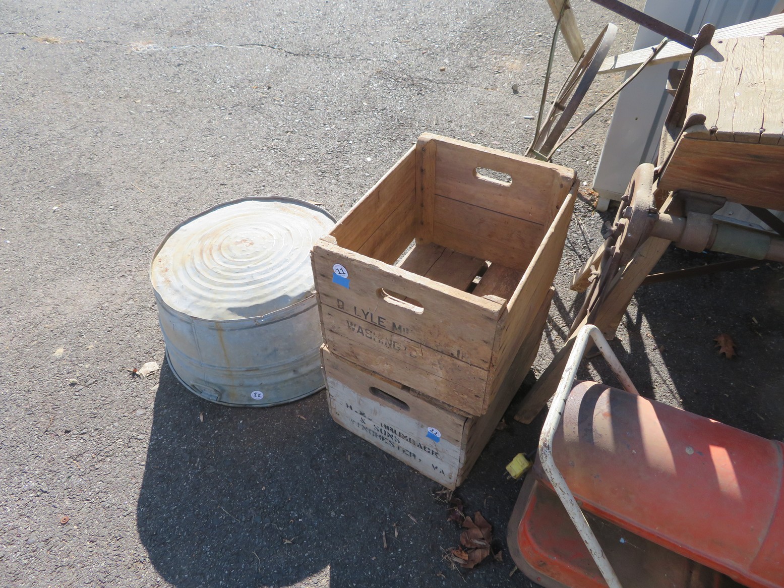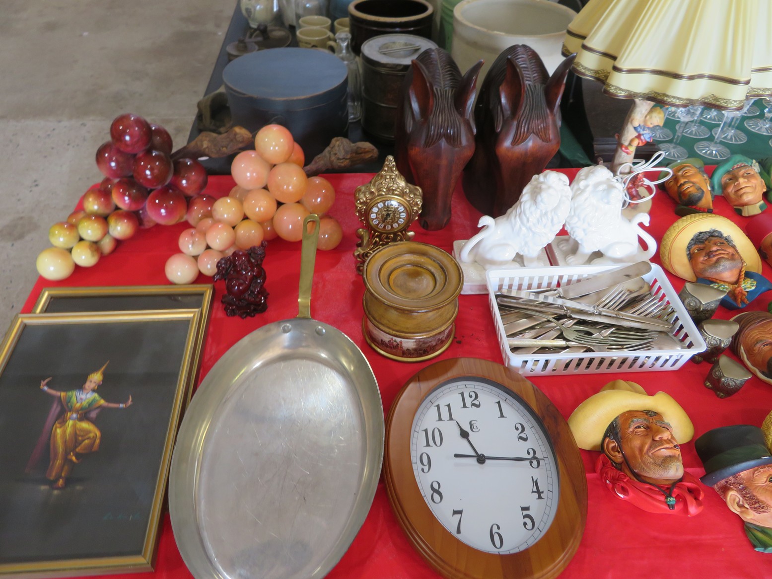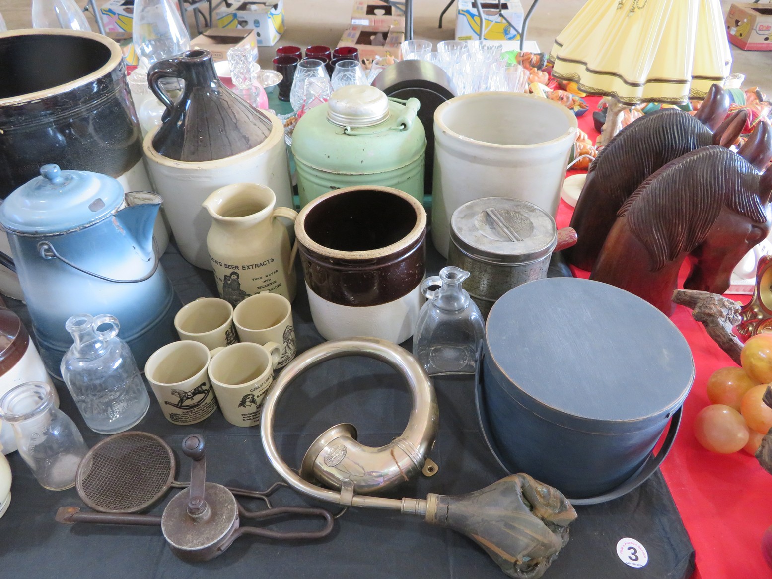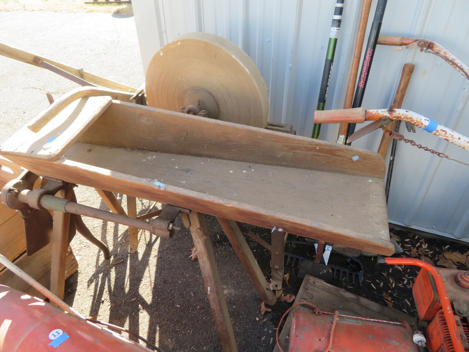 Old, full size carousel pony with support pole; Snuff bottles; Old metal gas can; Old kid’s trike; Honing wheel; Long handled tools; Fruit crates; Galvanized wash tub; Shop heater; Galvanized mop bucket with wringer; Fire mark; Salt lamp; Faux grapes; Old car horn; Coffee grinders; Tabletop churn; Wooden bobbins; Rolling pin; Glass sugar canister; Spittoon; Metal soldiers; Plane model; Civil War currency & buttons in frame; Old shaving plane; Copper ewer; Bookends; Cast iron griddle; Still bank;