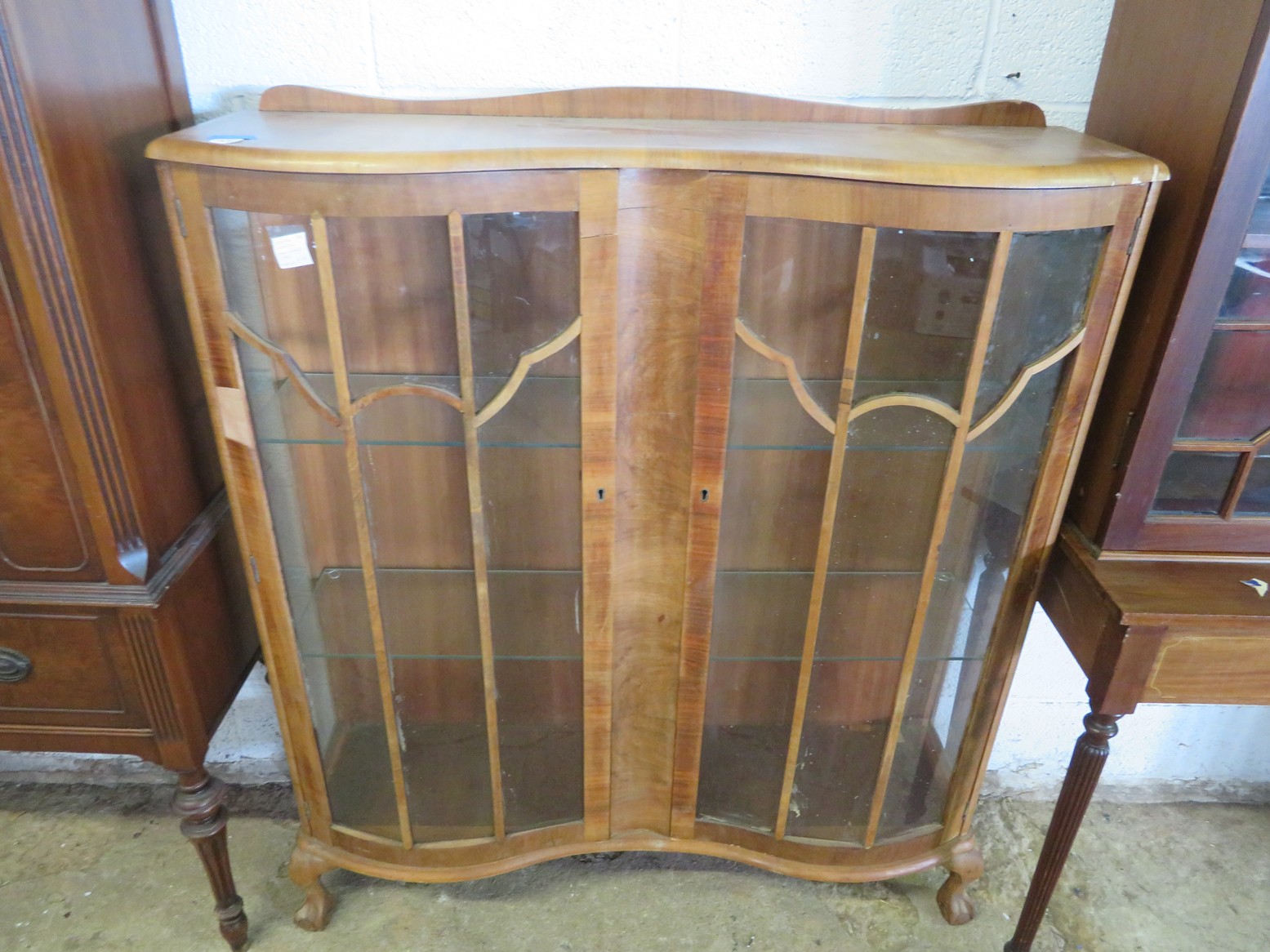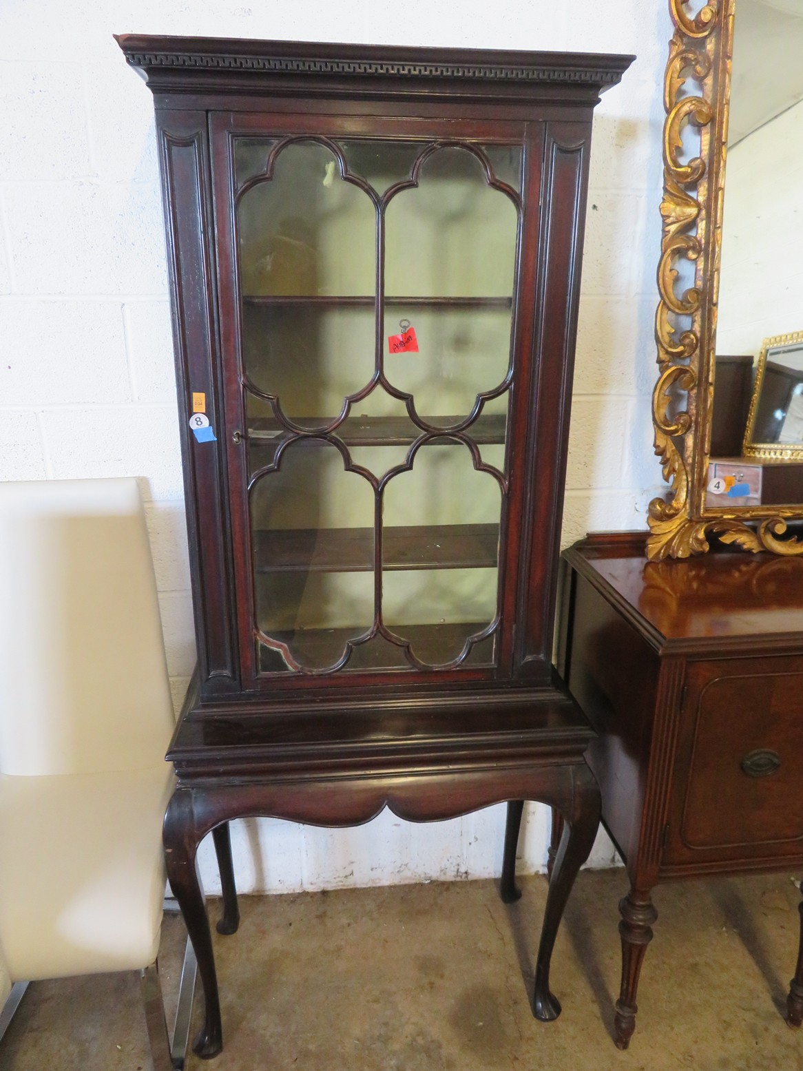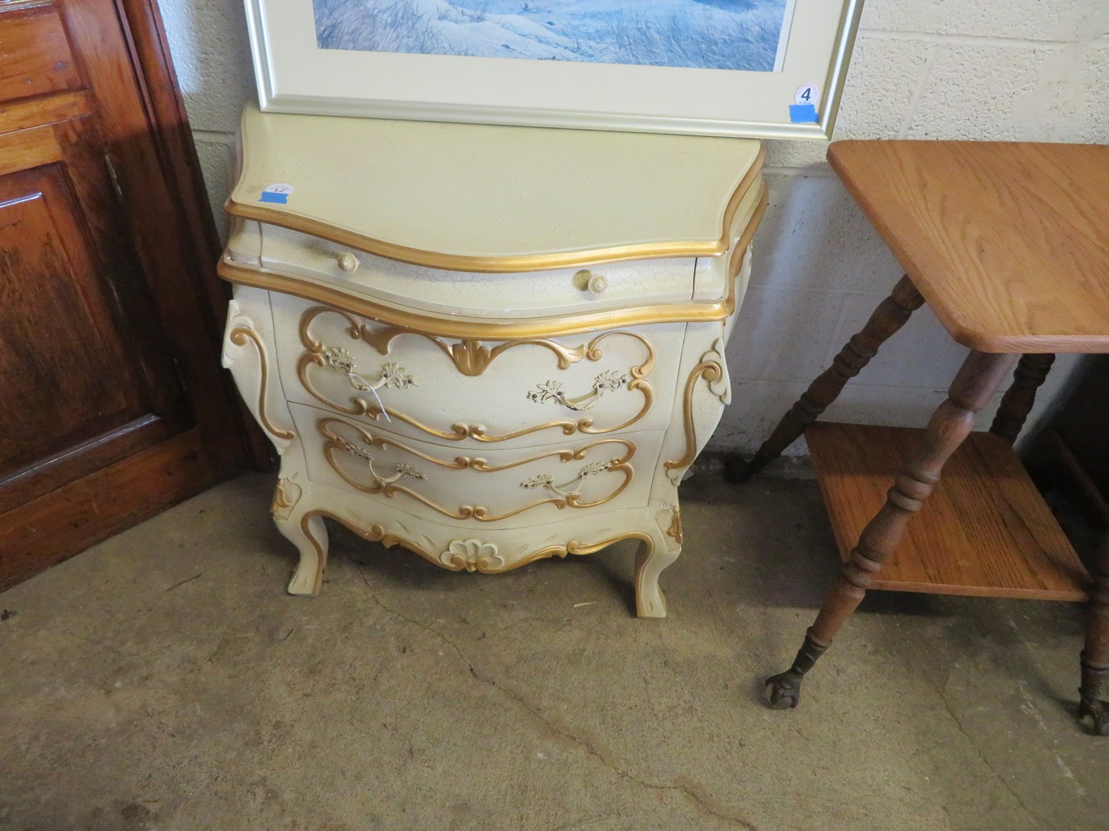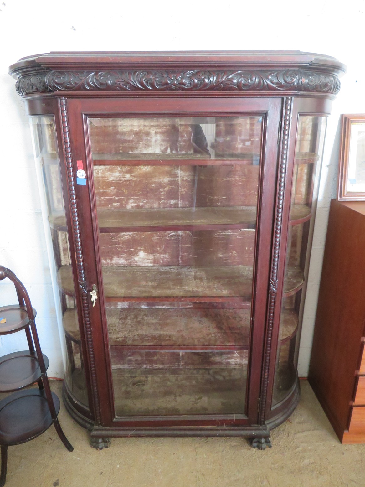 FURNISHINGS: Wonderful old punched tin pie safe over drawer & double door cabinet; Fantastic mirror back buffet, marble top & super fancy carving; Gold painted vitrine with glass shelves; Drop front secretary; Impressive bowfront china with paw feet and carved top panel; Table with sunburst inlay top; Grandfather clock in rectangular case; Nicely carved gaming table; Set of chrome & upholstery dining chair; Display cabinet on cabriole legs; Beautiful corner cabinet; White & gold bombe’ cabinet; Victorian table with claw & glass ball feet; Double bowfront curio cabinet; Waterfall dresser;