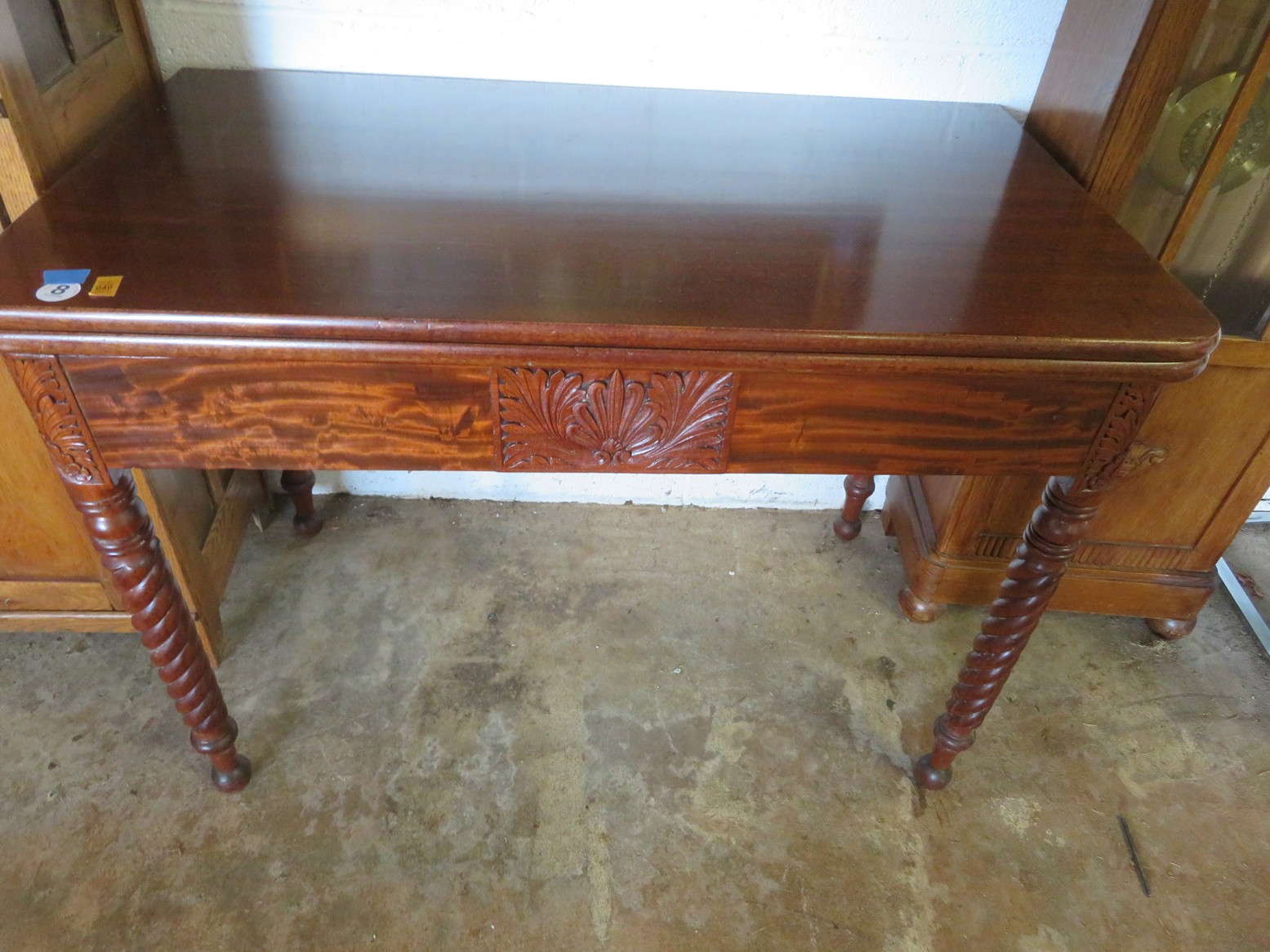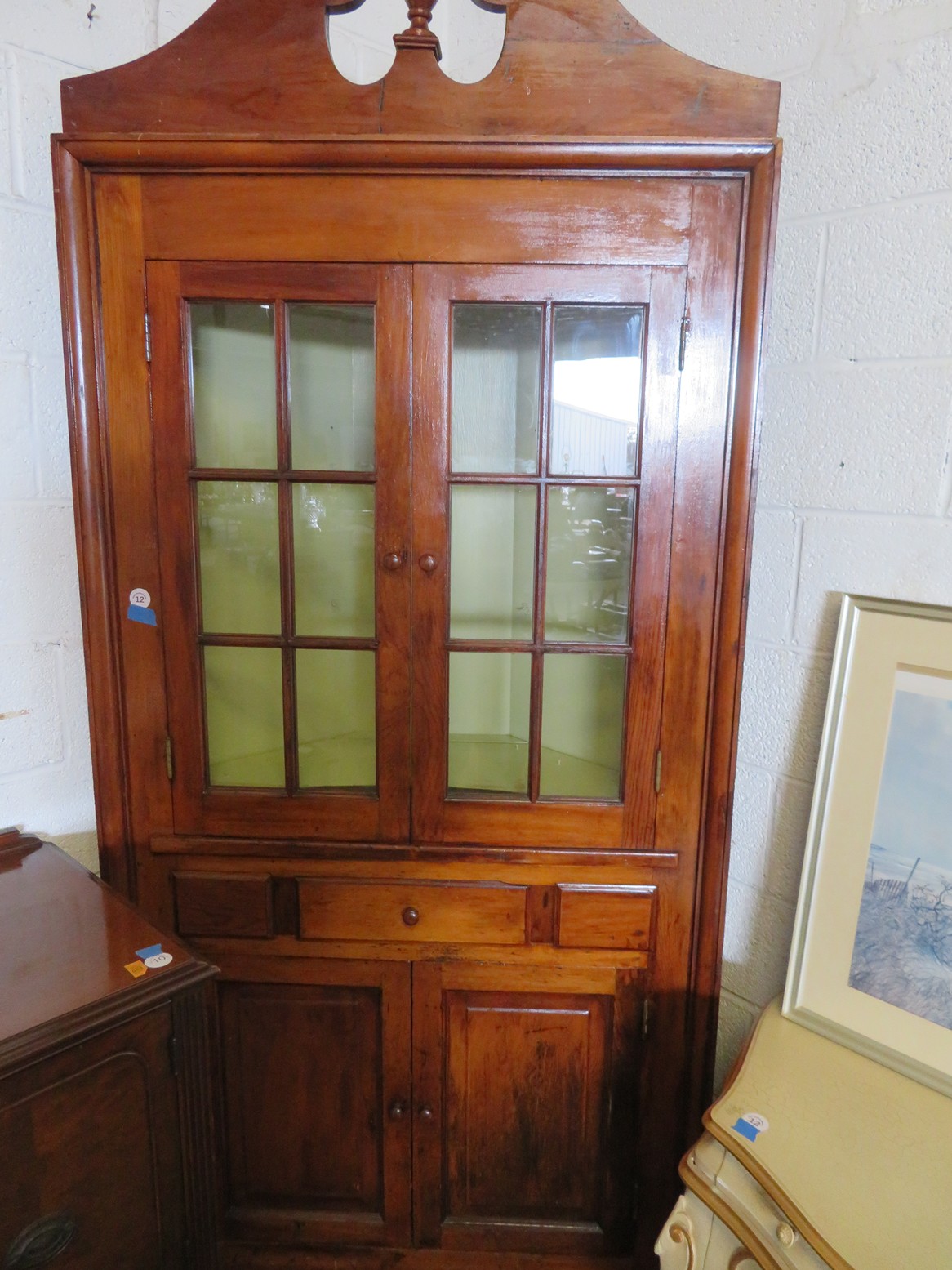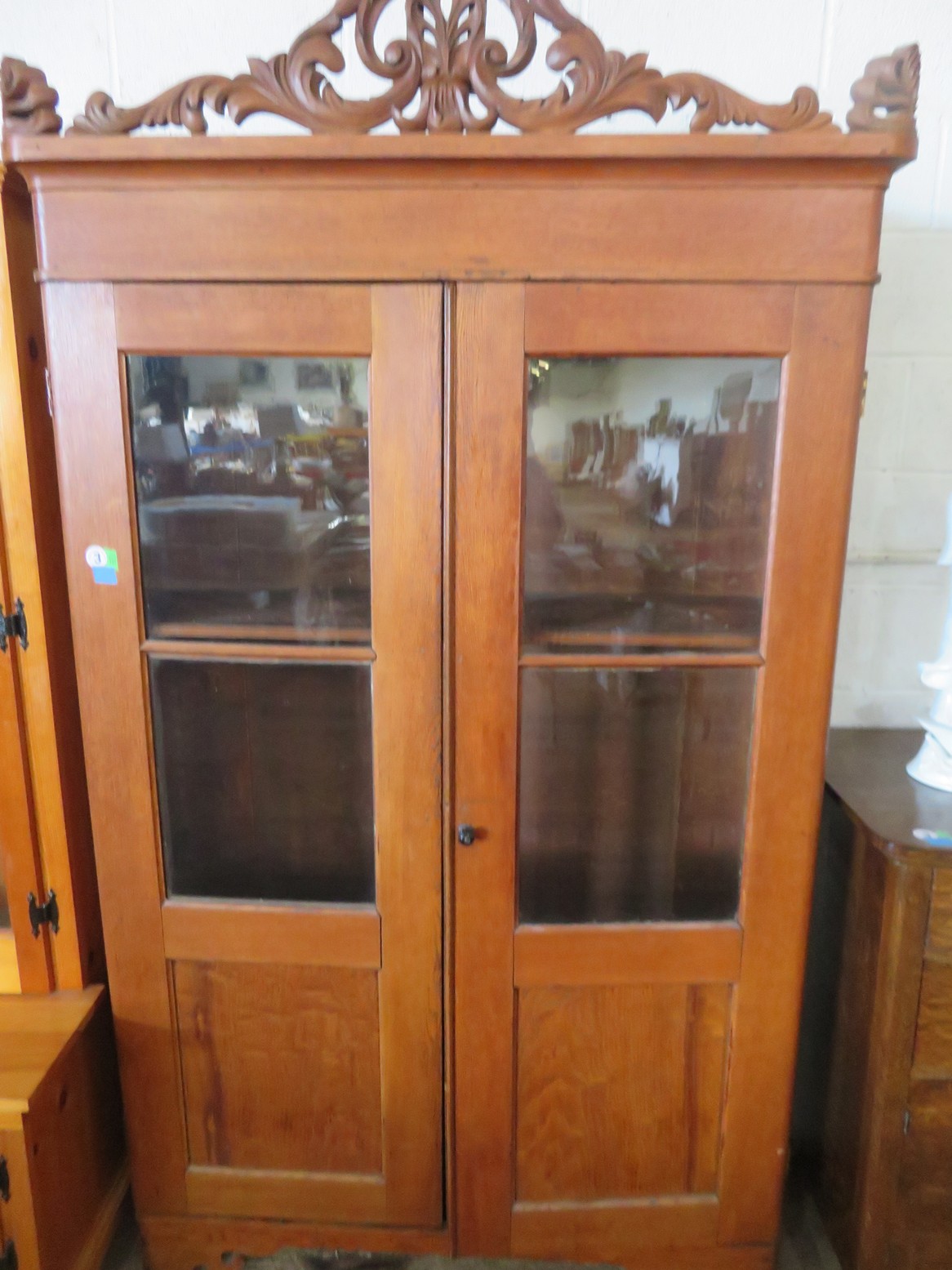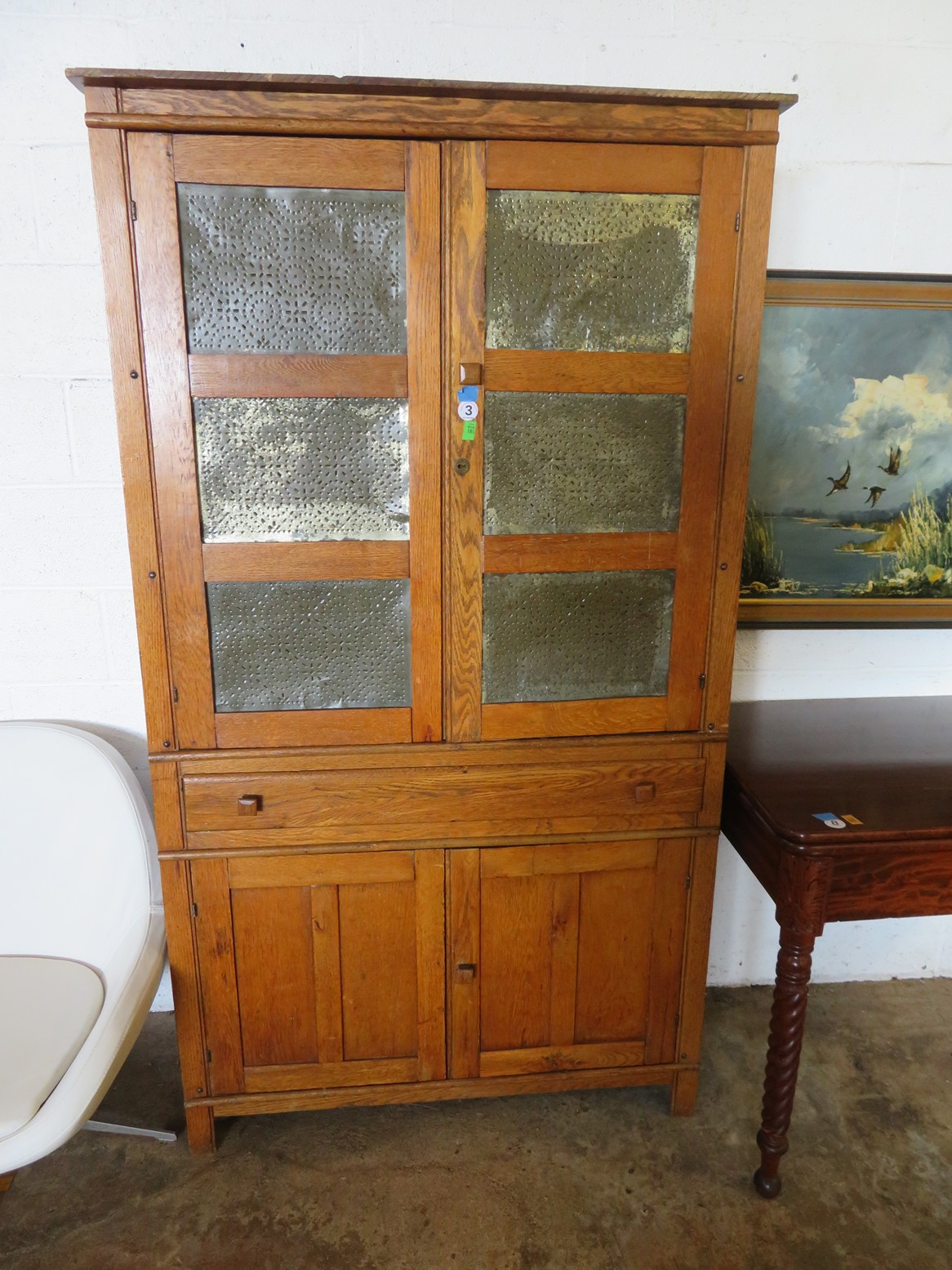 FURNISHINGS: Wonderful old punched tin pie safe over drawer & double door cabinet; Fantastic mirror back buffet, marble top & super fancy carving; Gold painted vitrine with glass shelves; Drop front secretary; Impressive bowfront china with paw feet and carved top panel; Table with sunburst inlay top; Grandfather clock in rectangular case; Nicely carved gaming table; Set of chrome & upholstery dining chair; Display cabinet on cabriole legs; Beautiful corner cabinet; White & gold bombe’ cabinet; Victorian table with claw & glass ball feet; Double bowfront curio cabinet; Waterfall dresser;