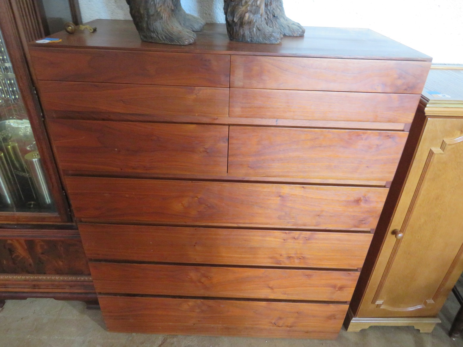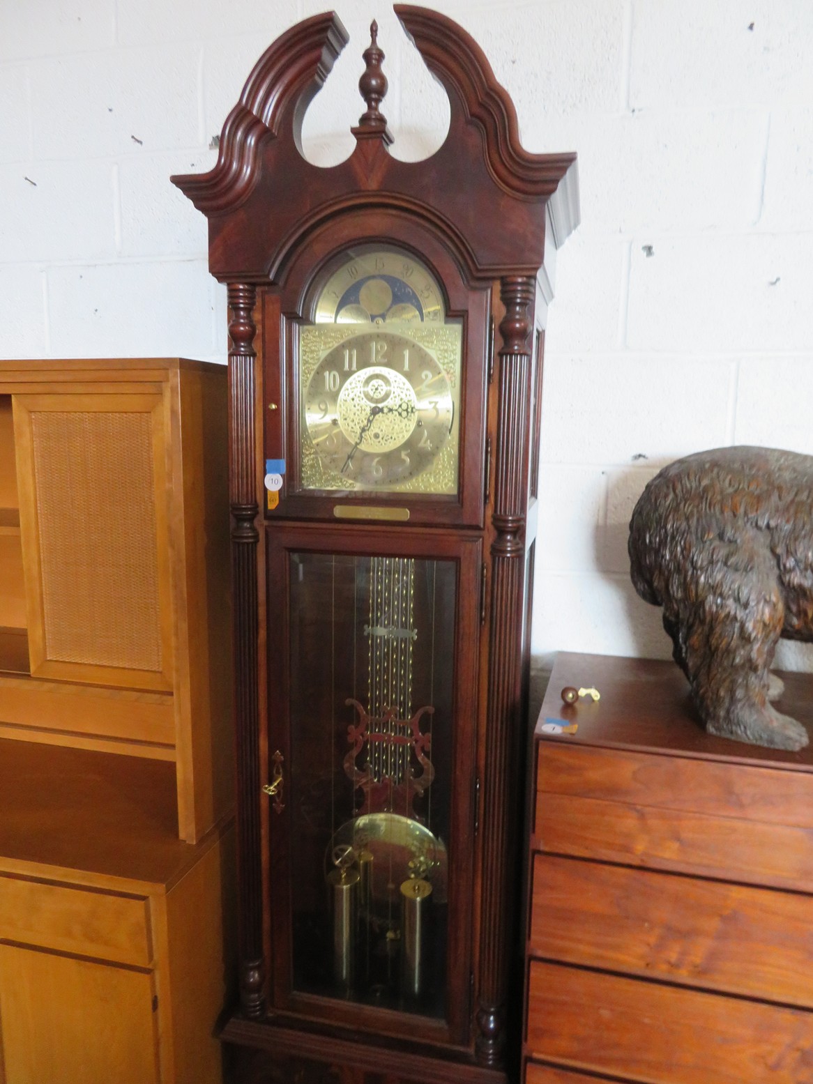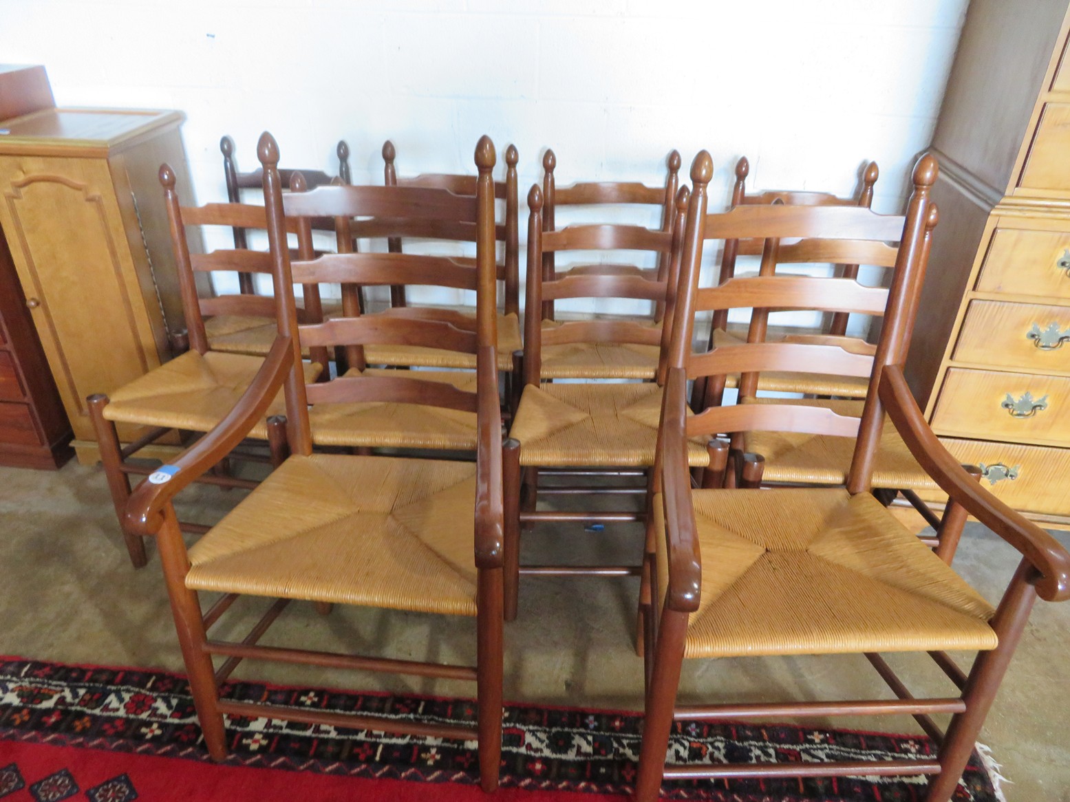 Set of 10 Clore chairs (2 arm); Clore Acorn post beds; Clore side chairs; Clore armchair; Leather massage chair; Lexington chest of drawers; Tall chest on chest; 1 door cabinet; Grandfather clock with visible pendulum; Hoosier with white enamel worktop; 3 level plate/tray server; Round display table; Dropleaf dining table; 2 drawer end table; Hanging bookshelf; Chairside magazine rack; Porch rocker with cushions; Live edge tripod stool; Rocking chair; End table; Lounge chair; Long bench;