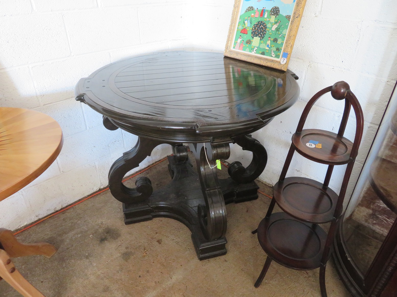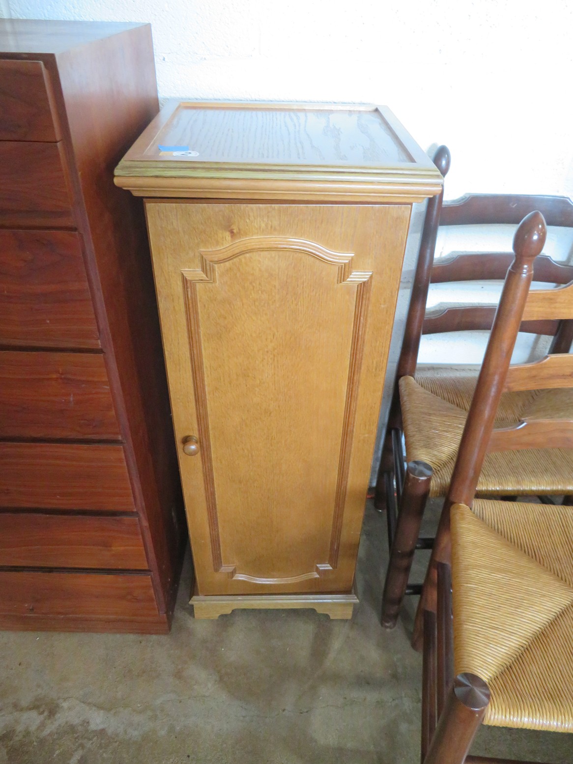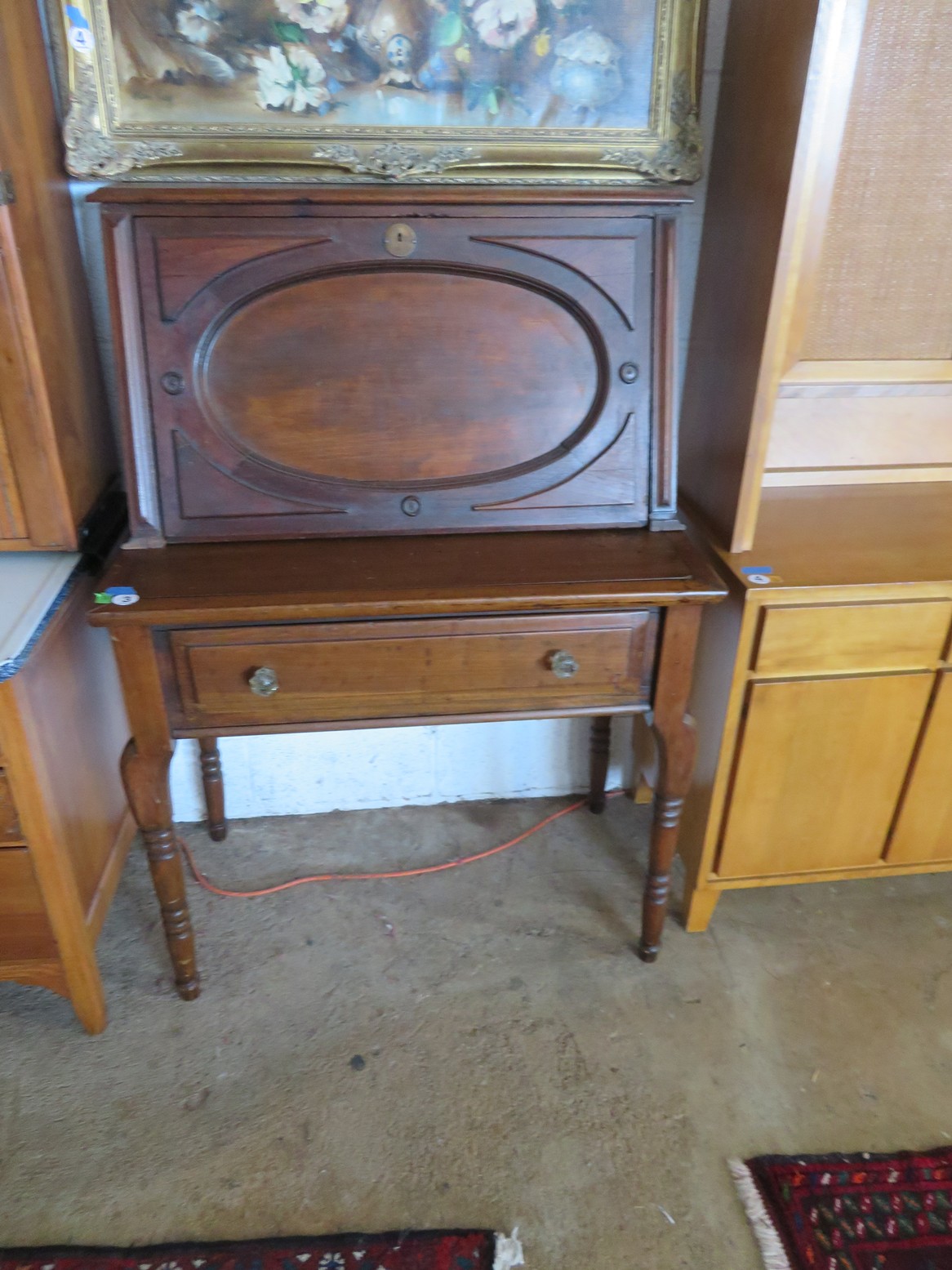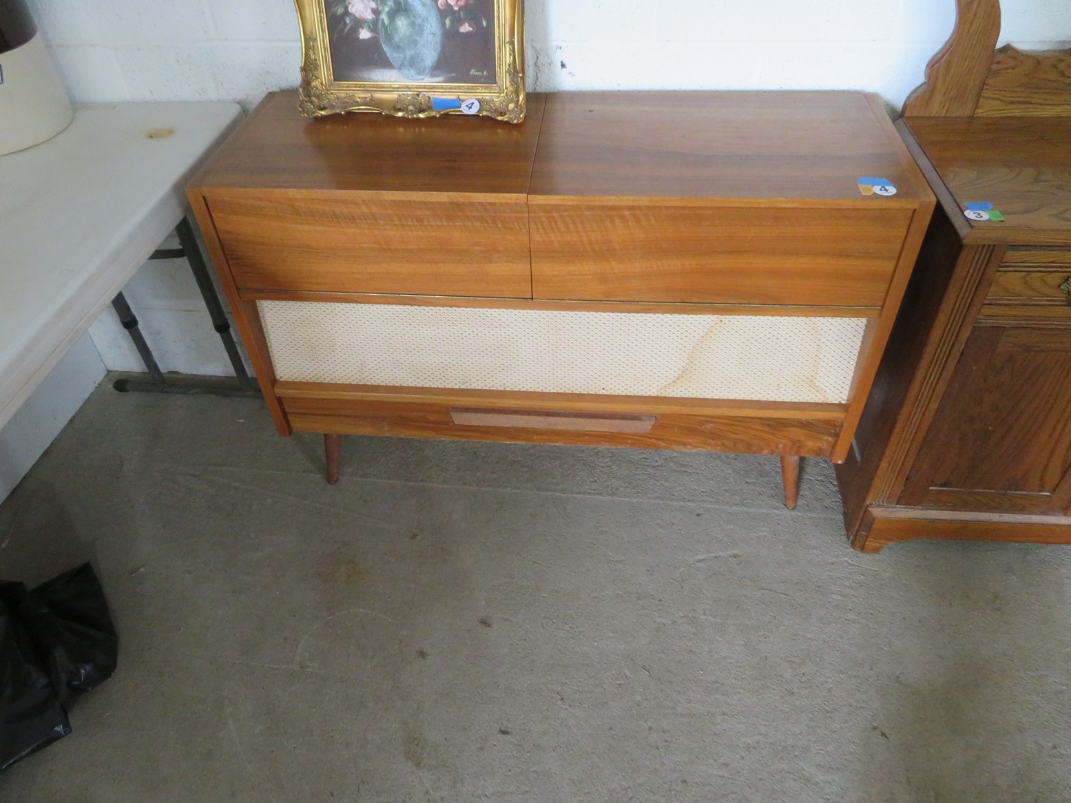 Great MCM furniture-Buffet with open hutch top & pair of woven panel doors marked Conani Ball Furniture Makers, Stereo cabinet with Telefunken record player, Iconic ceramic lamp, Sofa, 2 level table, White chair, Gentleman’s valet chair, Nightstand, End & coffee table set; Tall dresser, Chest of drawers; Buffets; Marble top table; Padded bench; Drop side coffee table; China cabinet with carved crest; Gun cabinet with glass door; Oak washstand with towel bar; Piecrust edge plant stand; Pedestal drum table;