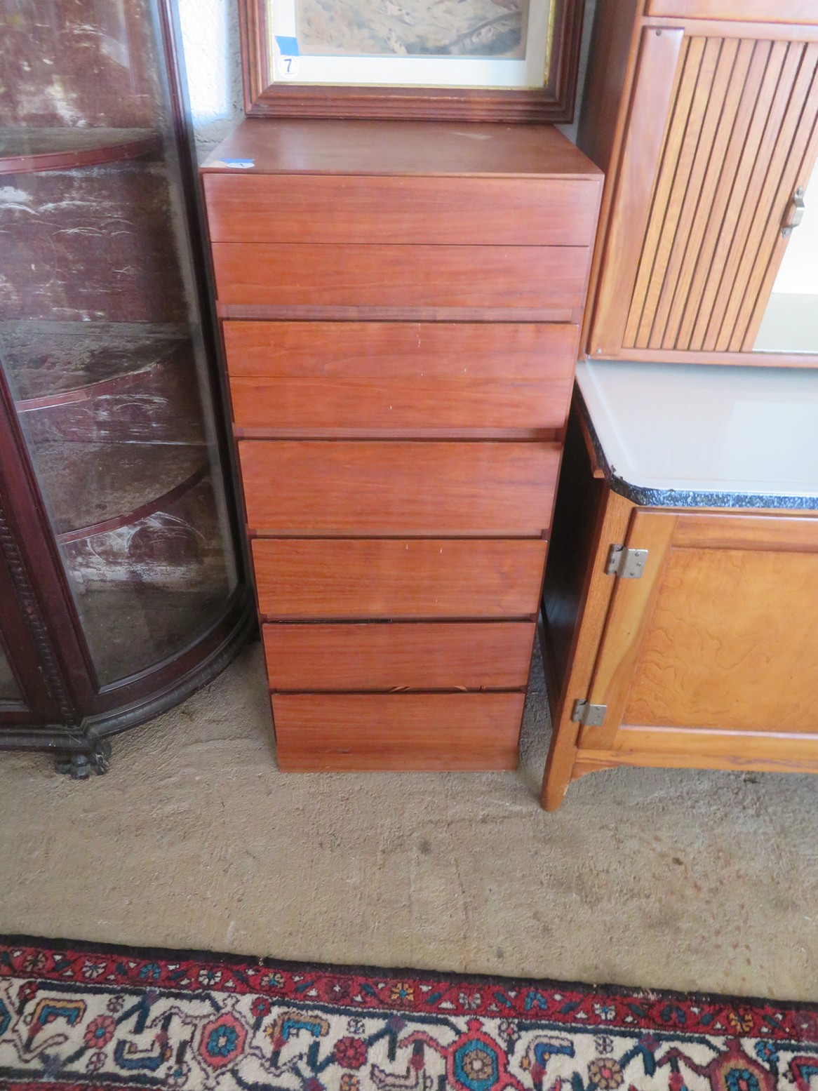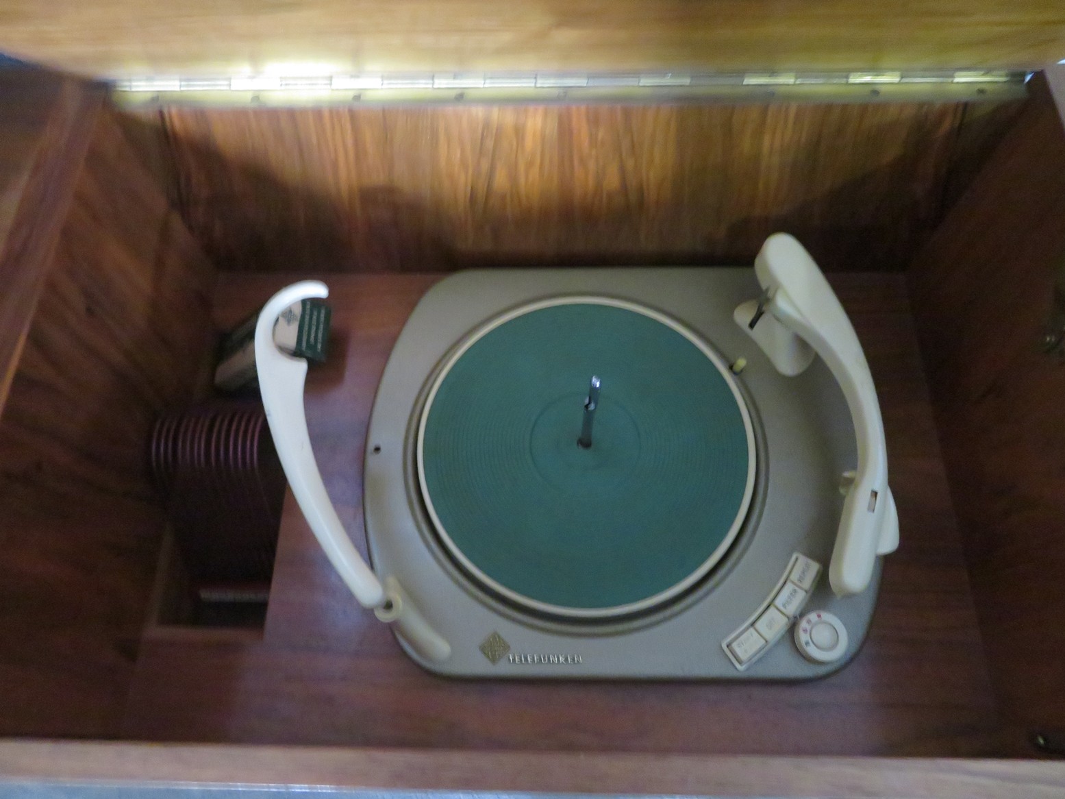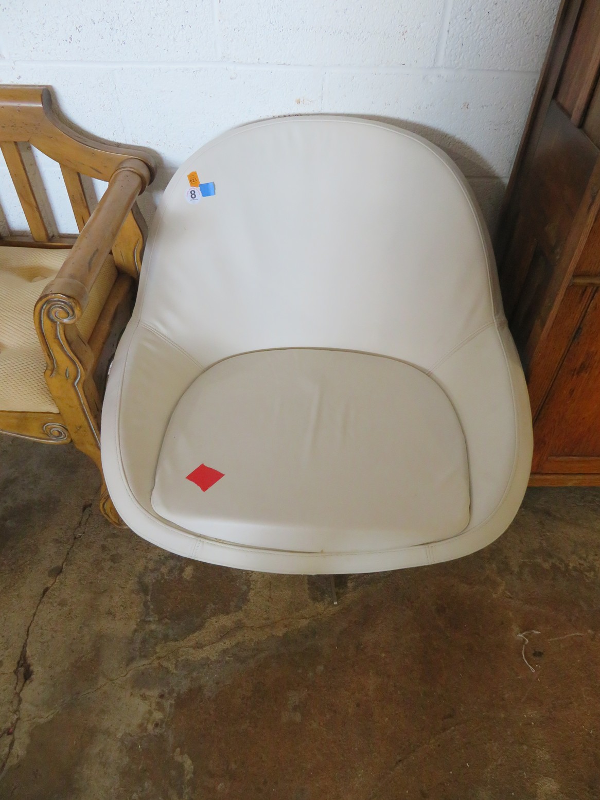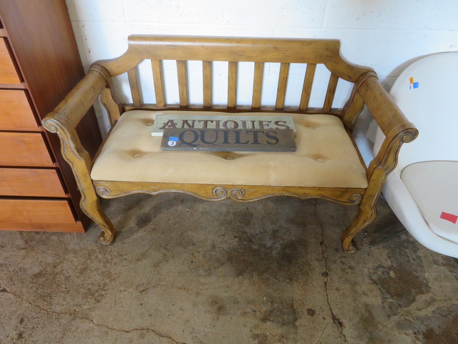 Great MCM furniture-Buffet with open hutch top & pair of woven panel doors marked Conani Ball Furniture Makers, Stereo cabinet with Telefunken record player, Iconic ceramic lamp, Sofa, 2 level table, White chair, Gentleman’s valet chair, Nightstand, End & coffee table set; Tall dresser, Chest of drawers; Buffets; Marble top table; Padded bench; Drop side coffee table; China cabinet with carved crest; Gun cabinet with glass door; Oak washstand with towel bar; Piecrust edge plant stand; Pedestal drum table;