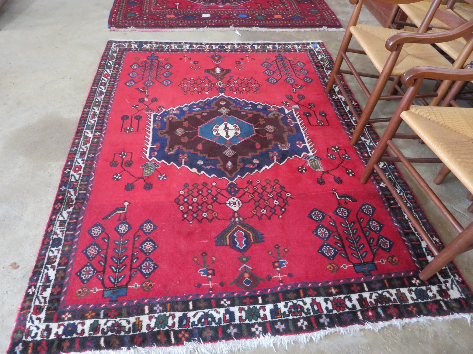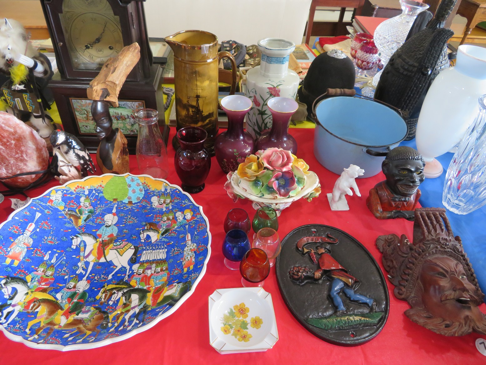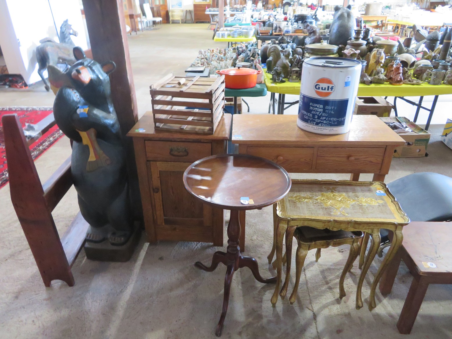 Carved bear table lamp; Drop side 2 drawer sewing stand; Brass kindling box; Wall clock; 2 drawer table; Small cabinet; Bookrack; Nesting table set; Small bench; Drop front desk; Turtle shaped marble top table; Table with parquet inlay top; Buffet; Pair of upholstered chairs; Washstand; Barstools with woven seat; Magazine holder; Rocking chairs; Birthing chairs; Display table; Crystal lamp; Nicely framed mirror; Crystal chandelier; String of faux peppers; Great Oriental rugs & carpets; Lots of Decorator accents & lots more!