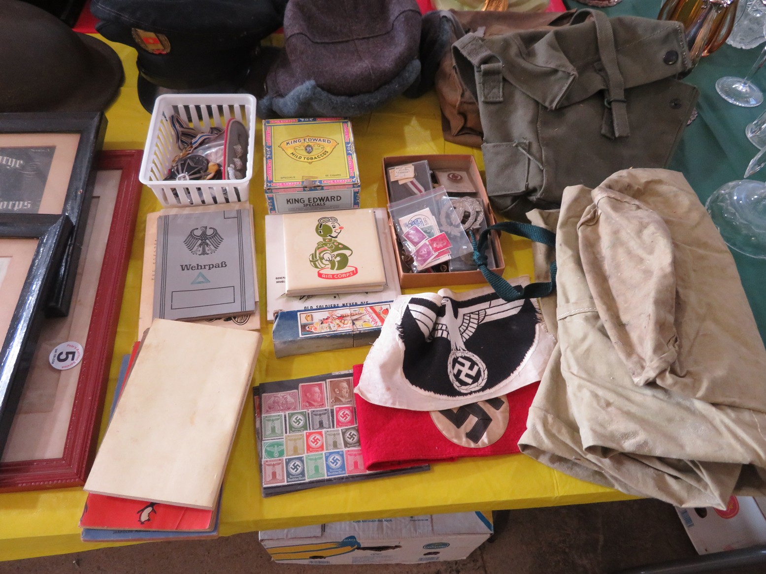 Nice set of 4 metal porch chairs; Garden statue of dog with flower basket; Large squirrel statue; Gulf Oil large metal can; Metal wheel; Massive copper charger; Military metal in framed display; Military collectibles book; Other military books & ephemera; “Japs Surrender” newspaper; Spats; Helmet; Belt; Caps with pins; Nazi stamps; Knapsack; Booklets; Flag; Earrings; Fine & costume jewelry ready for gift giving; Copper mugs; Smoking pipes; Nippers; 45 records boxes; Chess sets;
