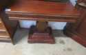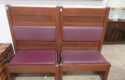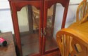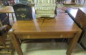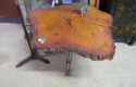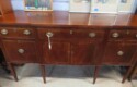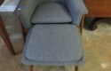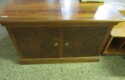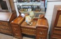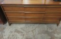 FURNISHINGS: Nice 6 drawer MCM desk with chair; Mid Century Modern upholstered low back bar seats, set of 6; MCM upholstered chair with footstool; Lane Midcentury dresser; Pair of interesting low chairs; MCM coffee table; Twin bed set; Large tree trunk slab table; Blanket box with brass edges; 2 tier round table; Checkerboard top table; Painted plank bottom chair; Inlaid waterfall dresser with mirror; Really nice breakfront server with string inlay; Unusual small corner jelly cupboard; Dough box on legs;