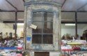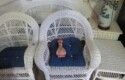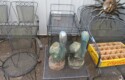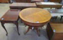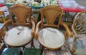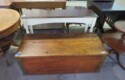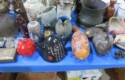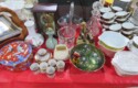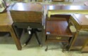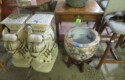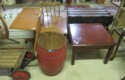 Large spinning wheel; Metal wheel wood base wagon; Old hanging cabinet with distressed paint; Old painted wood barrel; Painted dome top trunk; Flat top trunks; Bean pot lamp; Ceramic vase lamps; Rolling sofa side table; Coffee tables; Chairs of all kinds; Pair of cream & gold elephant garden seats; Oriental fishbowl planter on stand; Footstools; Nesting tables; Crystal table lamps; Wicker chests; Bar seats;