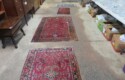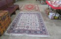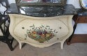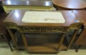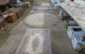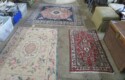 Parquet bombe chest with marble top & brass accents; Contemporary chest with carvings; 5 pc. white wicker set (2 chairs, settee, 2 tables); Bamboo display shelf; Oriental decorated cabinet; Medium curio cabinet; End table with double drop leaves; Sofa table; Occasional table with drop leaves & brass paw feet; Wooden box with brass corners; End tables; Open bookshelf; Floor lamps; Fine Oriental rugs, runners & carpets; Drop leaf coffee table; Asian carved throne chair;