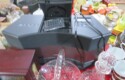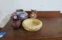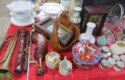 Brass diving helmet; Old metal helmet; Metal Letters mailbox with hunting horn emblem; Sleigh bells; Mounted whitetail head with hoof gun rack; Decoy; Old plastic case mantel clock; Cinnabar vase; Cloisonne napkin rings; Marble ashtray; Cloisonne ginger jars; Brass candelabra; Old trumpet;