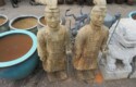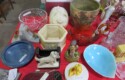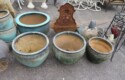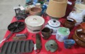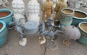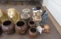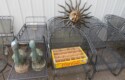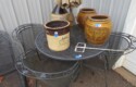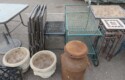 Cast iron corn stick pan; Cornbread wedge cast iron pan; Old brass hanging scales; Enamel ware kettle with lid; Decorated enamel ware kettle; Baskets; Garden statues; Urns; Pagoda lights; Large collection of handled planters; Pedestals; Cast iron table & chairs; Tile top outdoor table set; Wrought iron tea cart; Milk can; Folding chairs; Wrought iron patio furniture; Poolside furniture; Sunburst plaque; MUCH MUCH MORE!!!!!!