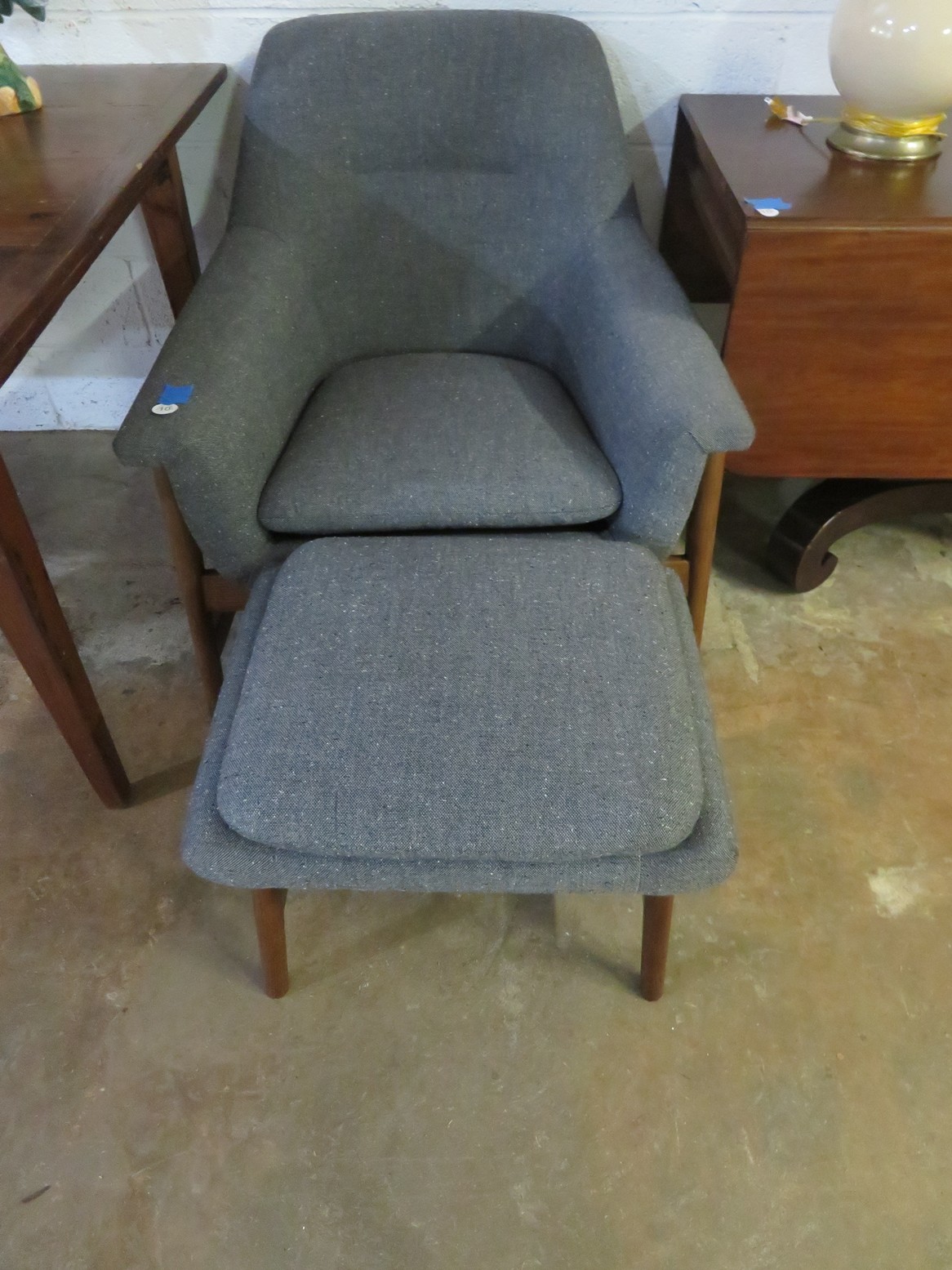 FURNISHINGS: Nice 6 drawer MCM desk with chair; Mid Century Modern upholstered low back bar seats, set of 6; MCM upholstered chair with footstool; Lane Midcentury dresser; Pair of interesting low chairs; MCM coffee table; Twin bed set; Large tree trunk slab table; Blanket box with brass edges; 2 tier round table; Checkerboard top table; Painted plank bottom chair; Inlaid waterfall dresser with mirror; Really nice breakfront server with string inlay; Unusual small corner jelly cupboard; Dough box on legs;