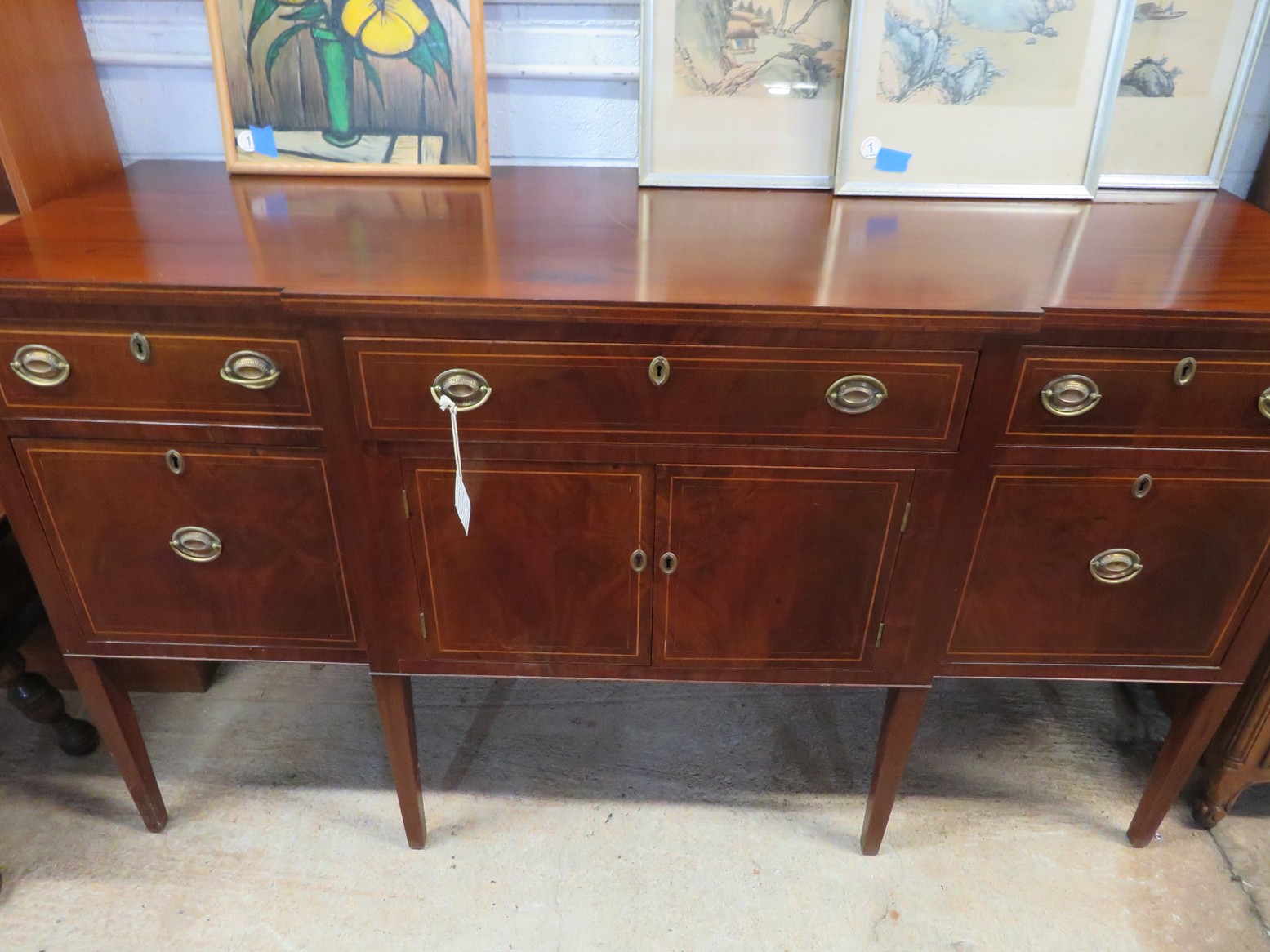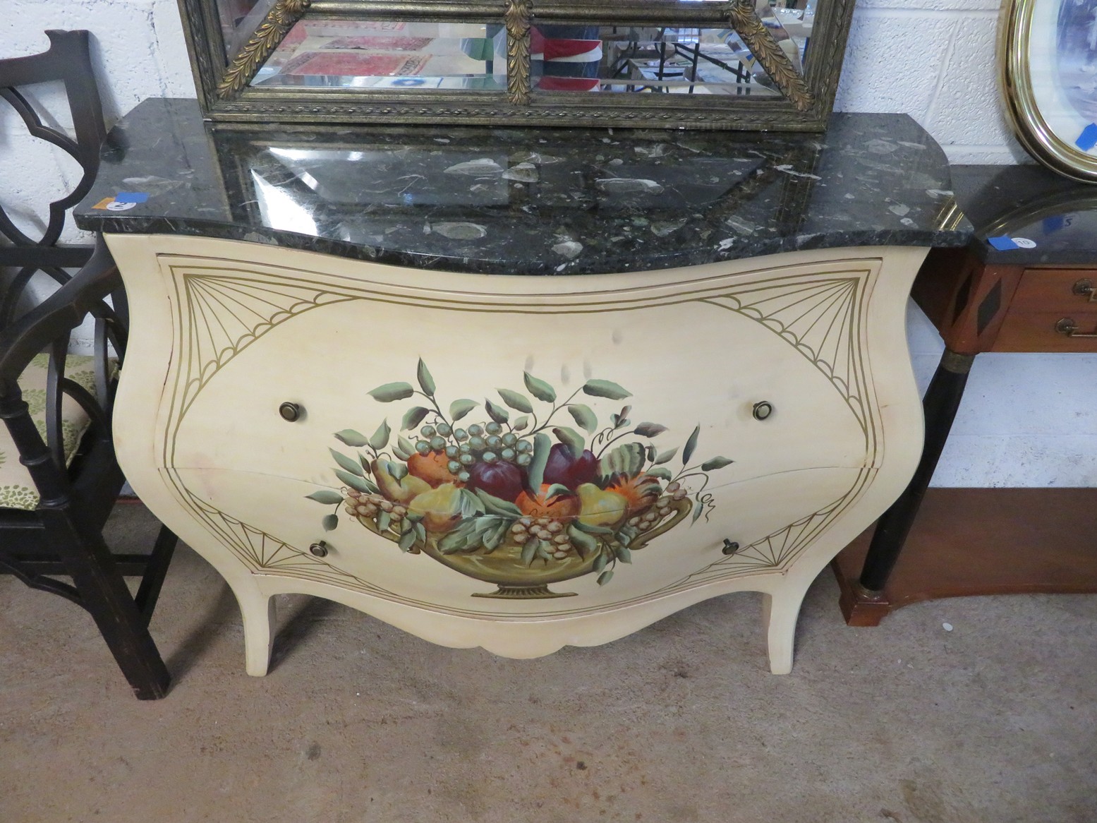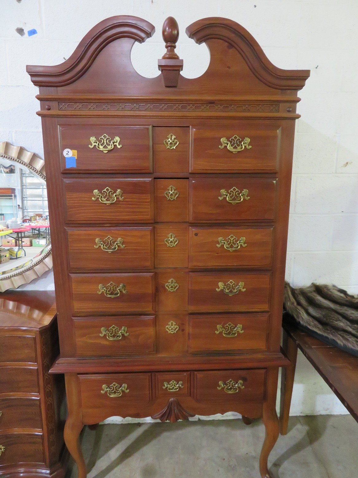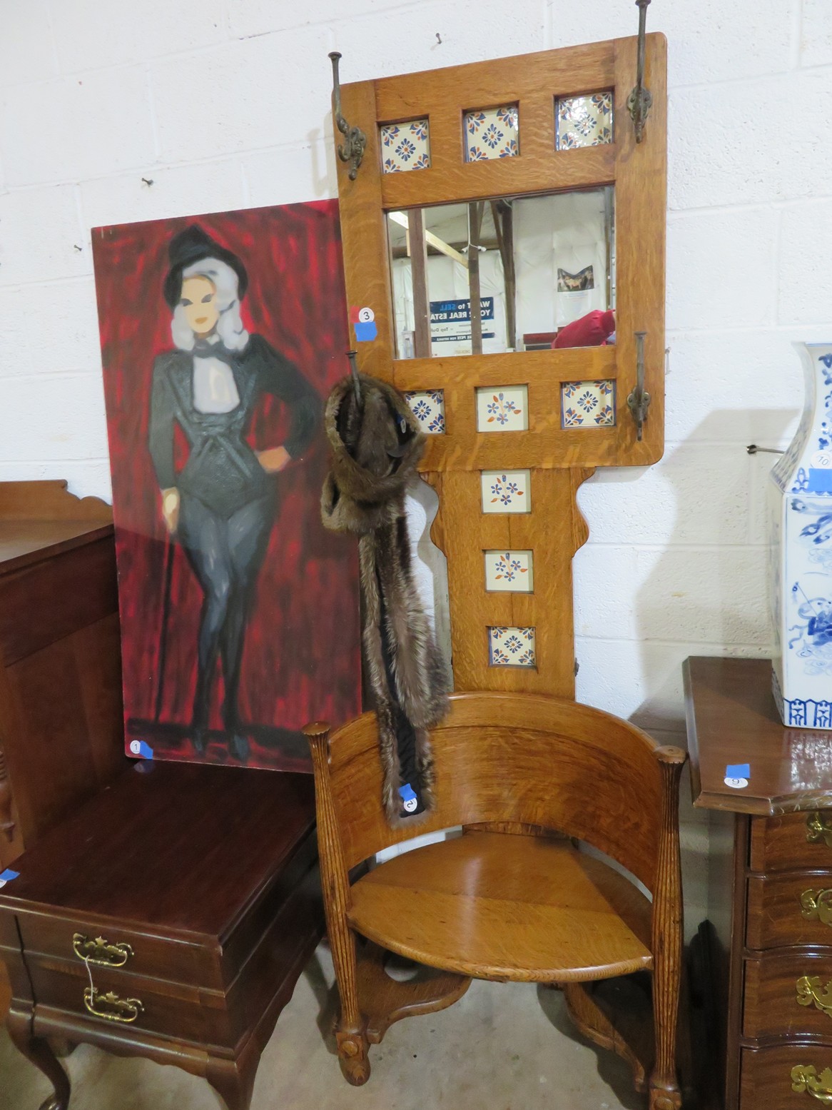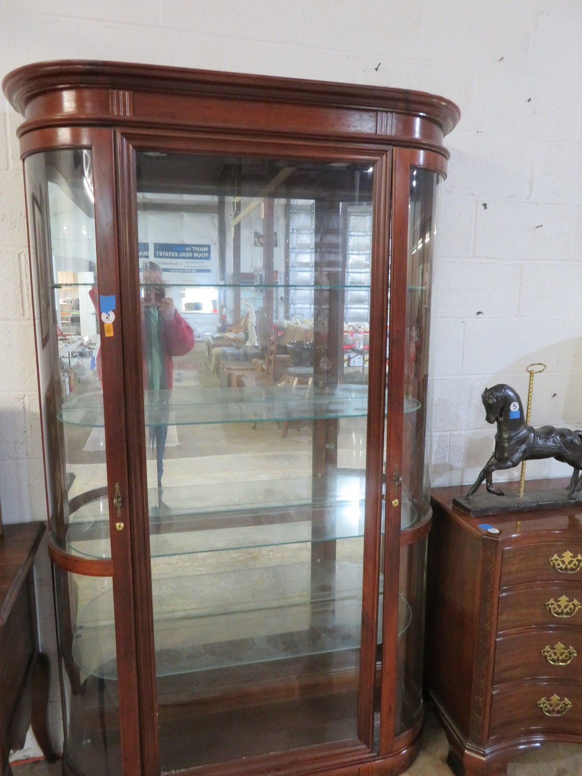 Highboy with nice detailing; Baker bowfront chest (pair); Nice contemporary cabinet; Oak hall tree with inset tiles and unusual round backed seat; Marble inset top display table; Banded edge drop leaf table; End table with pull out shelf; Round banded edge table; Bench; Marble top low round table; Large curved glass side curio cabinet; Bombe chest with dark marble top and painted fruit bowl decoration; Empire gaming table; Corner cabinet; Rush seat ladderback chairs; Pair of green glazed elephant plant stands;