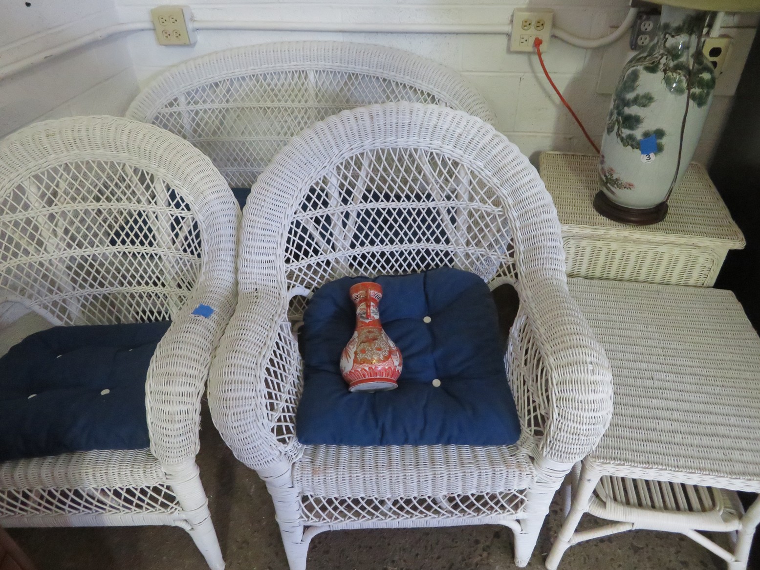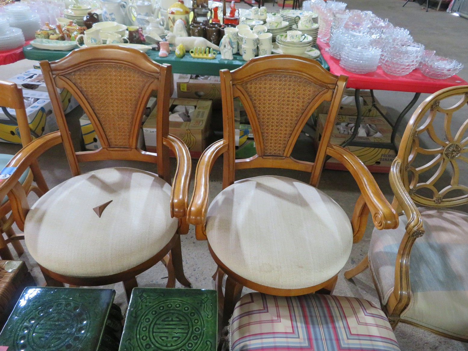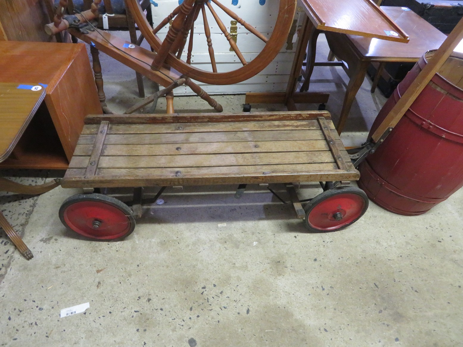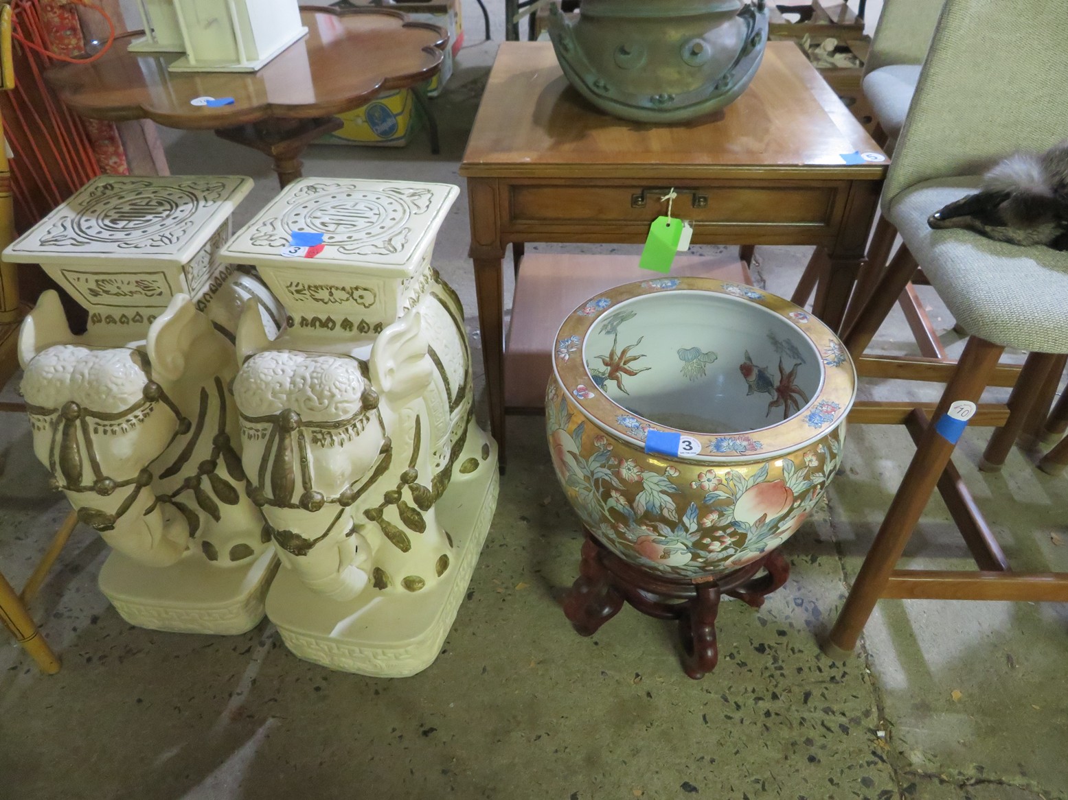 Large spinning wheel; Metal wheel wood base wagon; Old hanging cabinet with distressed paint; Old painted wood barrel; Painted dome top trunk; Flat top trunks; Bean pot lamp; Ceramic vase lamps; Rolling sofa side table; Coffee tables; Chairs of all kinds; Pair of cream & gold elephant garden seats; Oriental fishbowl planter on stand; Footstools; Nesting tables; Crystal table lamps; Wicker chests; Bar seats;