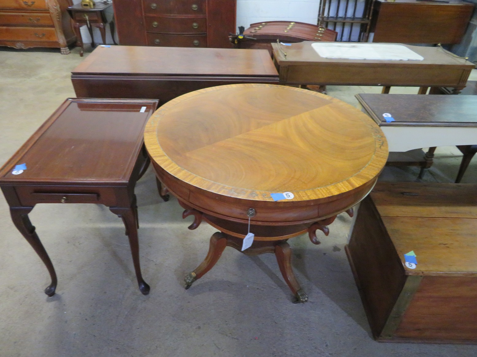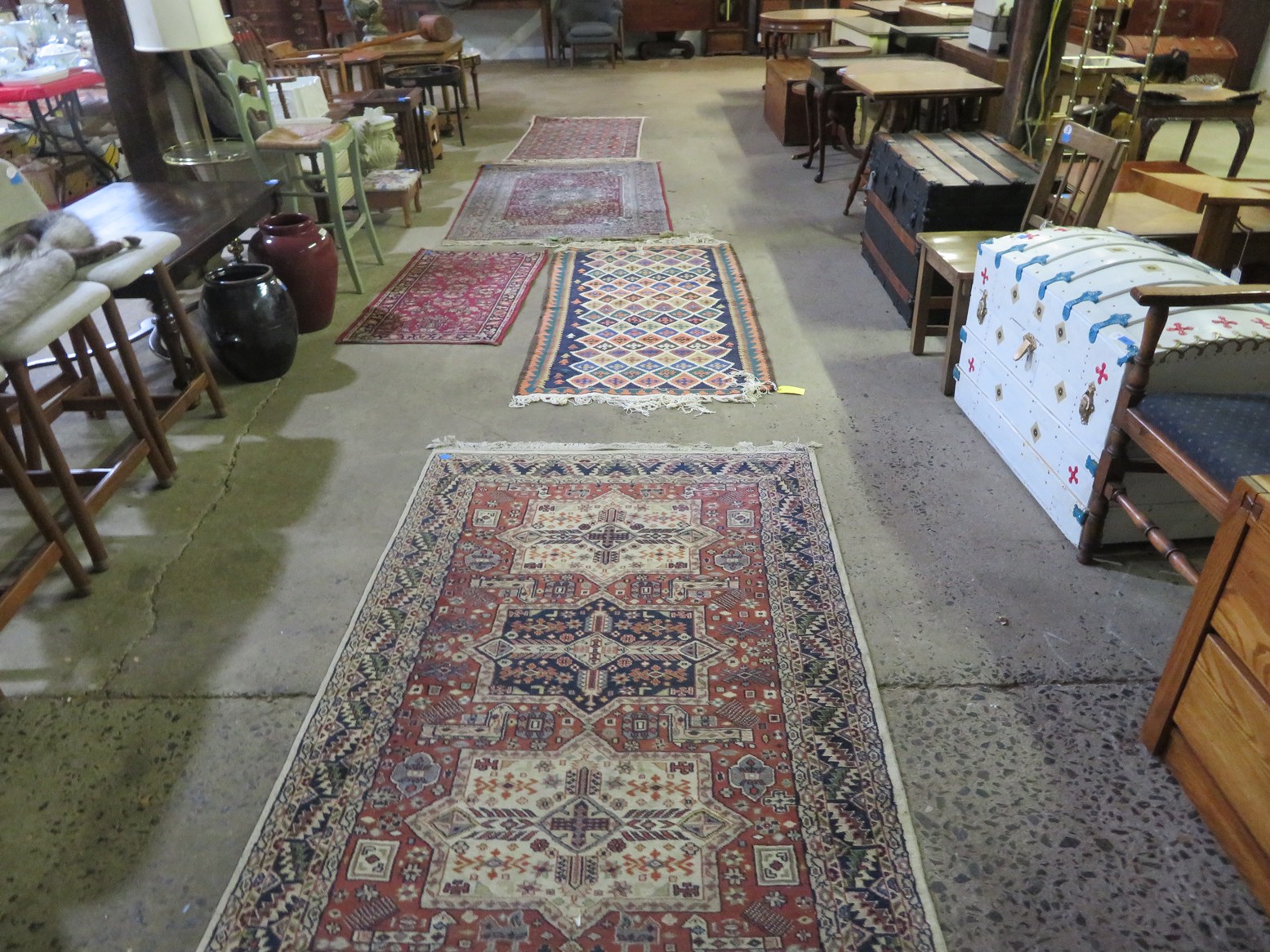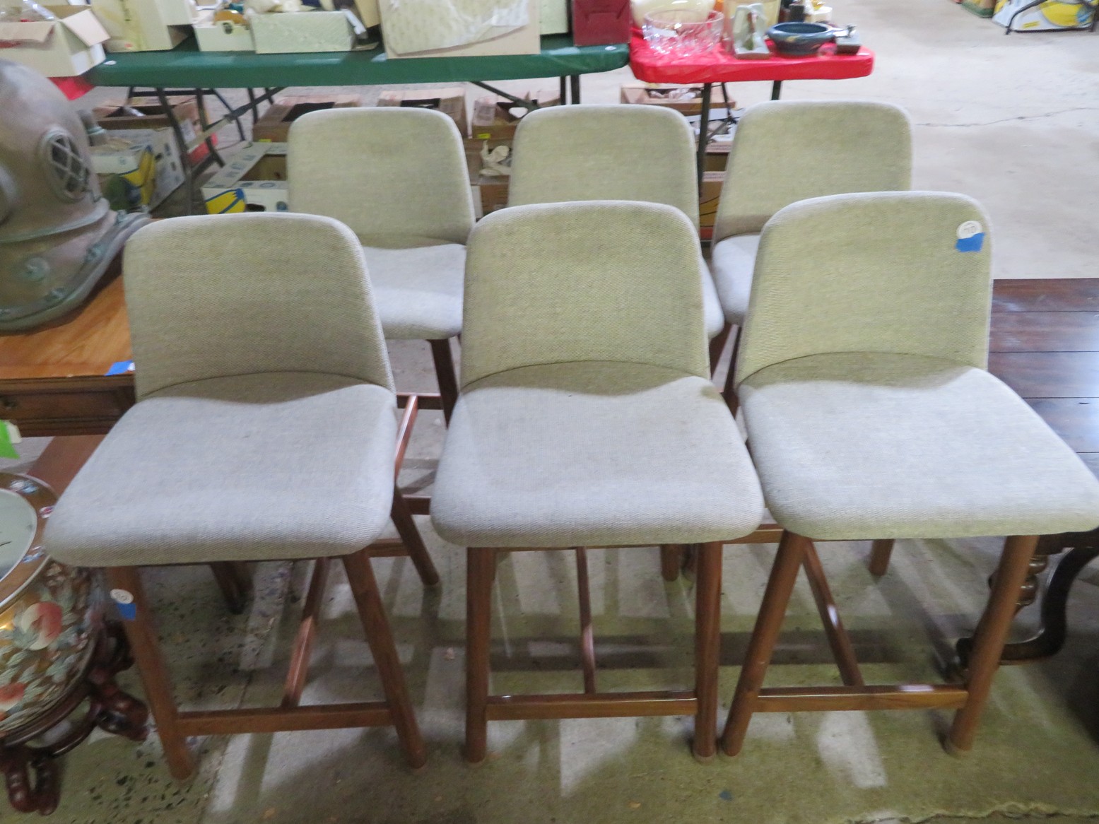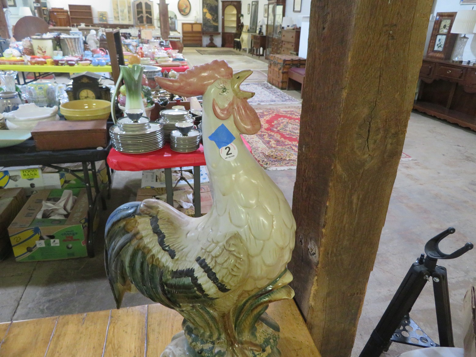 Large spinning wheel; Metal wheel wood base wagon; Old hanging cabinet with distressed paint; Old painted wood barrel; Painted dome top trunk; Flat top trunks; Bean pot lamp; Ceramic vase lamps; Rolling sofa side table; Coffee tables; Chairs of all kinds; Pair of cream & gold elephant garden seats; Oriental fishbowl planter on stand; Footstools; Nesting tables; Crystal table lamps; Wicker chests; Bar seats;