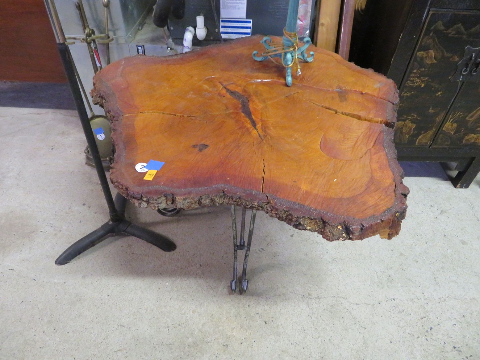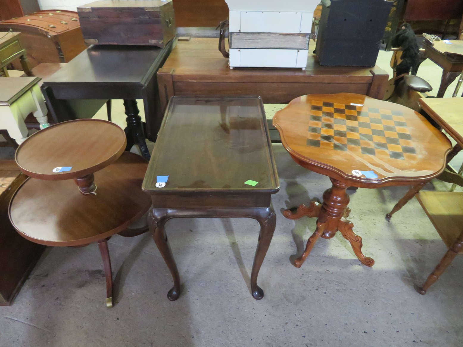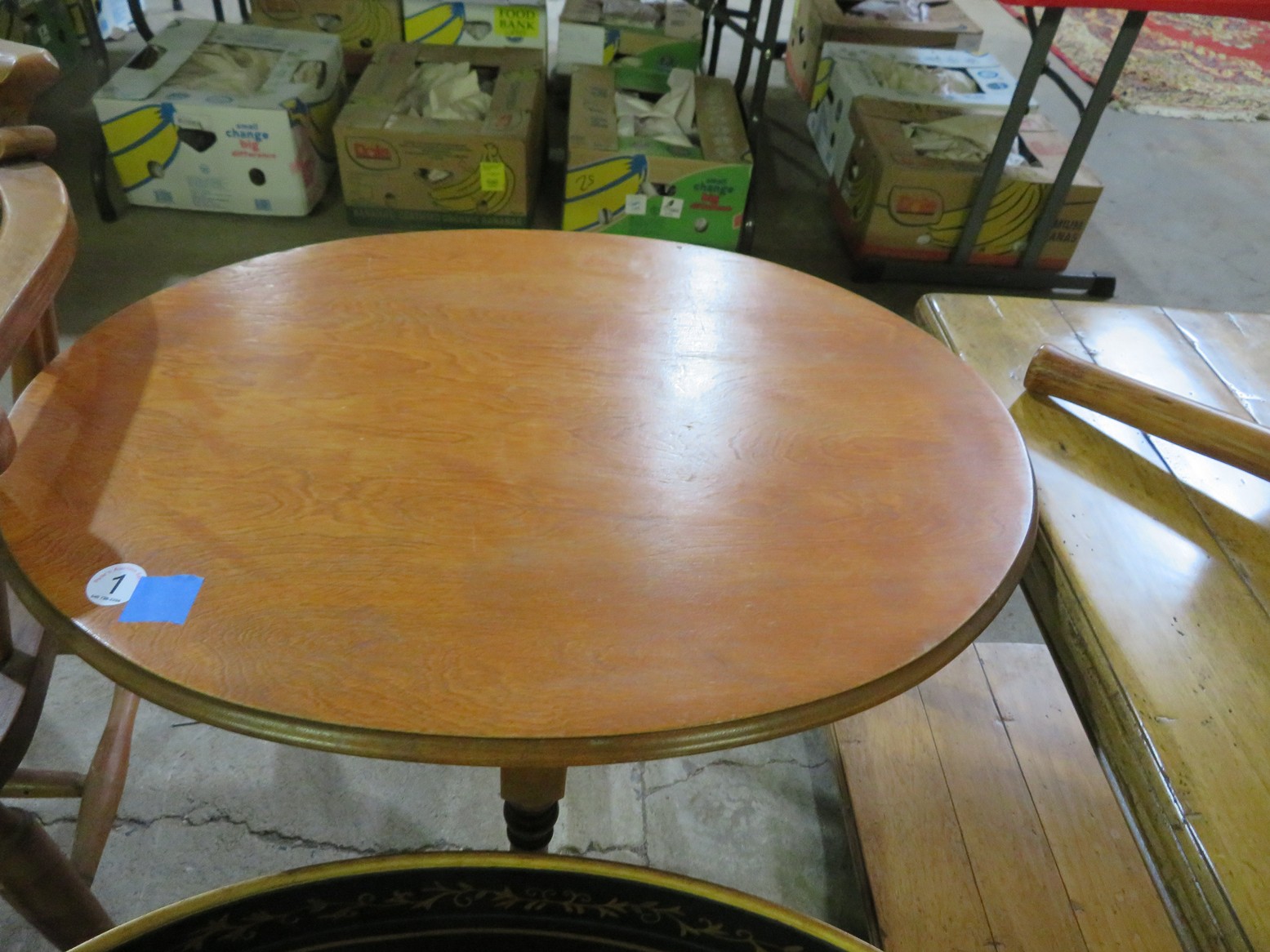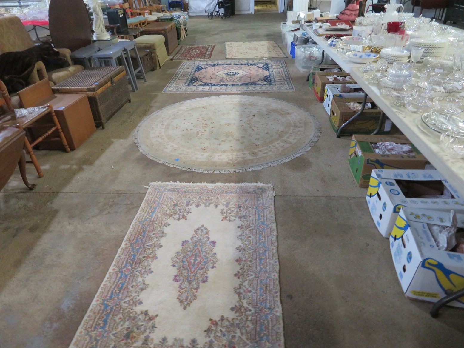 Large spinning wheel; Metal wheel wood base wagon; Old hanging cabinet with distressed paint; Old painted wood barrel; Painted dome top trunk; Flat top trunks; Bean pot lamp; Ceramic vase lamps; Rolling sofa side table; Coffee tables; Chairs of all kinds; Pair of cream & gold elephant garden seats; Oriental fishbowl planter on stand; Footstools; Nesting tables; Crystal table lamps; Wicker chests; Bar seats;