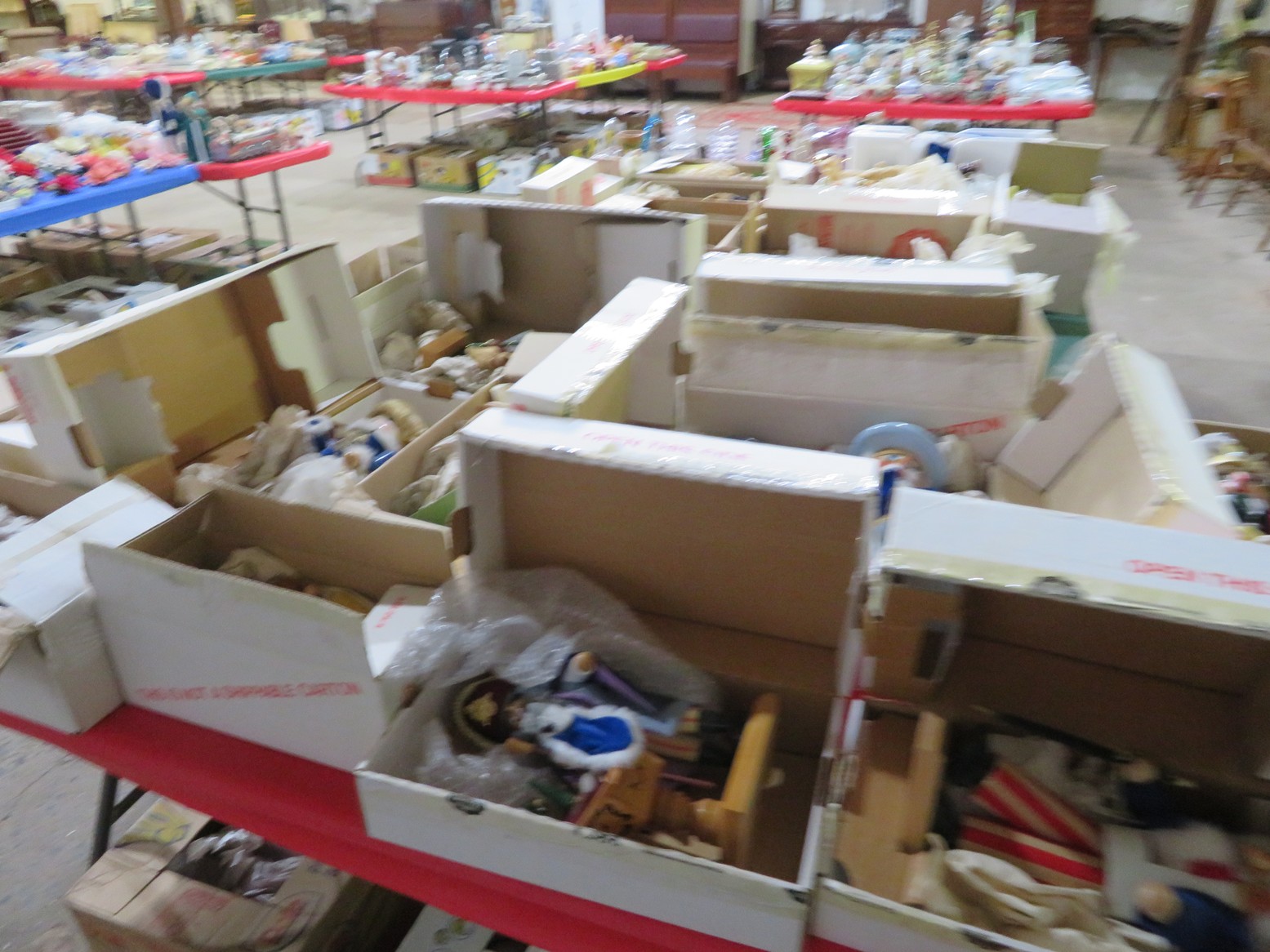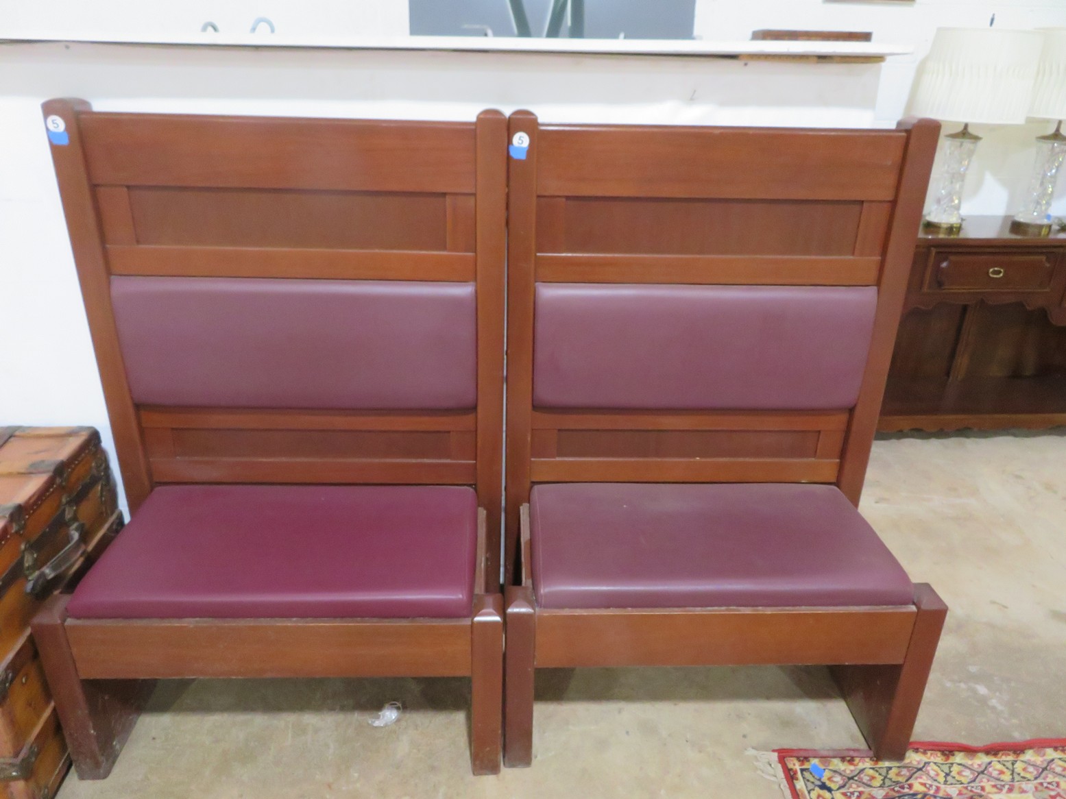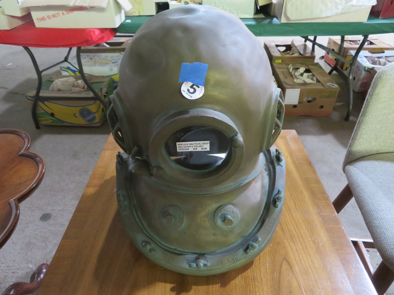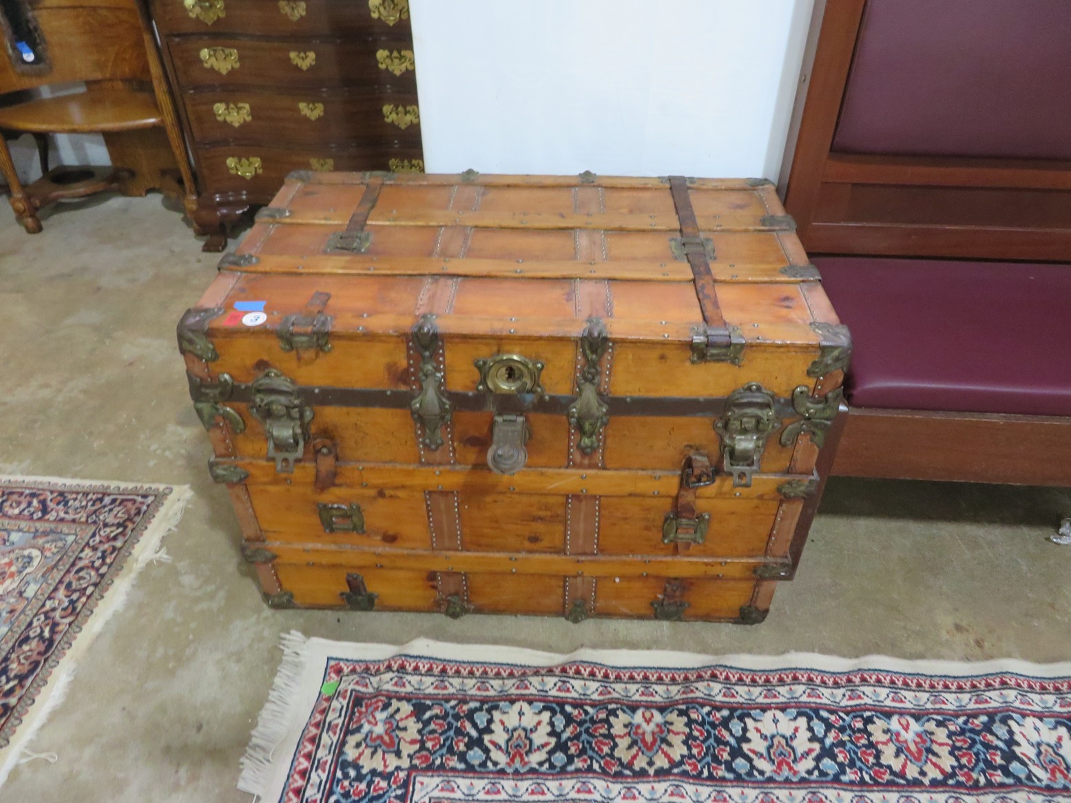 Large spinning wheel; Metal wheel wood base wagon; Old hanging cabinet with distressed paint; Old painted wood barrel; Painted dome top trunk; Flat top trunks; Bean pot lamp; Ceramic vase lamps; Rolling sofa side table; Coffee tables; Chairs of all kinds; Pair of cream & gold elephant garden seats; Oriental fishbowl planter on stand; Footstools; Nesting tables; Crystal table lamps; Wicker chests; Bar seats;