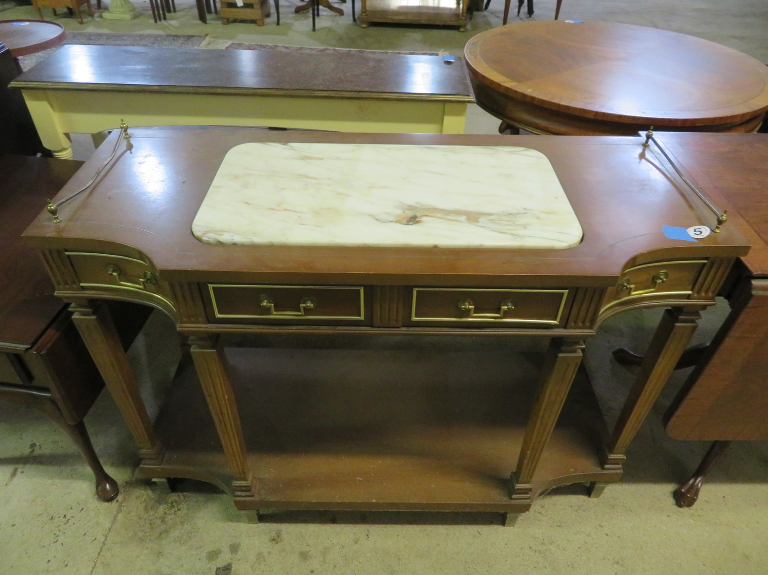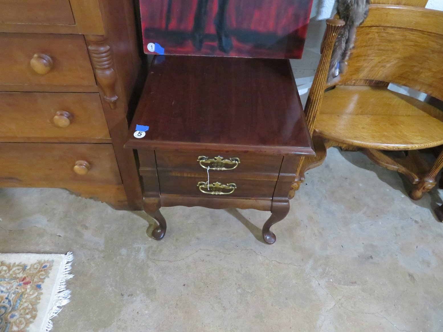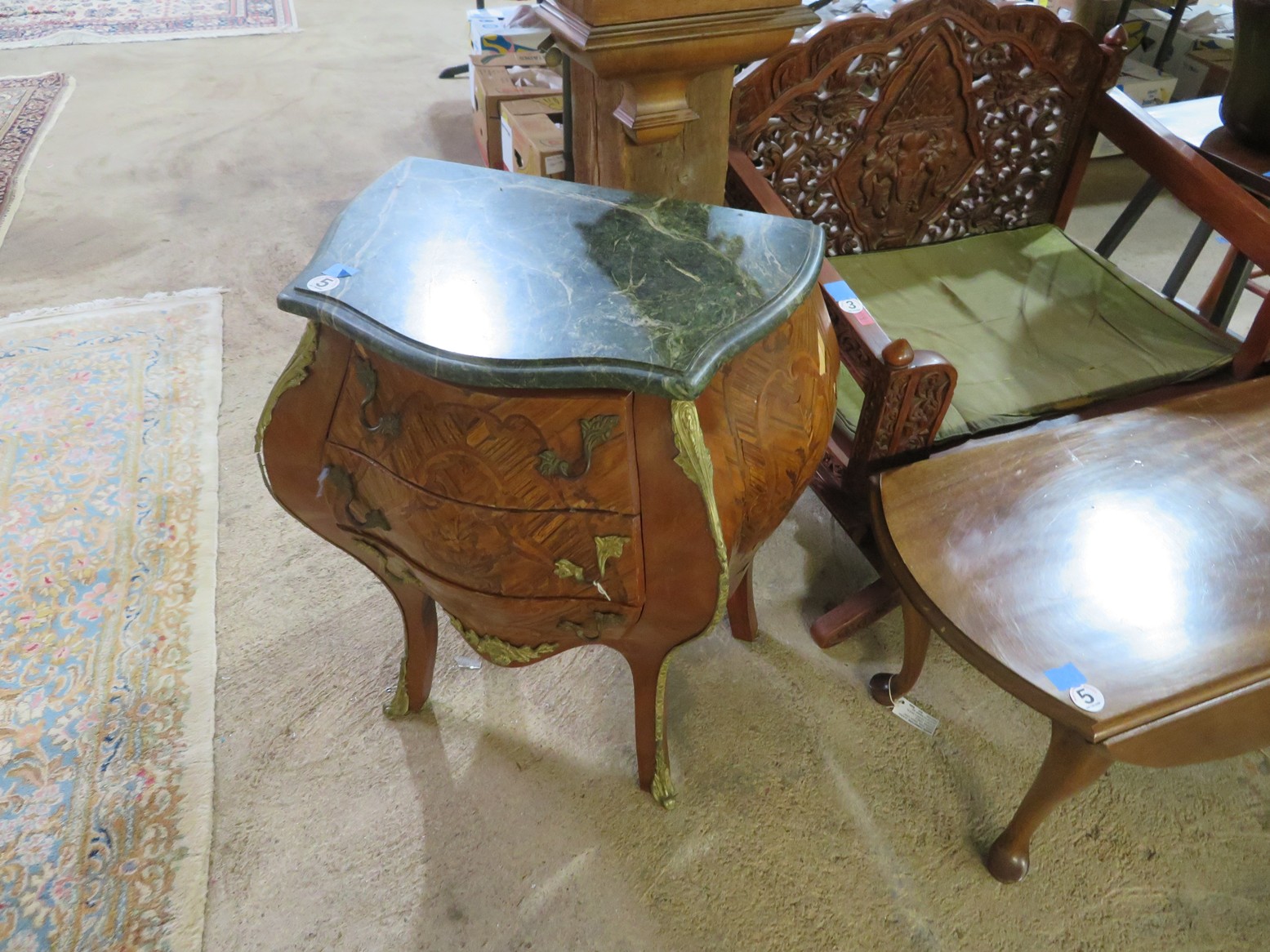 Parquet bombe chest with marble top & brass accents; Contemporary chest with carvings; 5 pc. white wicker set (2 chairs, settee, 2 tables); Bamboo display shelf; Oriental decorated cabinet; Medium curio cabinet; End table with double drop leaves; Sofa table; Occasional table with drop leaves & brass paw feet; Wooden box with brass corners; End tables; Open bookshelf; Floor lamps; Fine Oriental rugs, runners & carpets; Drop leaf coffee table; Asian carved throne chair;