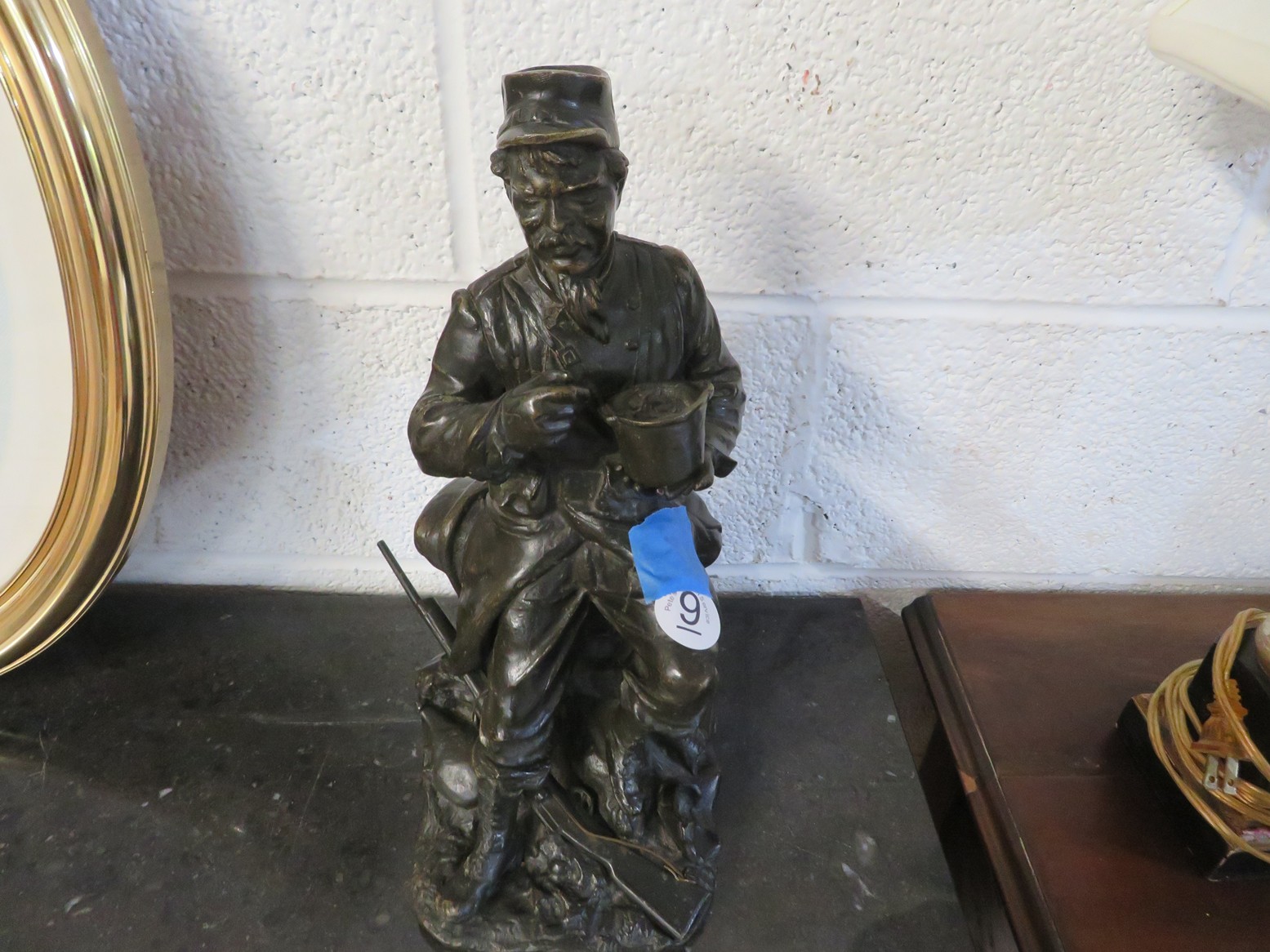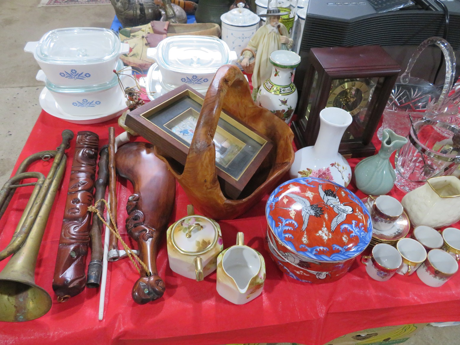 Brass diving helmet; Old metal helmet; Metal Letters mailbox with hunting horn emblem; Sleigh bells; Mounted whitetail head with hoof gun rack; Decoy; Old plastic case mantel clock; Cinnabar vase; Cloisonne napkin rings; Marble ashtray; Cloisonne ginger jars; Brass candelabra; Old trumpet;
