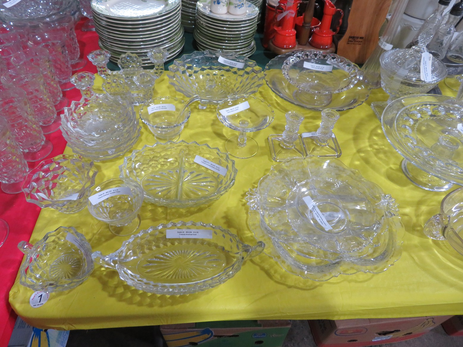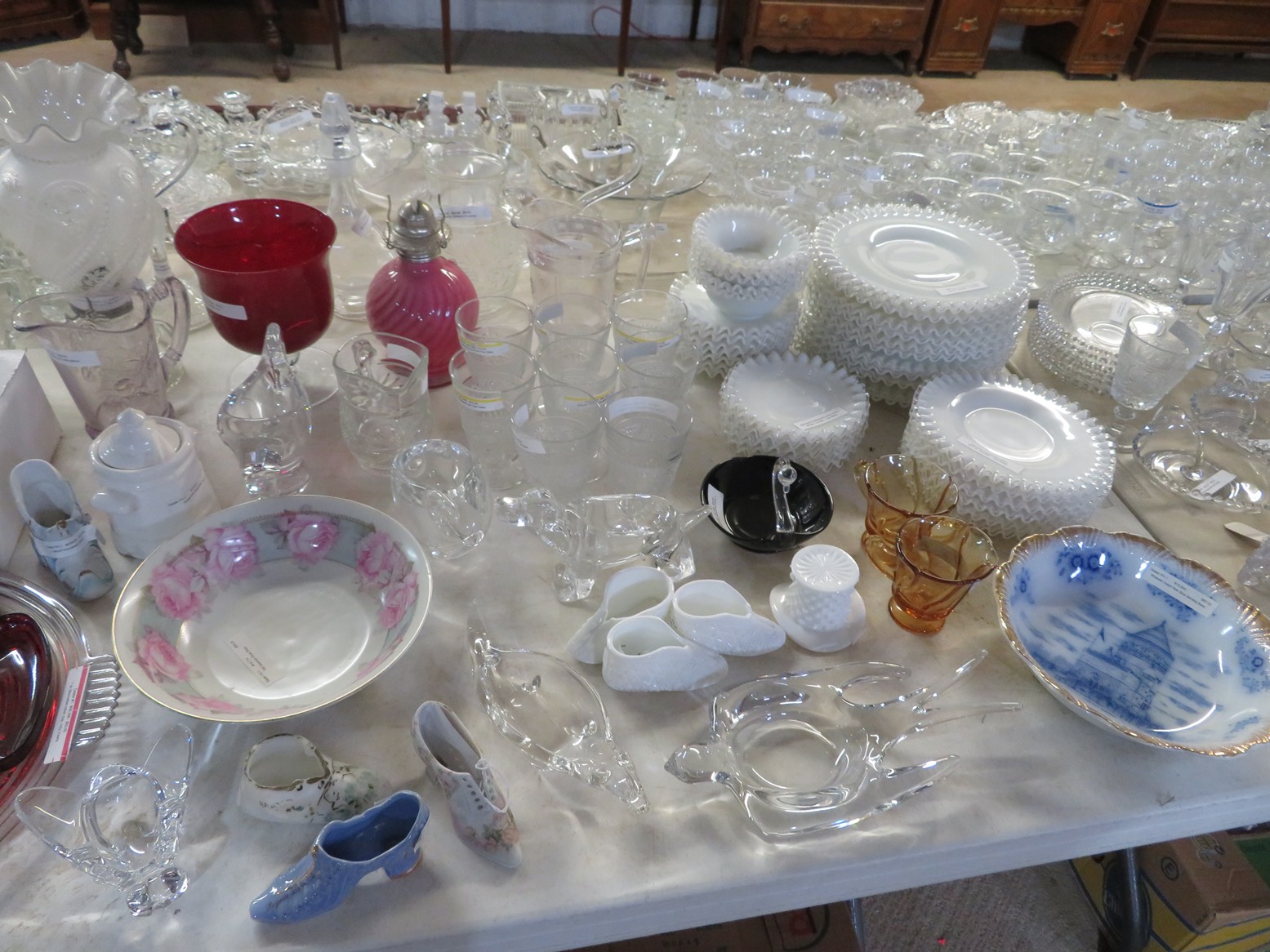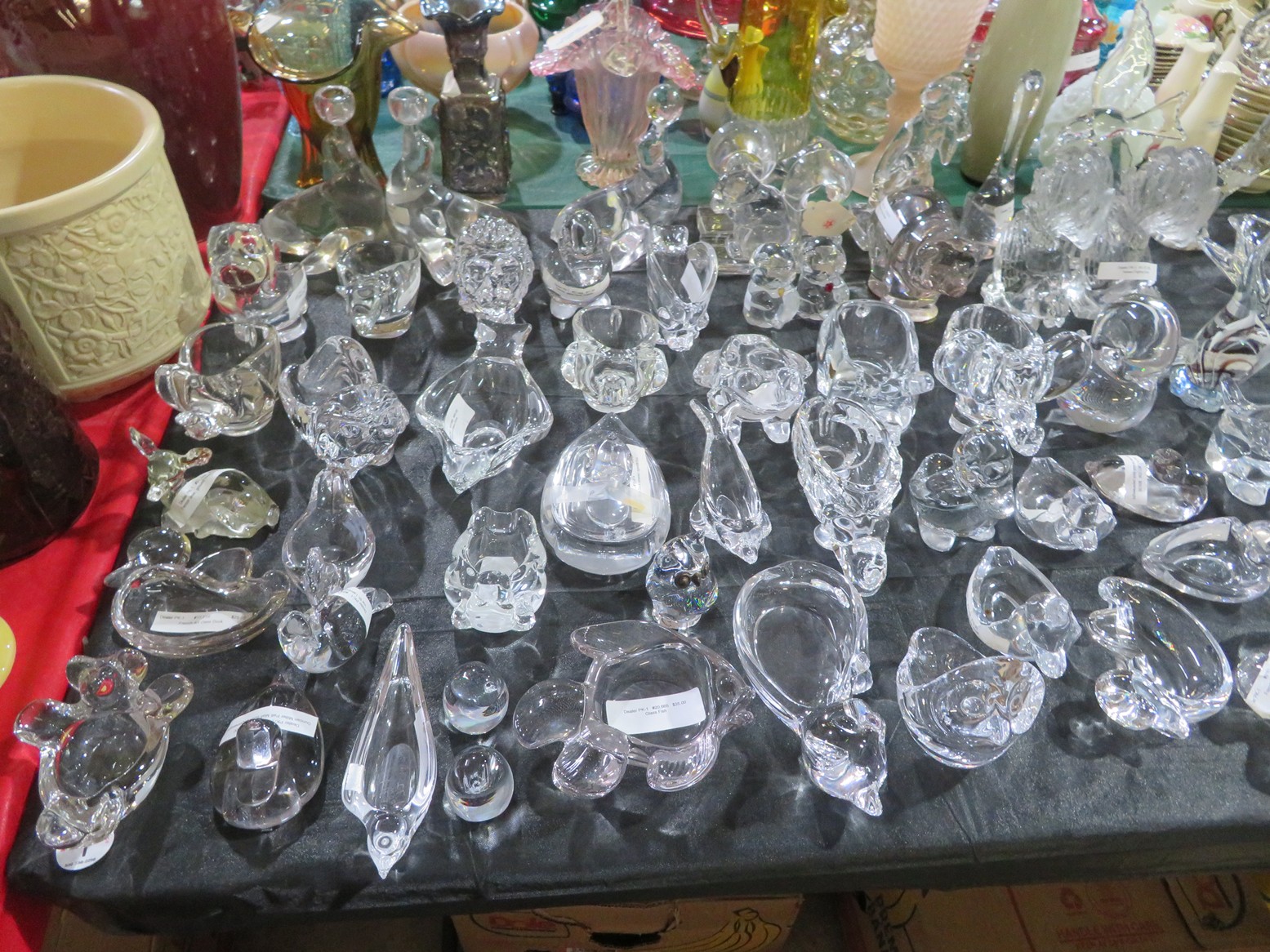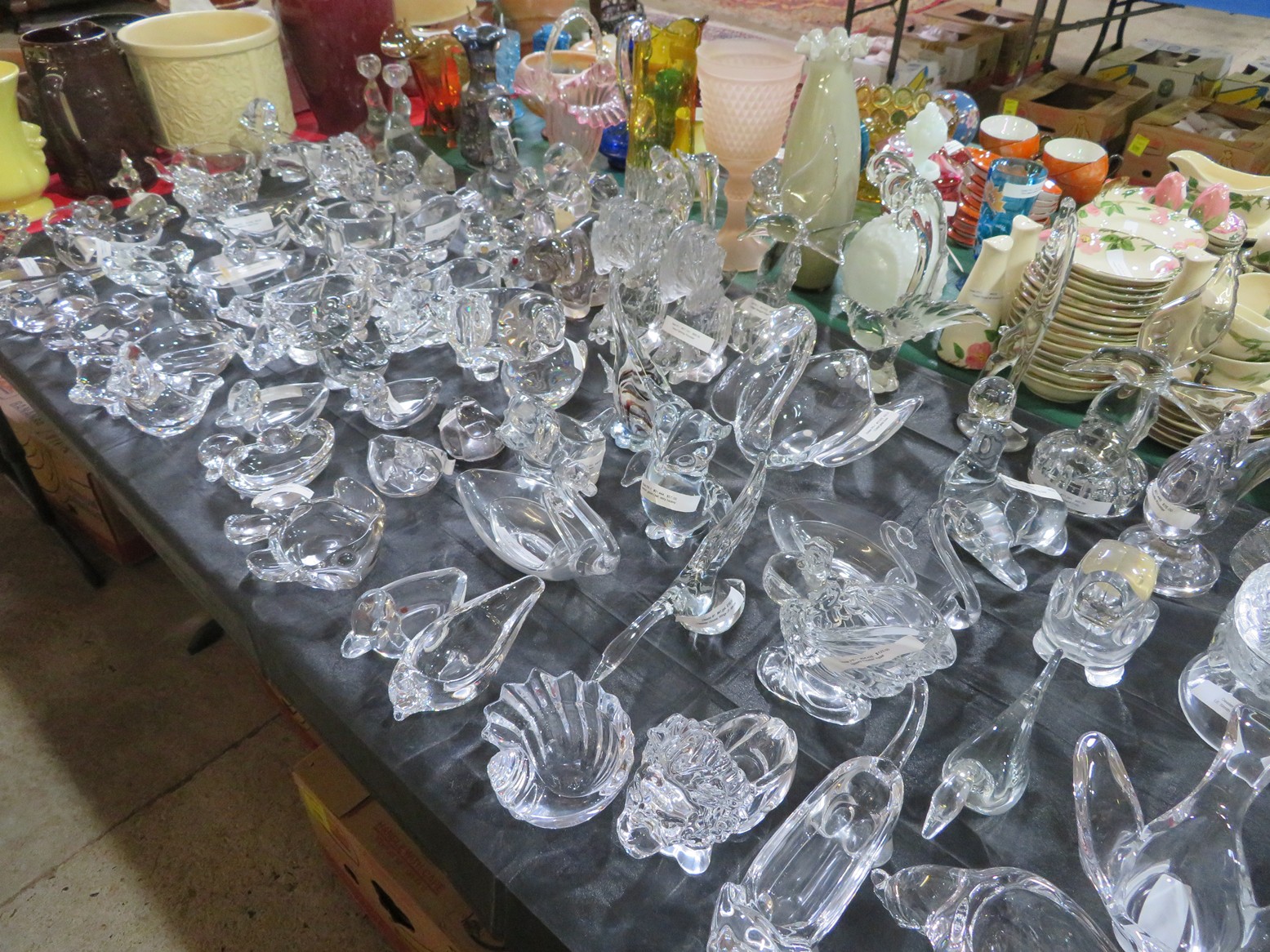 Lots & lots of clear glass animals as figurines, bowls, cups & more; Glass swans; Candlesticks; Crystal bowl; Art glass; Perfume bottles; Glass basket; Fostoria American collection; Ruby cut to clear; Frosted figure; Colored flower frogs; Paperweights; Pyrex bowls; Decanters; Glass baskets; Glass animals; Fenton silver crest cornucopia; Oil lamp; Vases; Moon & Stars bowl; Pitchers; Silver overlay; Lots of colored glass; Cambridge; Depression glass; Goblets; Large set of diamon pattern glassware; Cake stand with dome; Lots of glass shoes; Jamestown glasses; Milk glass; Clear flower frogs; Candlewick; Serving pieces; Candy dishes; S&P shakers; Cake plate; Ice bucket; Refrigerator box and much more!