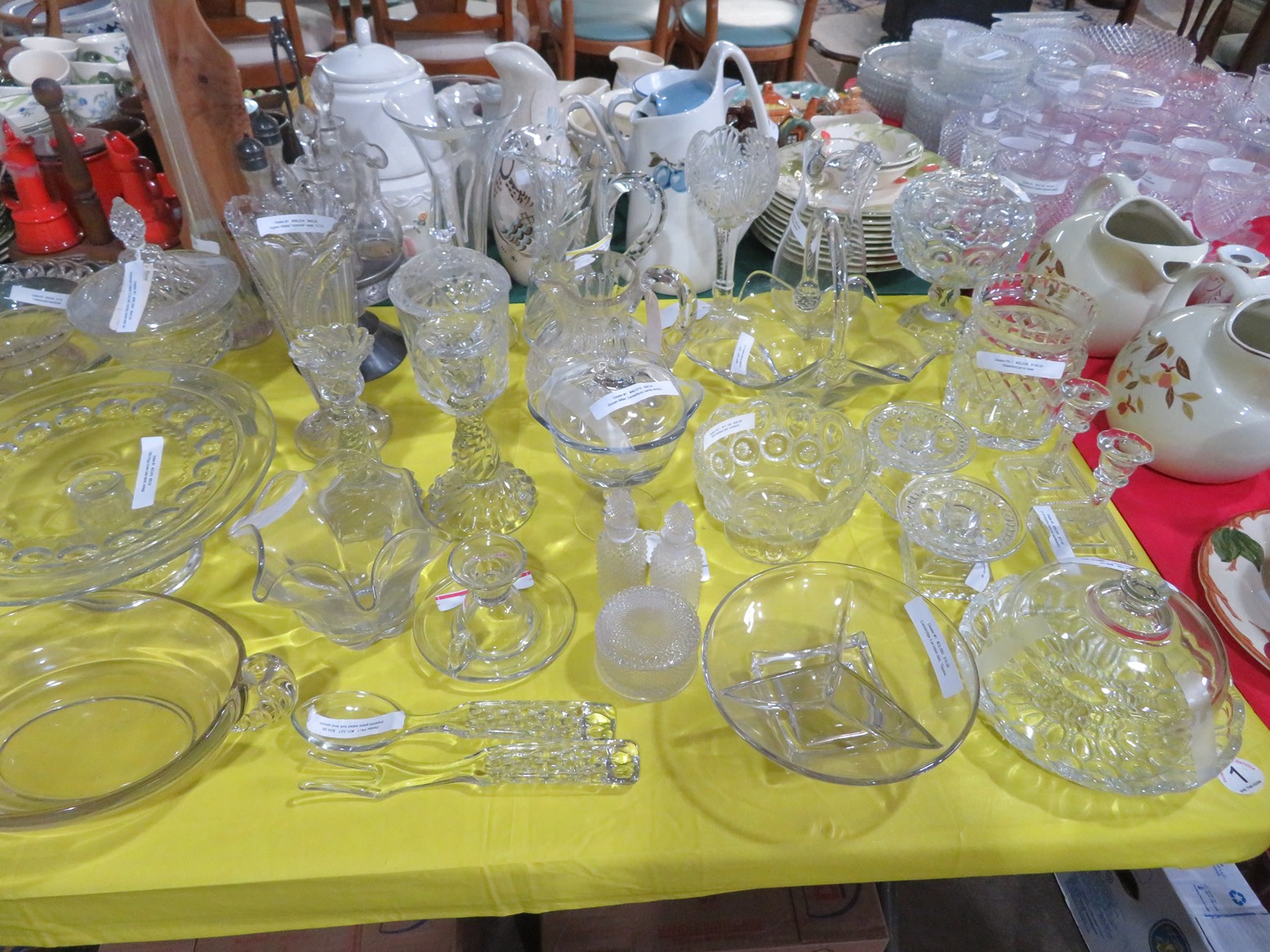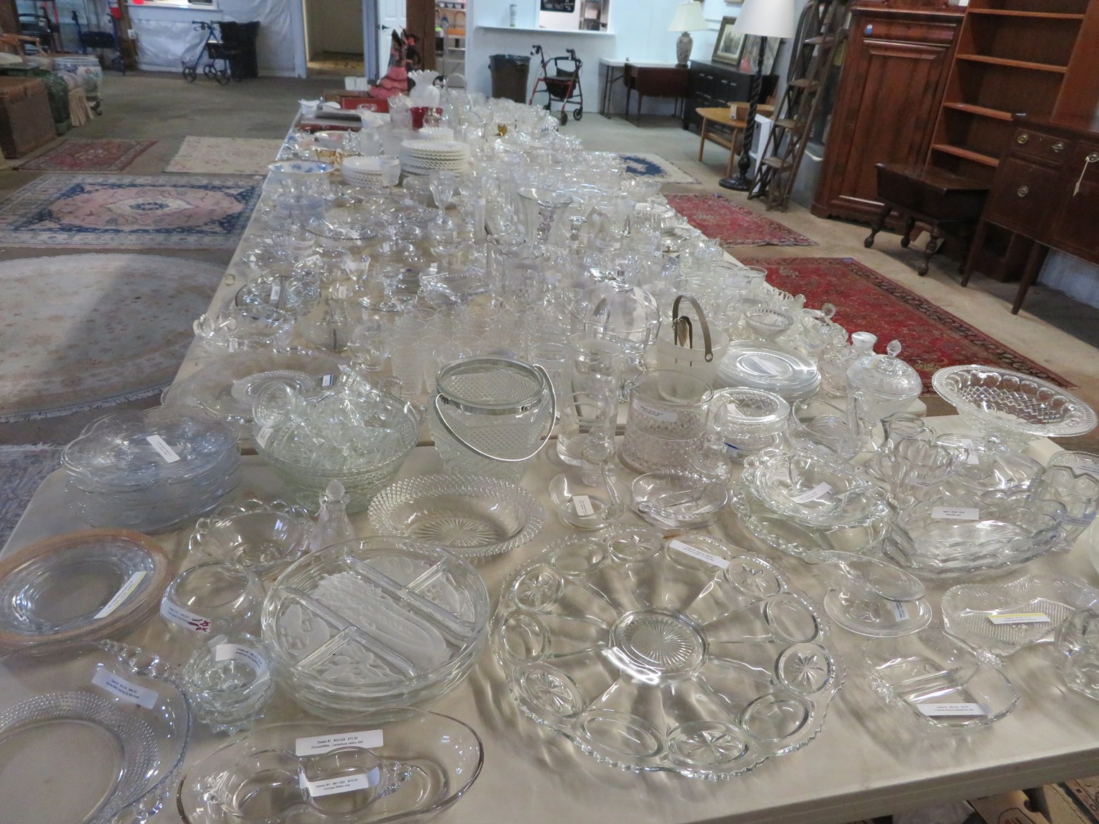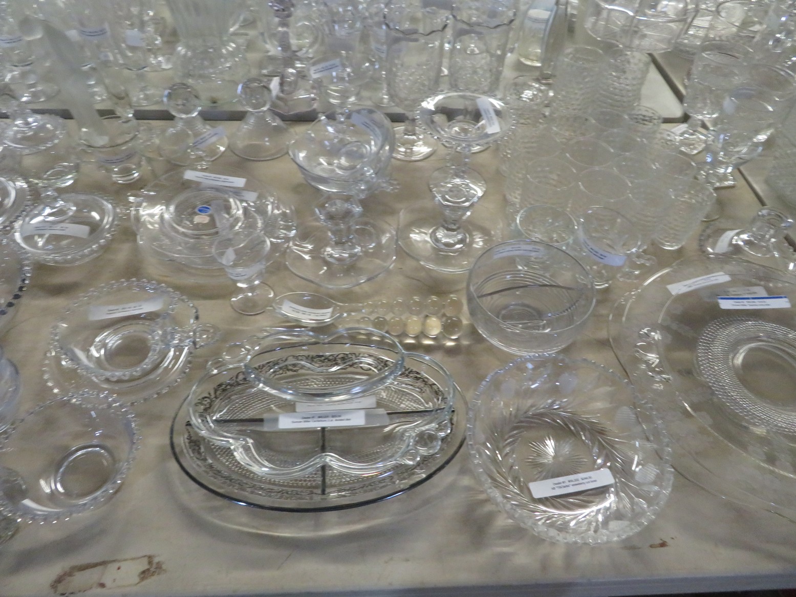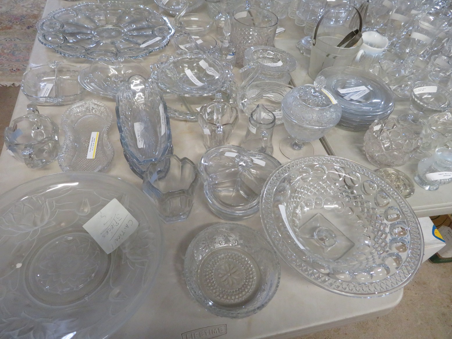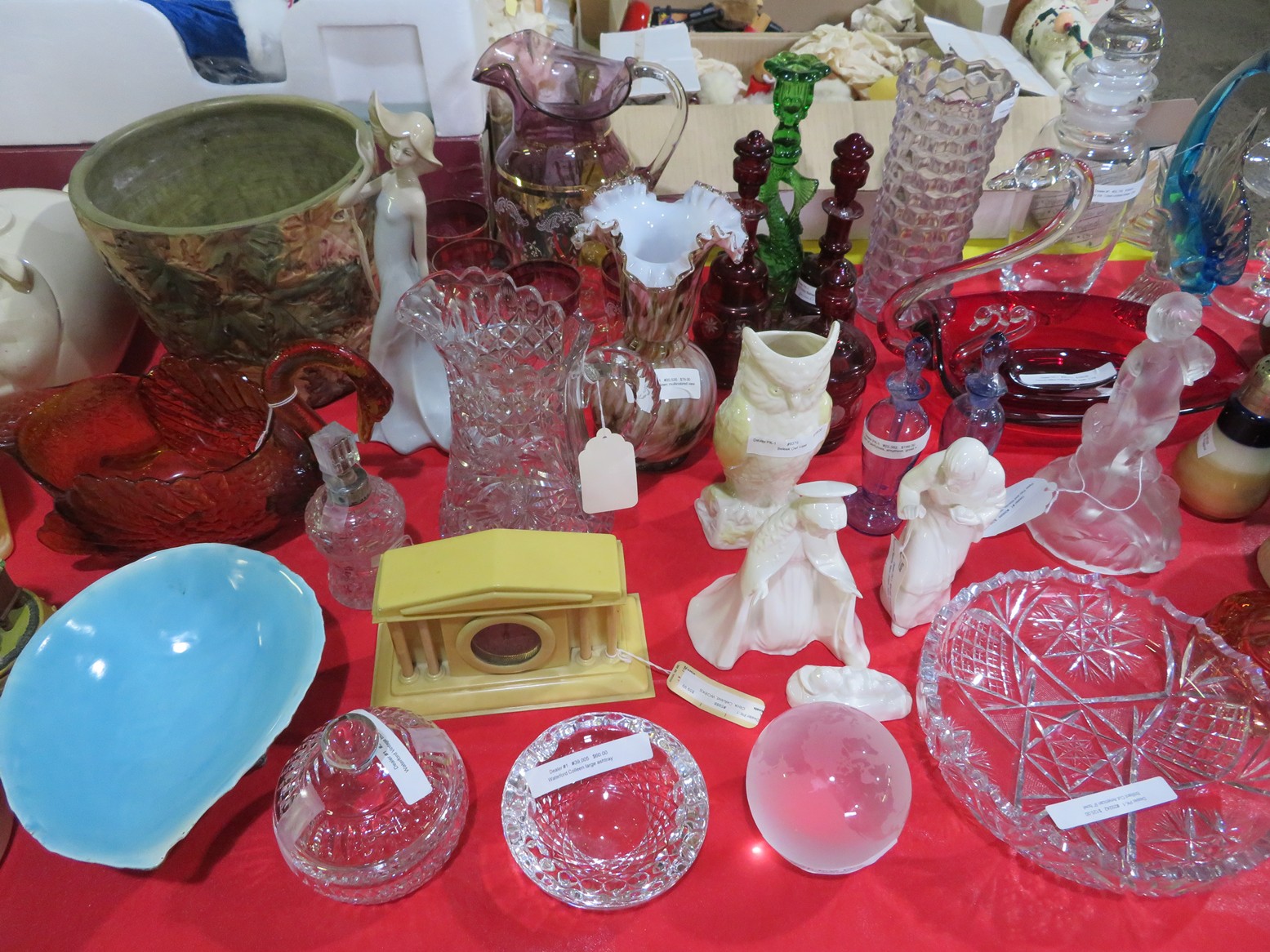 Lots & lots of clear glass animals as figurines, bowls, cups & more; Glass swans; Candlesticks; Crystal bowl; Art glass; Perfume bottles; Glass basket; Fostoria American collection; Ruby cut to clear; Frosted figure; Colored flower frogs; Paperweights; Pyrex bowls; Decanters; Glass baskets; Glass animals; Fenton silver crest cornucopia; Oil lamp; Vases; Moon & Stars bowl; Pitchers; Silver overlay; Lots of colored glass; Cambridge; Depression glass; Goblets; Large set of diamon pattern glassware; Cake stand with dome; Lots of glass shoes; Jamestown glasses; Milk glass; Clear flower frogs; Candlewick; Serving pieces; Candy dishes; S&P shakers; Cake plate; Ice bucket; Refrigerator box and much more!