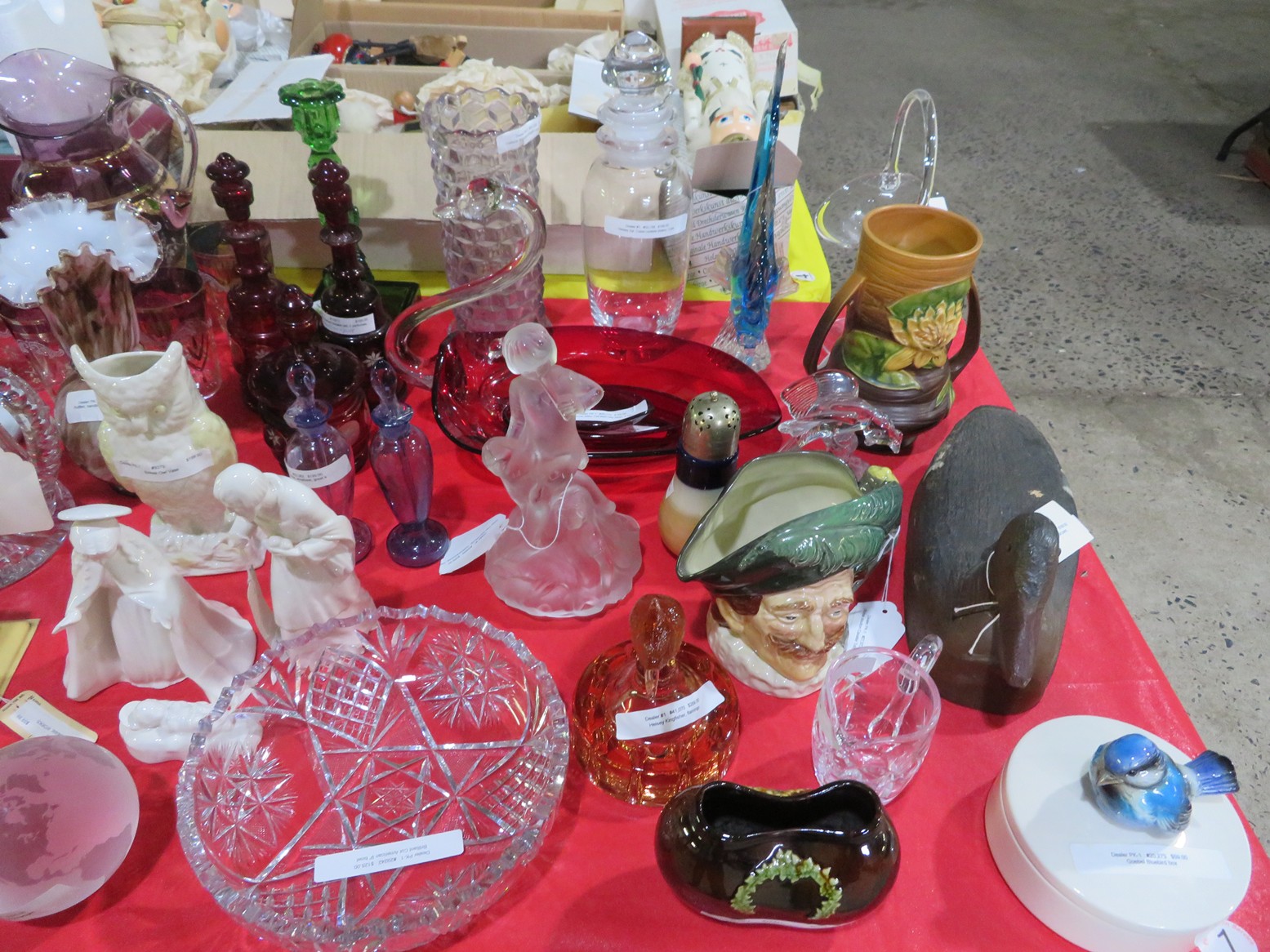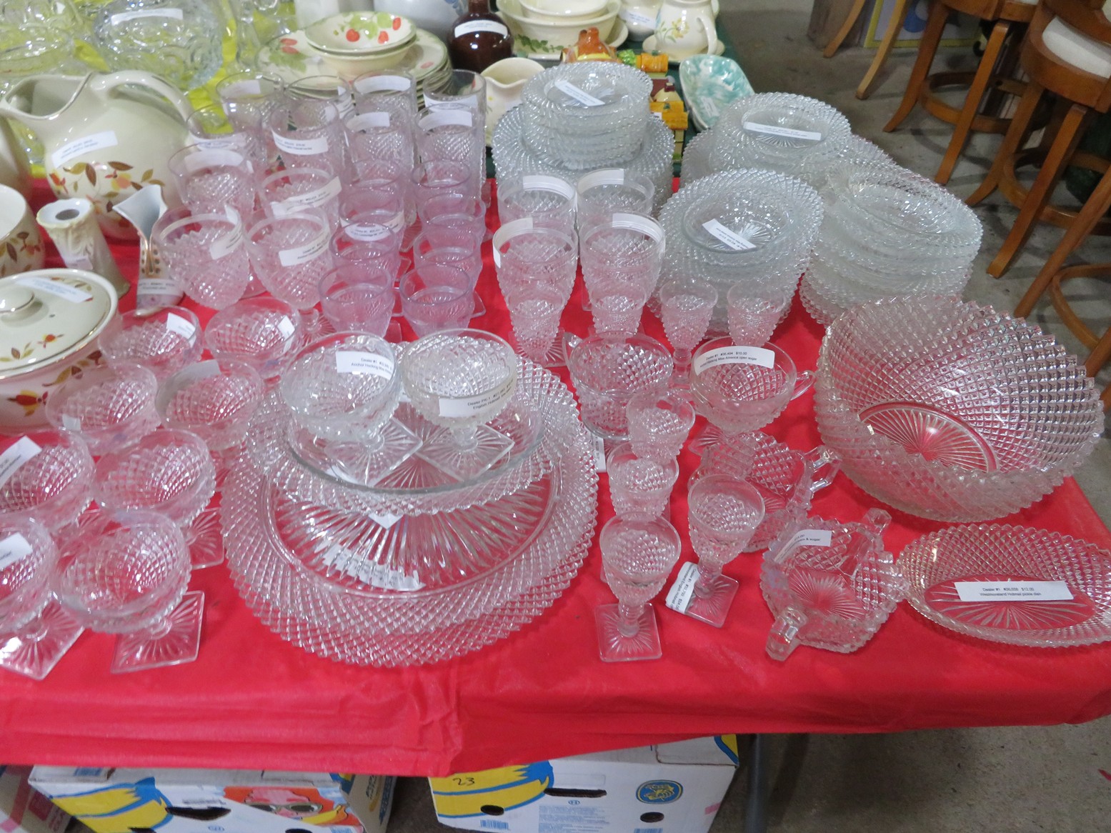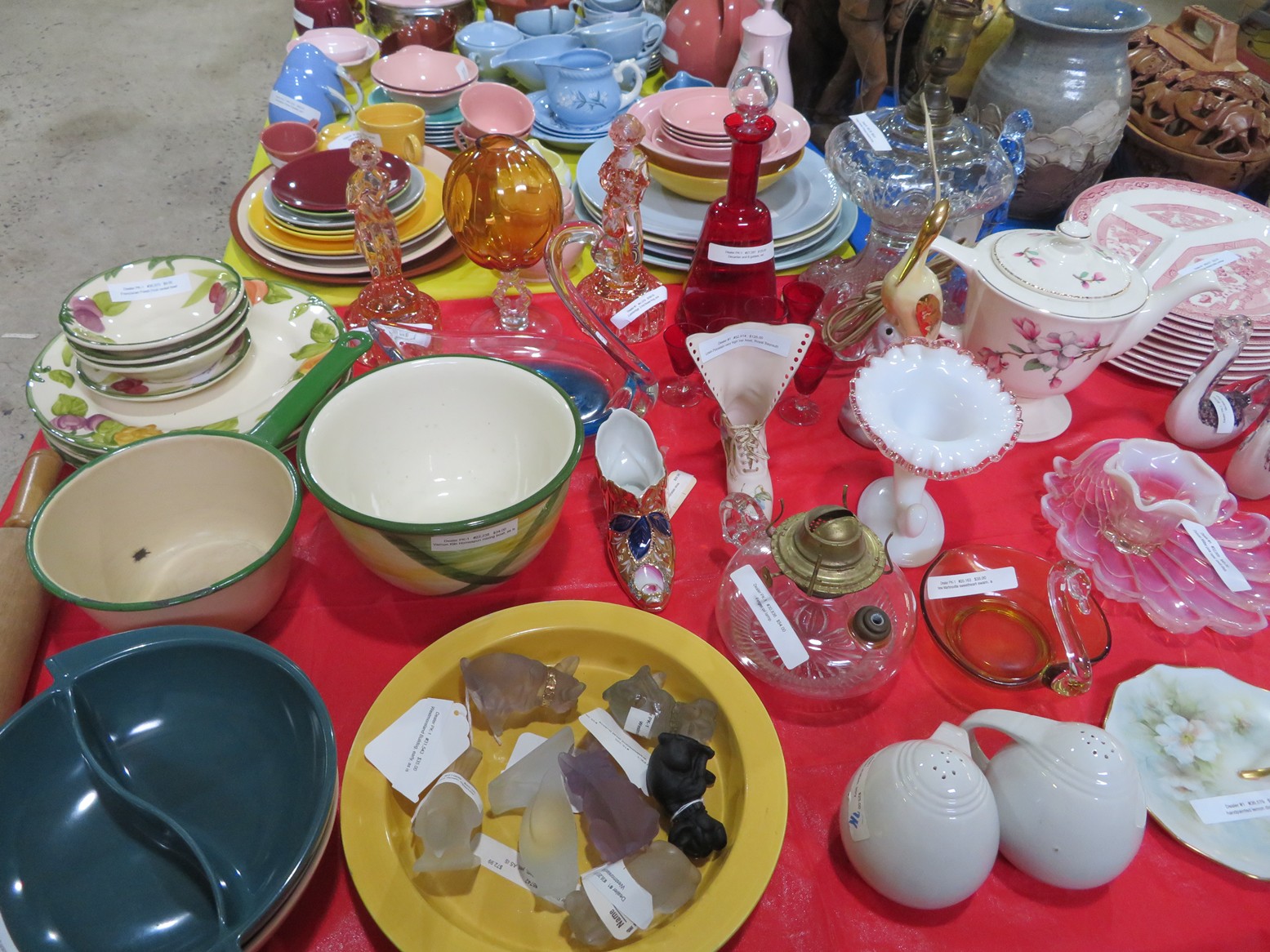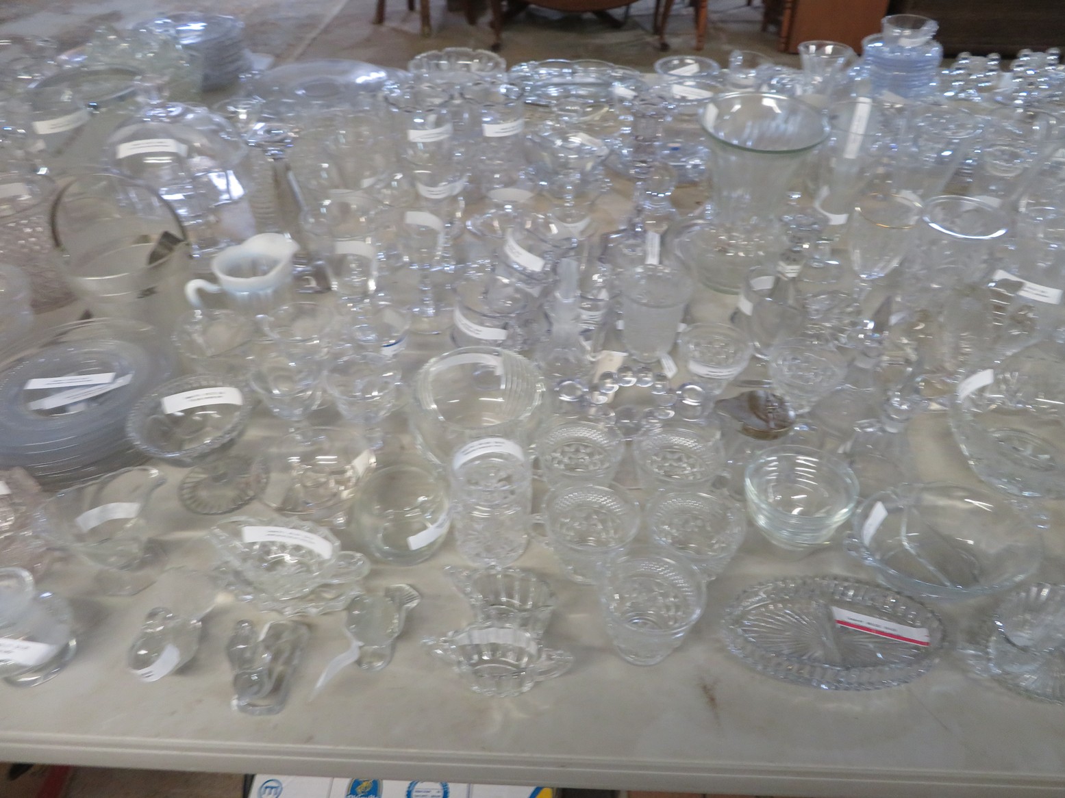 Lots & lots of clear glass animals as figurines, bowls, cups & more; Glass swans; Candlesticks; Crystal bowl; Art glass; Perfume bottles; Glass basket; Fostoria American collection; Ruby cut to clear; Frosted figure; Colored flower frogs; Paperweights; Pyrex bowls; Decanters; Glass baskets; Glass animals; Fenton silver crest cornucopia; Oil lamp; Vases; Moon & Stars bowl; Pitchers; Silver overlay; Lots of colored glass; Cambridge; Depression glass; Goblets; Large set of diamon pattern glassware; Cake stand with dome; Lots of glass shoes; Jamestown glasses; Milk glass; Clear flower frogs; Candlewick; Serving pieces; Candy dishes; S&P shakers; Cake plate; Ice bucket; Refrigerator box and much more!