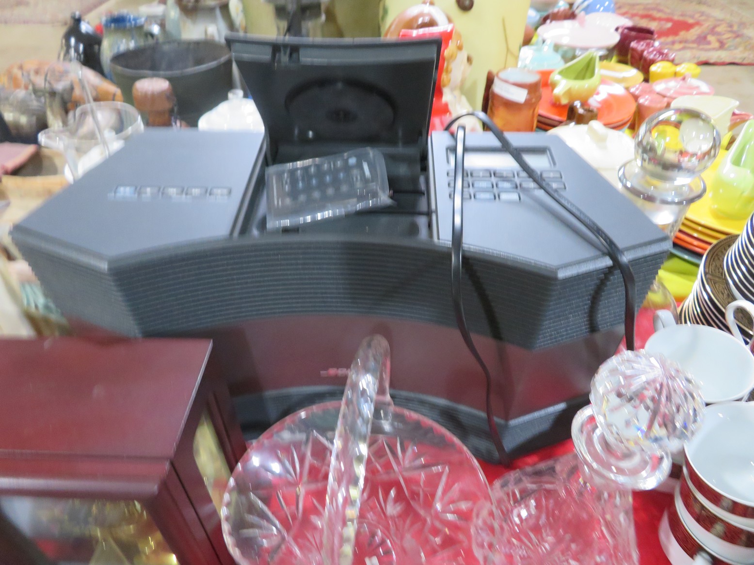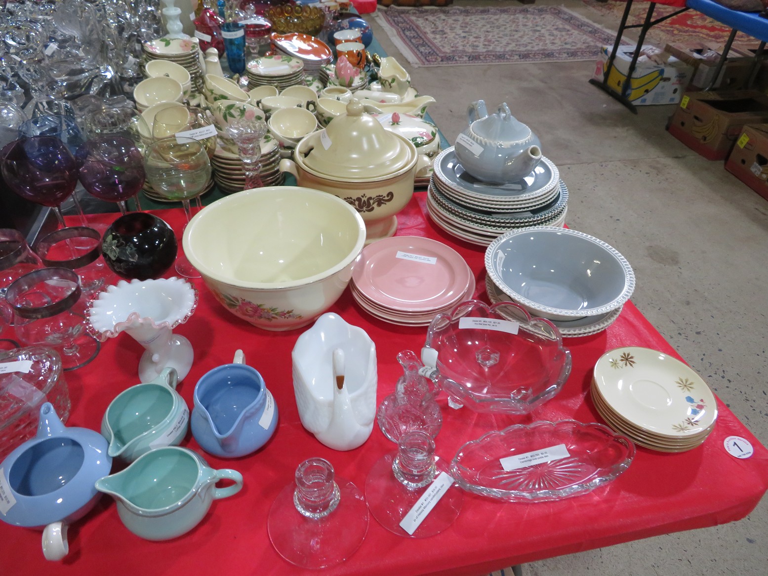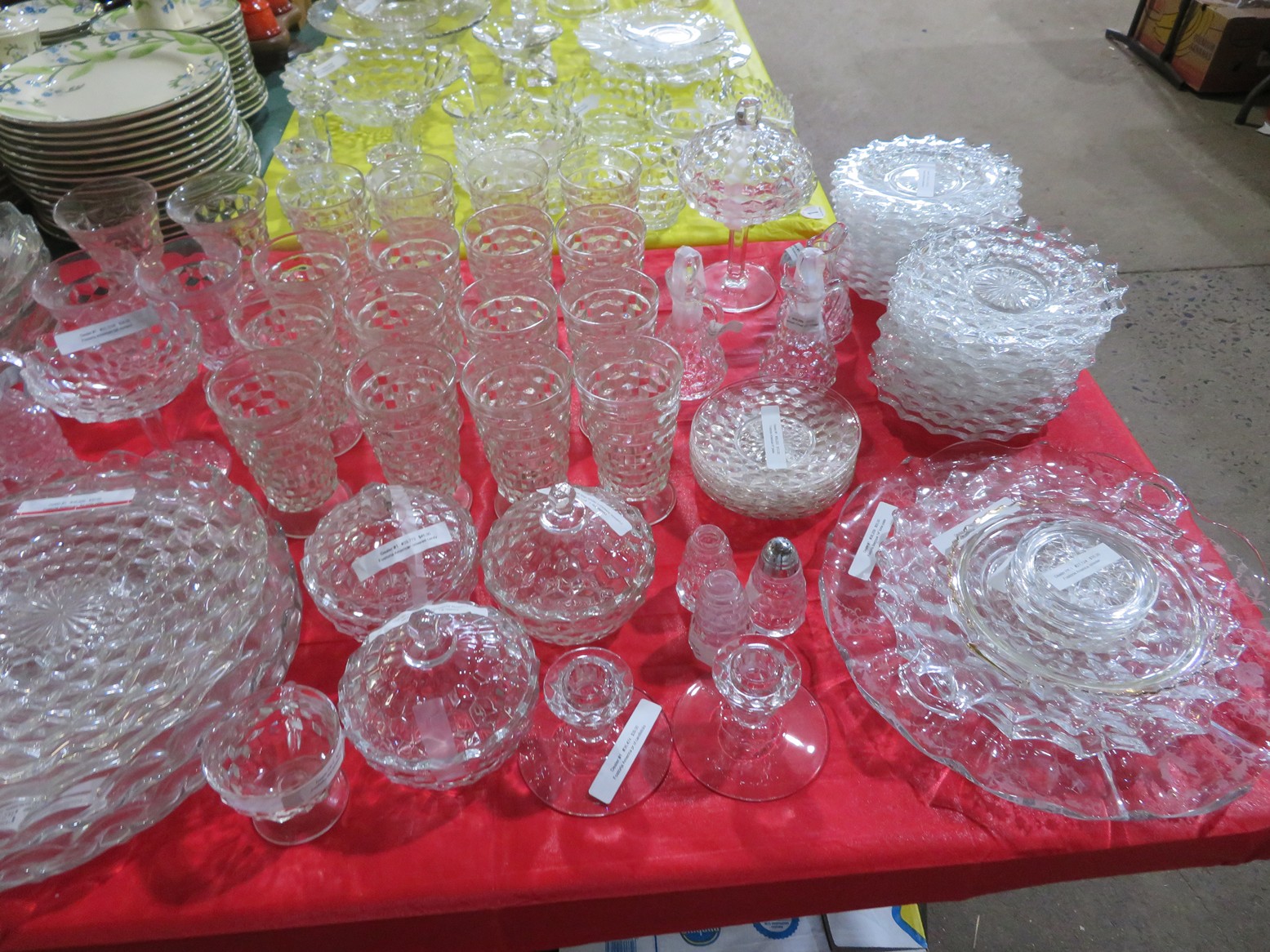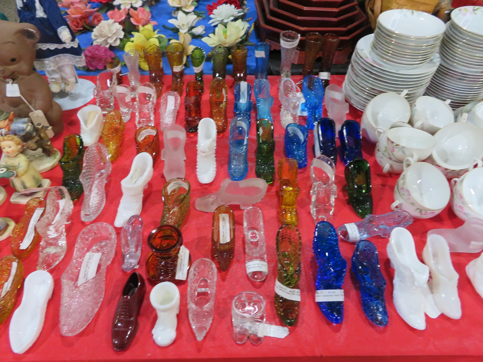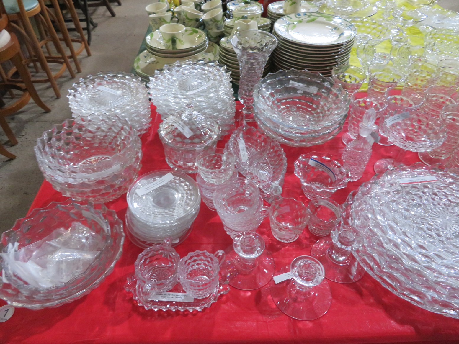 Lots & lots of clear glass animals as figurines, bowls, cups & more; Glass swans; Candlesticks; Crystal bowl; Art glass; Perfume bottles; Glass basket; Fostoria American collection; Ruby cut to clear; Frosted figure; Colored flower frogs; Paperweights; Pyrex bowls; Decanters; Glass baskets; Glass animals; Fenton silver crest cornucopia; Oil lamp; Vases; Moon & Stars bowl; Pitchers; Silver overlay; Lots of colored glass; Cambridge; Depression glass; Goblets; Large set of diamon pattern glassware; Cake stand with dome; Lots of glass shoes; Jamestown glasses; Milk glass; Clear flower frogs; Candlewick; Serving pieces; Candy dishes; S&P shakers; Cake plate; Ice bucket; Refrigerator box and much more!