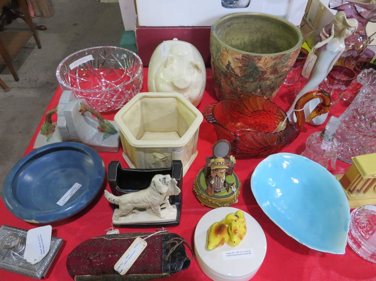 CHINA & GLASS: Quimper coffeepot, sugar & cup & saucer; Toby mugs; Nativity set; Roseville double handled vase; Fine ceramics; Belleek owl vase; Lladro; Goebel bluebird & double duck covered trinket boxes; Bookends; Red Willow divided plates; Planters; Belleek pitcher; Noritake condiment set on tray; Native American made pottery; Fruit & vegetable towers centerpieces; Tall Oriental vase pair; Corning ware; Rose Medallion dish; MCM ball S&P; Hand-painted lemon server; Metlox/Vernon Kilns plaid Tam-o’Shanter mixing bowl; Fuit edged plates; Fiesta, Lu-Ray Pastels & more MCM dinnerware; Cookie jars; Large Franciscan Desert Rose dinnerware set;