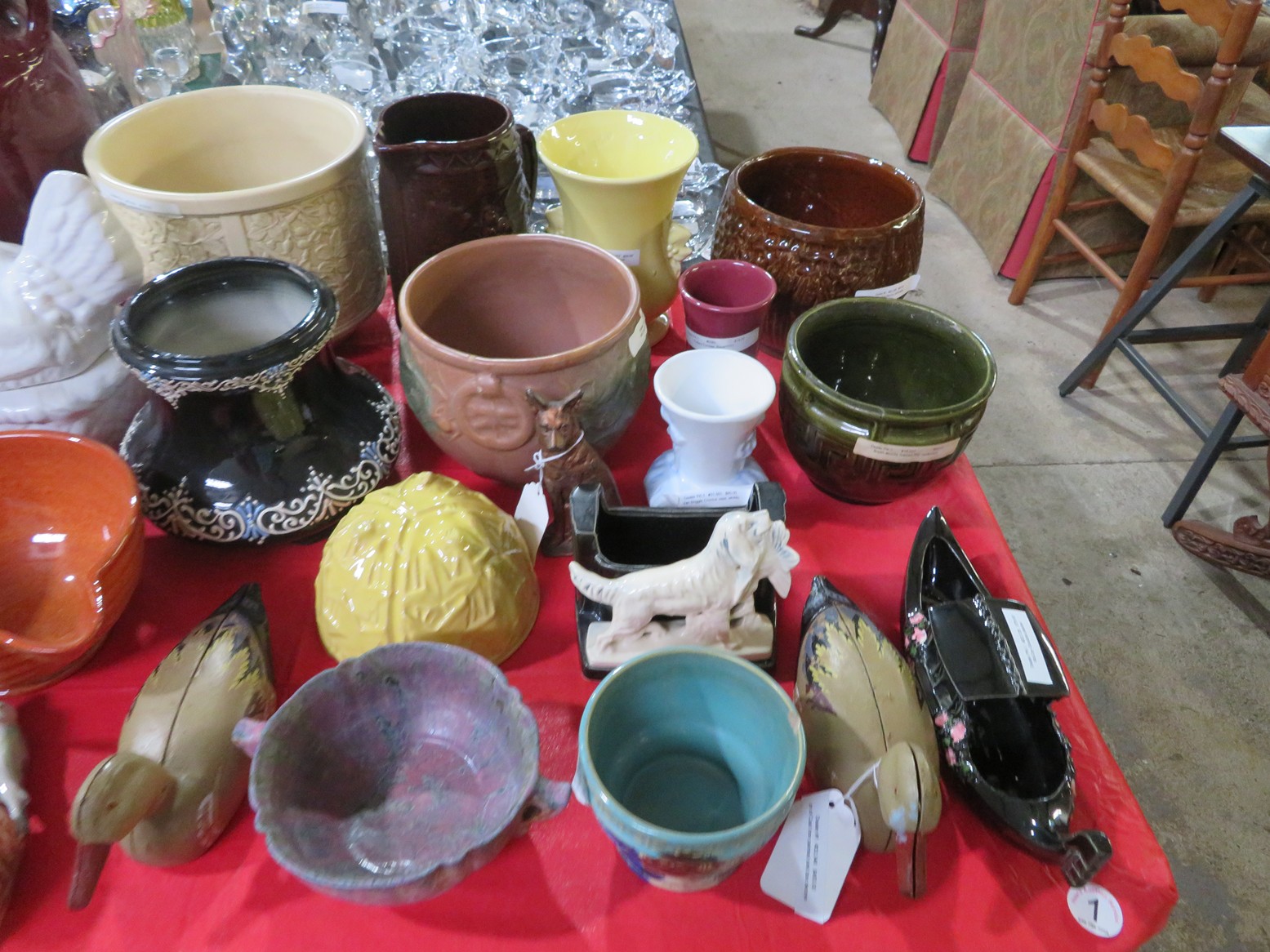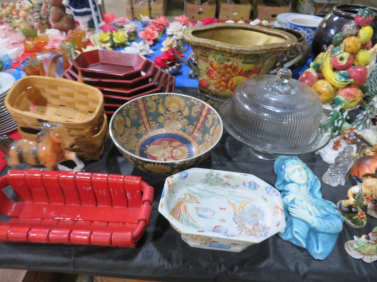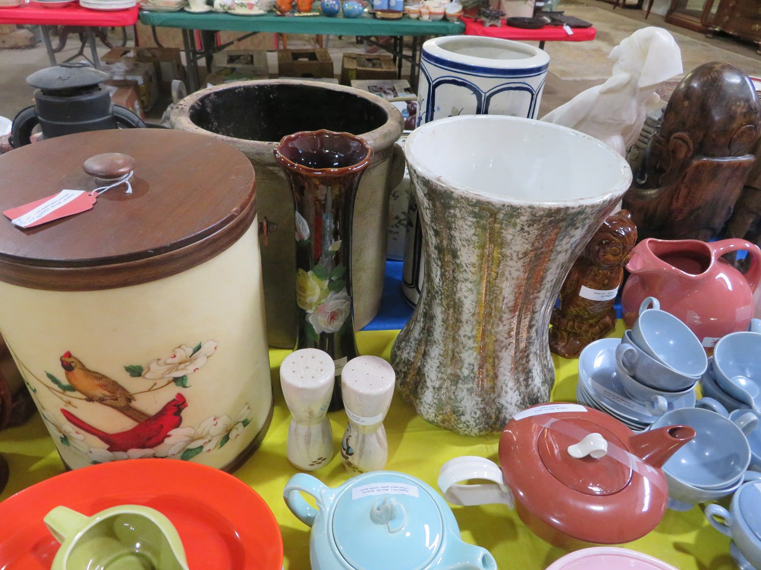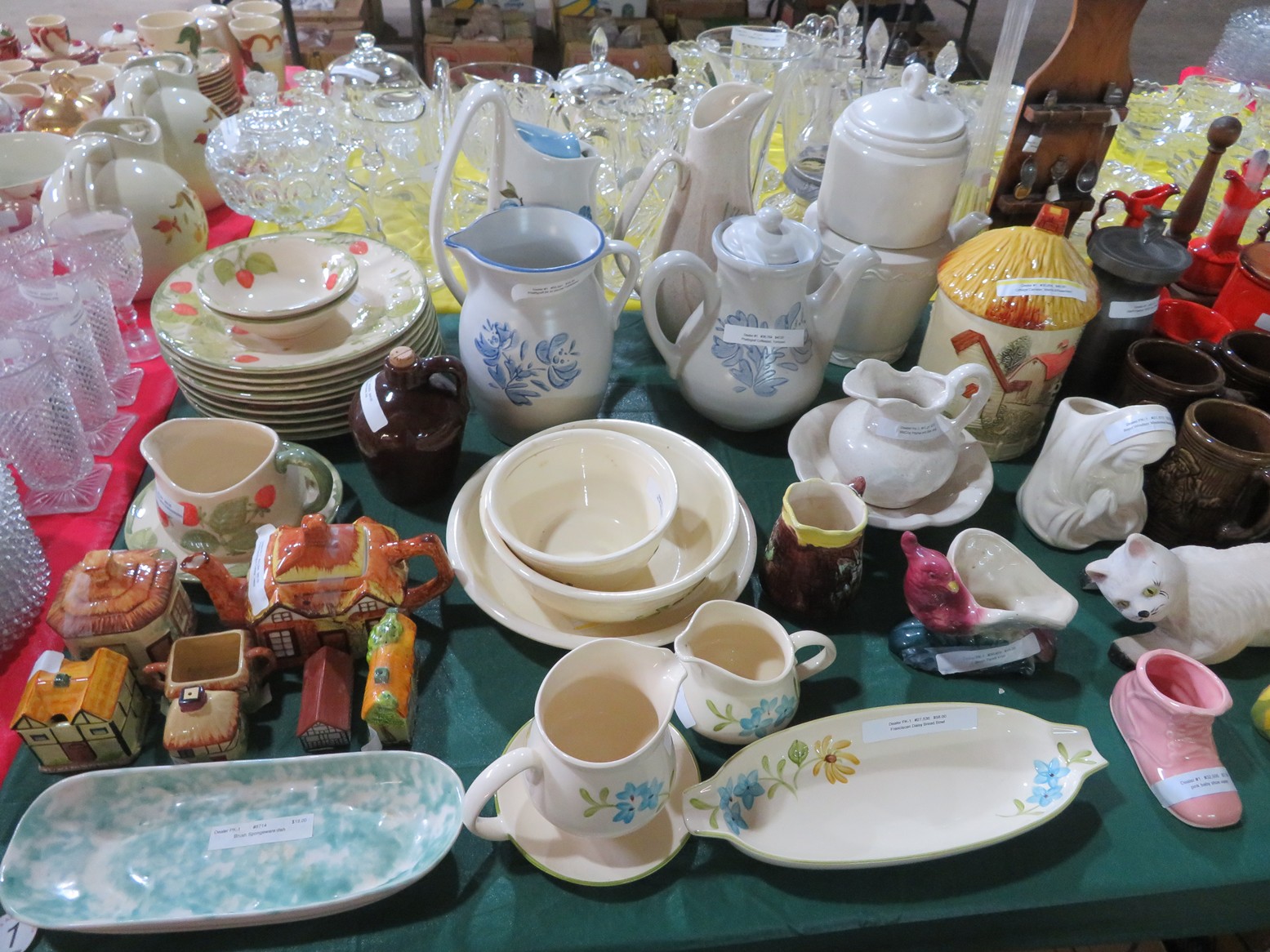 Fine dinnerware sets; Wedgwood; Studio pottery; Oriental ceramics; Colorful chicken statue; Floor vases; Figurines; Creamer & sugar set; Coffeepots; Terra cotta warrior; Pitchers; Stein; Pomegranate; Shoes; Lusterware set; Hen on nest; Wall pocket; Lots of MCM pottery; Batter bowl; Pfaltzgraf; Harker; Goebel monk S&P; Hall Jewel Tea Autum Leaf; Apple ware pottery; Cottage ware; Franciscan; Hummels galore! Capodimonte flowers; Crocks;