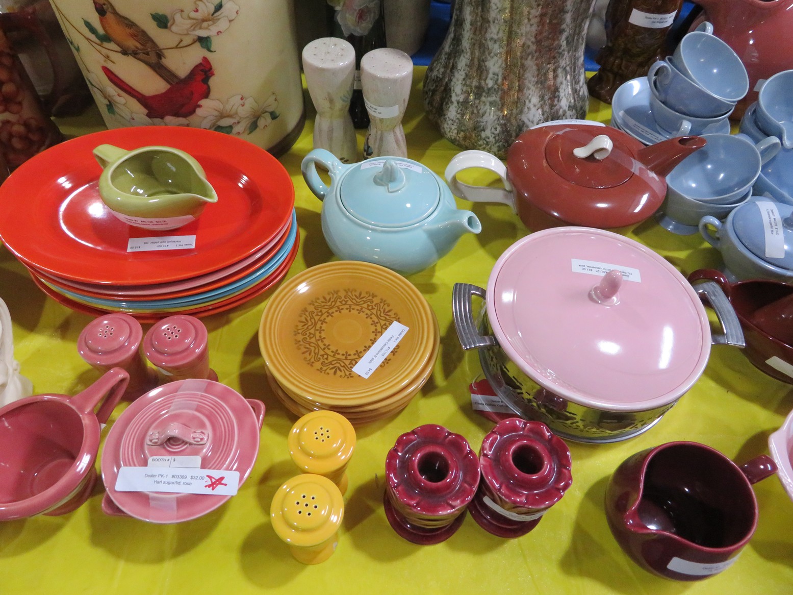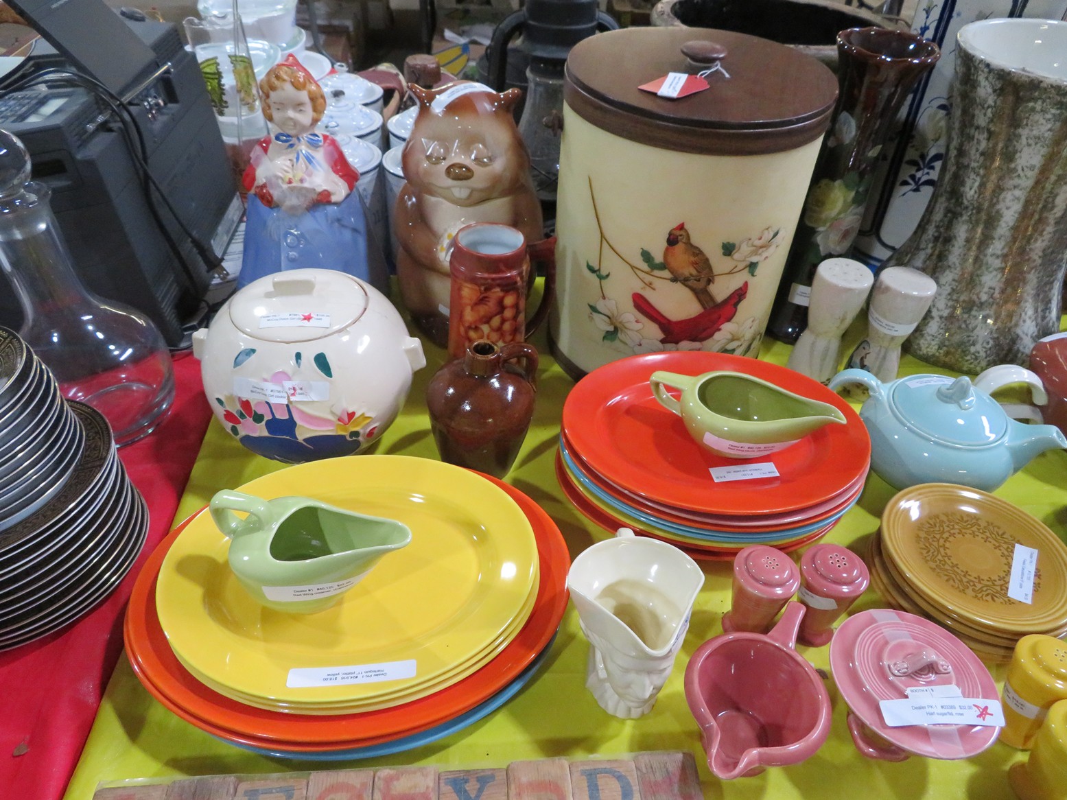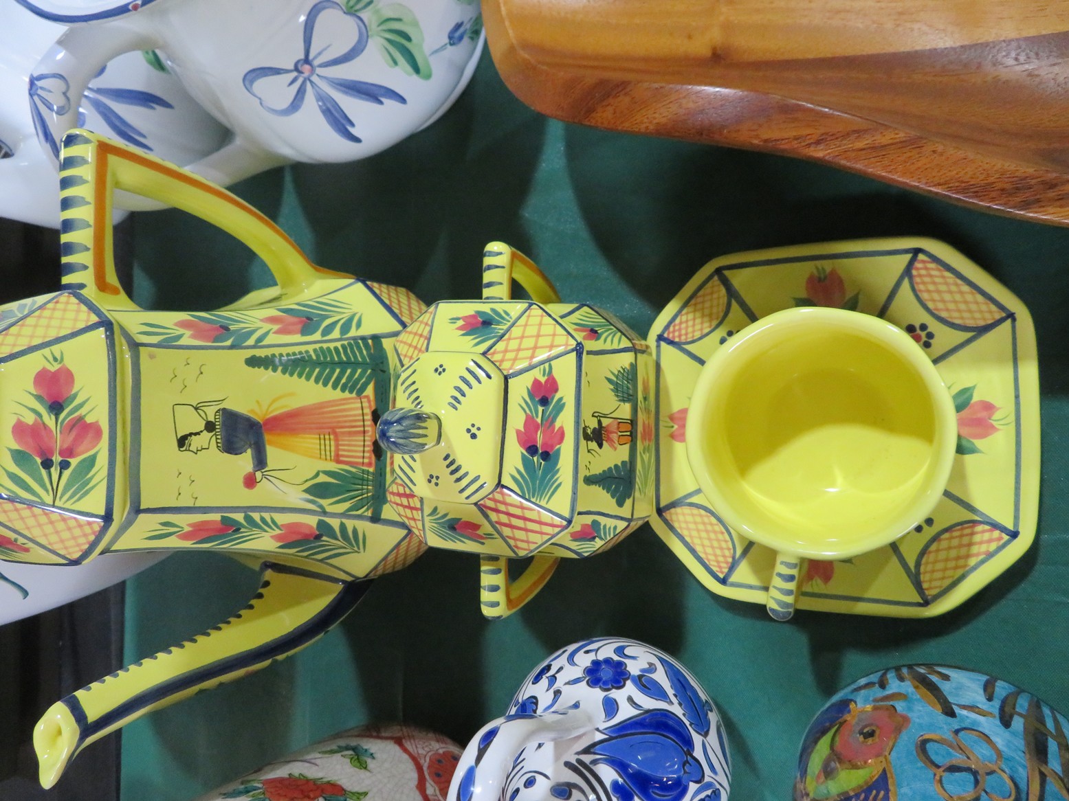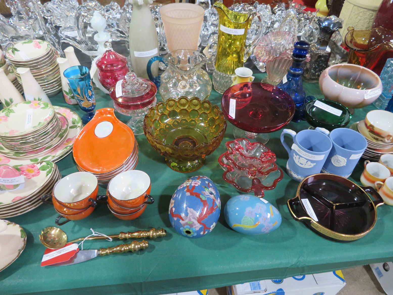Fine dinnerware sets; Wedgwood; Studio pottery; Oriental ceramics; Colorful chicken statue; Floor vases; Figurines; Creamer & sugar set; Coffeepots; Terra cotta warrior; Pitchers; Stein; Pomegranate; Shoes; Lusterware set; Hen on nest; Wall pocket; Lots of MCM pottery; Batter bowl; Pfaltzgraf; Harker; Goebel monk S&P; Hall Jewel Tea Autum Leaf; Apple ware pottery; Cottage ware; Franciscan; Hummels galore! Capodimonte flowers; Crocks;
