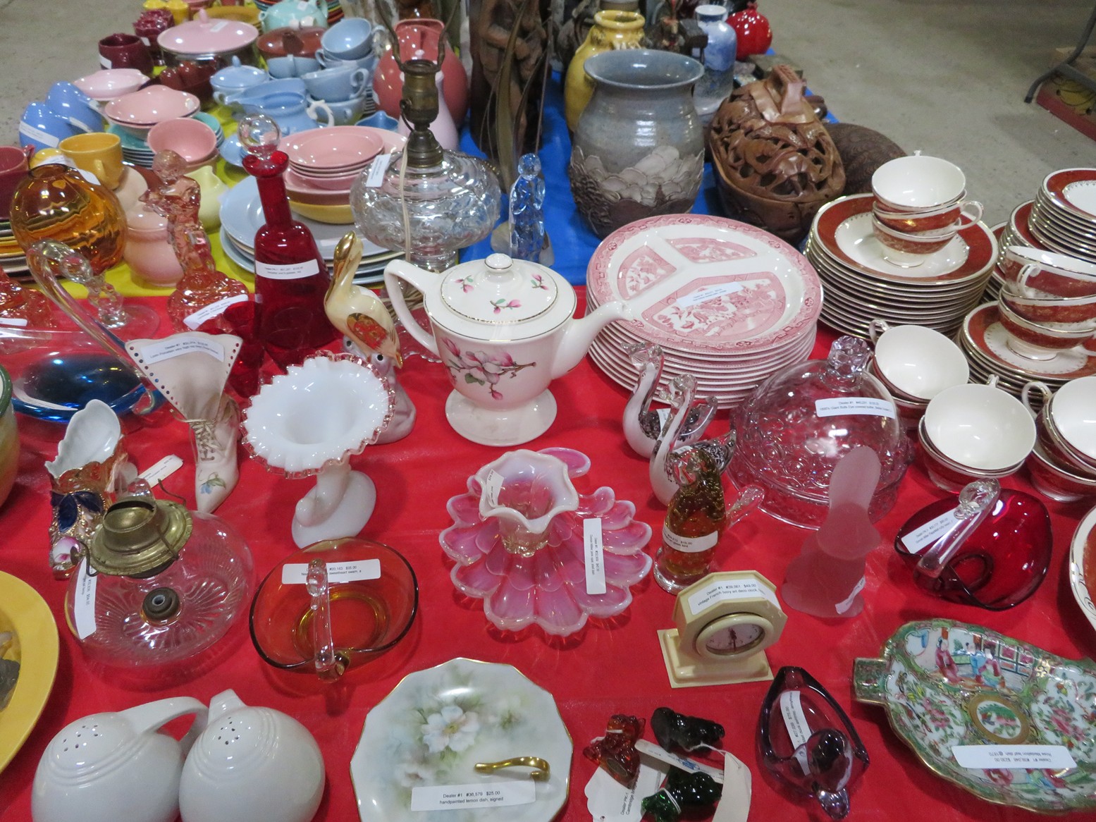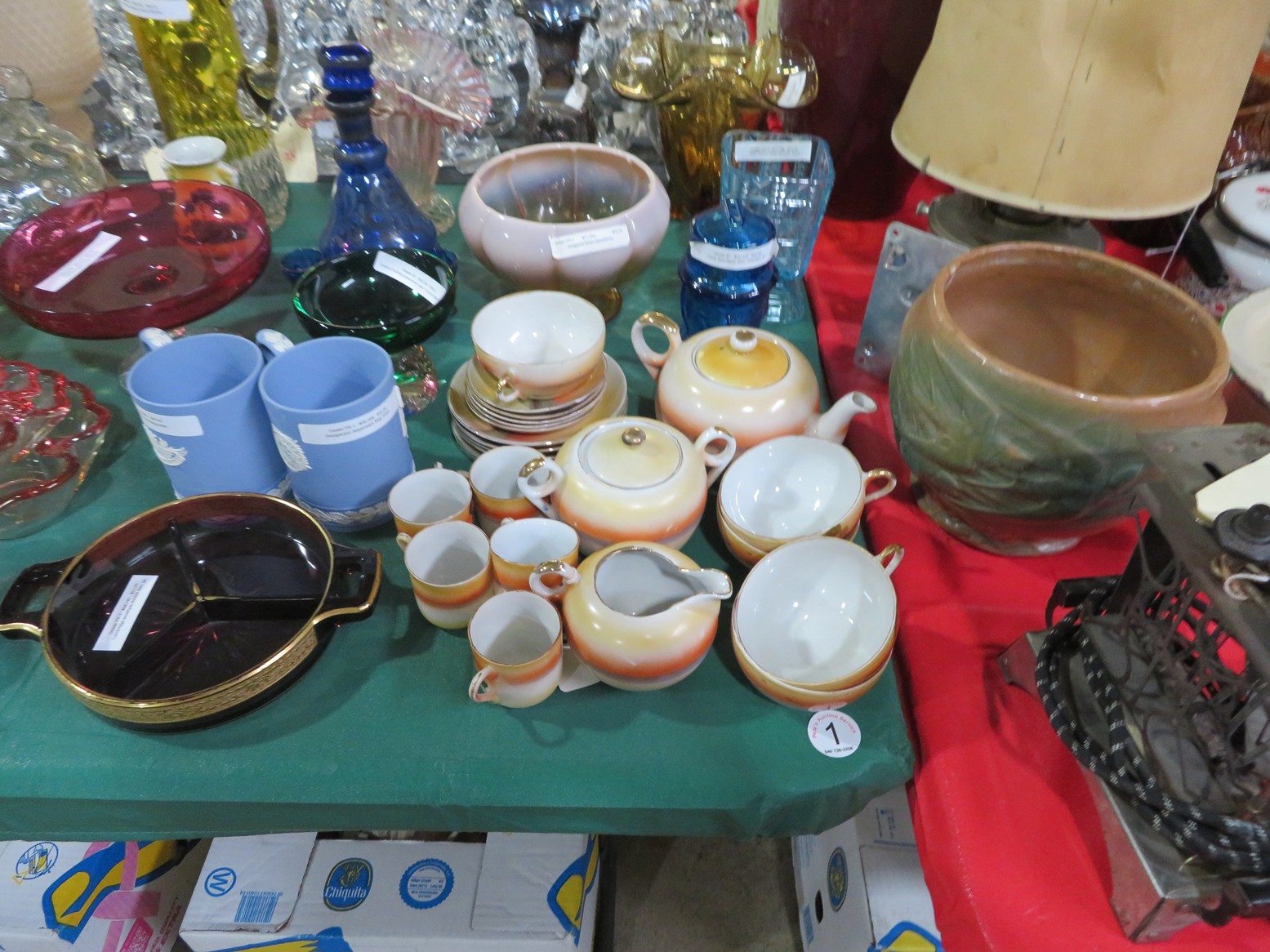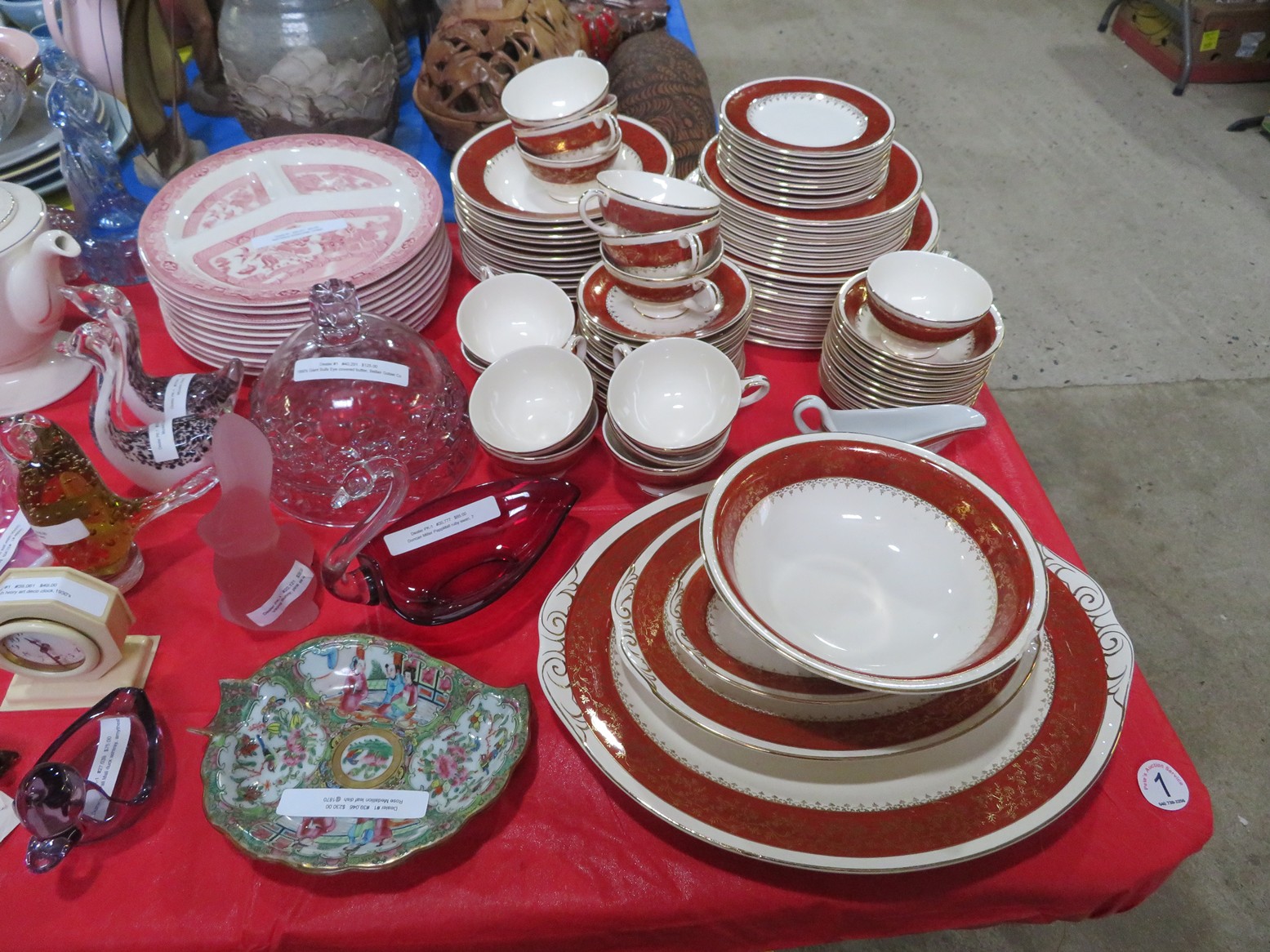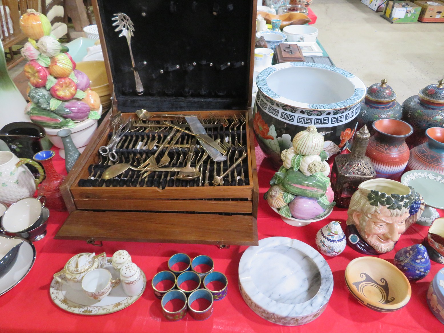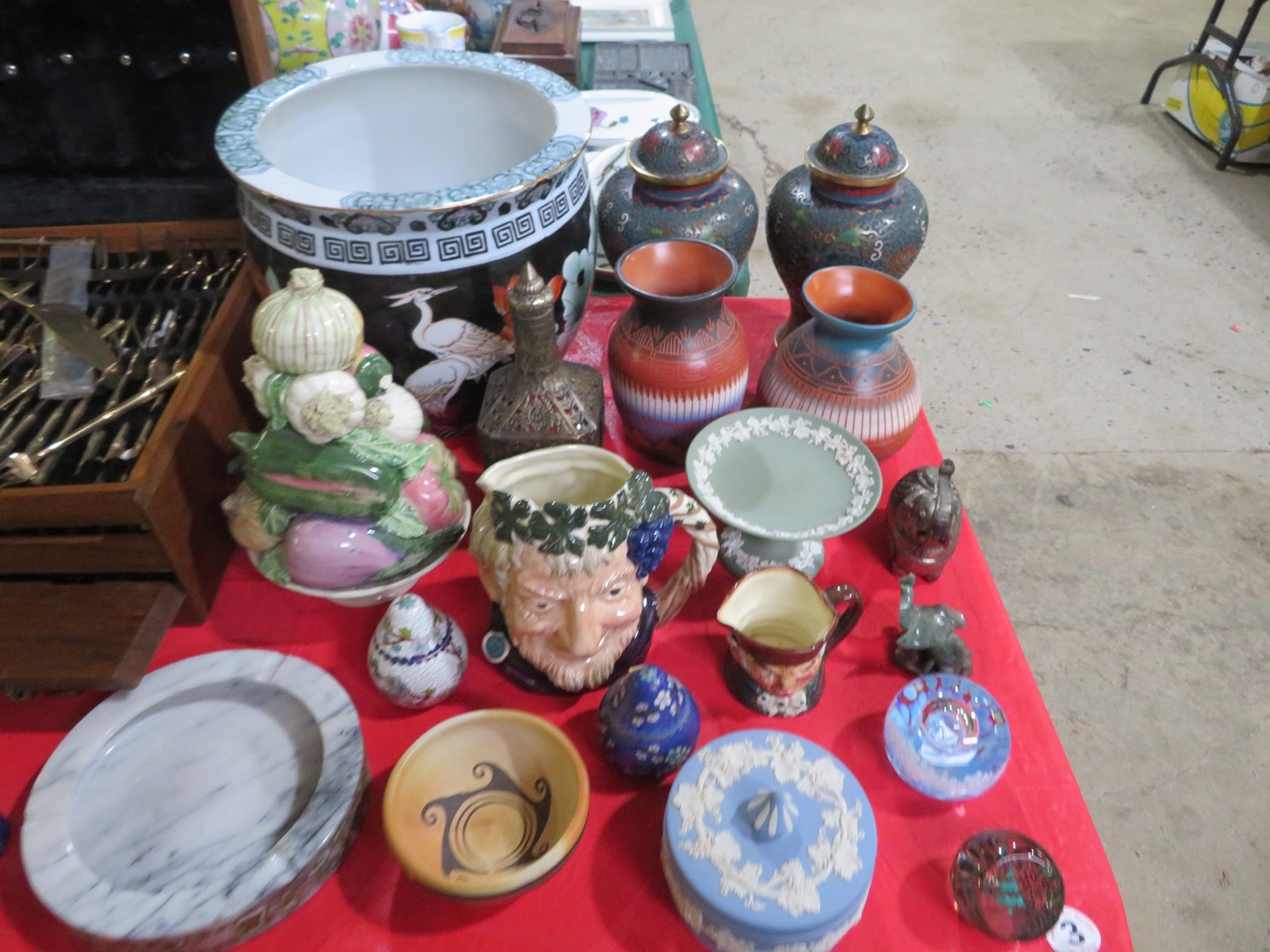 Fine dinnerware sets; Wedgwood; Studio pottery; Oriental ceramics; Colorful chicken statue; Floor vases; Figurines; Creamer & sugar set; Coffeepots; Terra cotta warrior; Pitchers; Stein; Pomegranate; Shoes; Lusterware set; Hen on nest; Wall pocket; Lots of MCM pottery; Batter bowl; Pfaltzgraf; Harker; Goebel monk S&P; Hall Jewel Tea Autum Leaf; Apple ware pottery; Cottage ware; Franciscan; Hummels galore! Capodimonte flowers; Crocks;