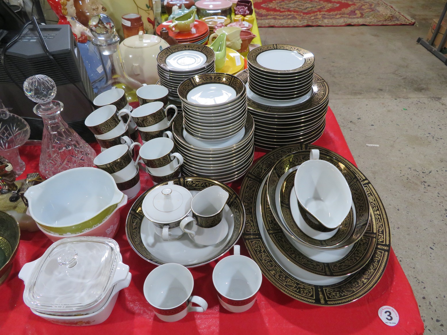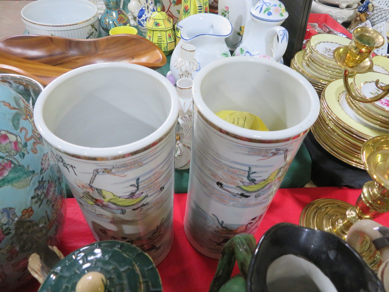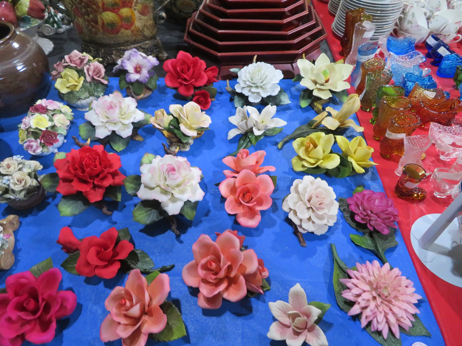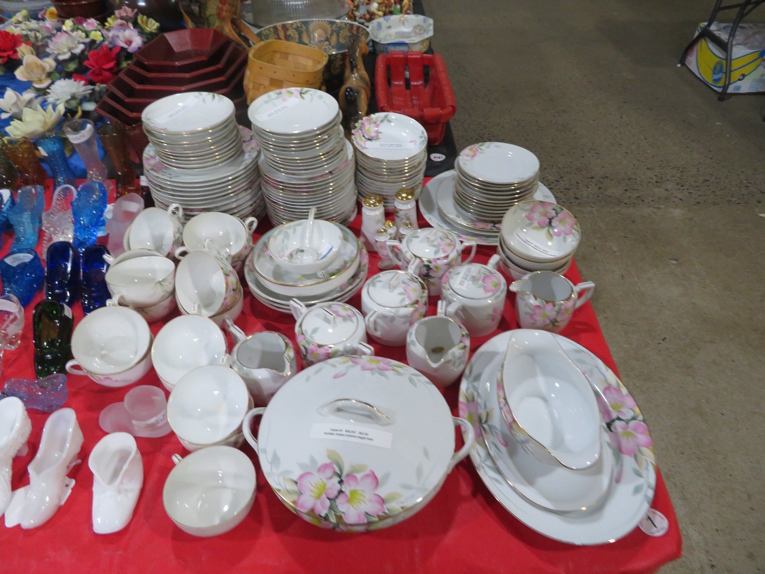 Fine dinnerware sets; Wedgwood; Studio pottery; Oriental ceramics; Colorful chicken statue; Floor vases; Figurines; Creamer & sugar set; Coffeepots; Terra cotta warrior; Pitchers; Stein; Pomegranate; Shoes; Lusterware set; Hen on nest; Wall pocket; Lots of MCM pottery; Batter bowl; Pfaltzgraf; Harker; Goebel monk S&P; Hall Jewel Tea Autum Leaf; Apple ware pottery; Cottage ware; Franciscan; Hummels galore! Capodimonte flowers; Crocks;