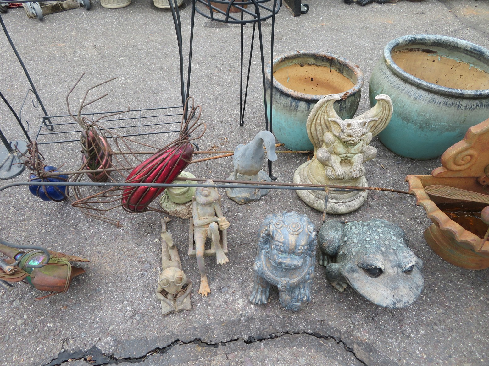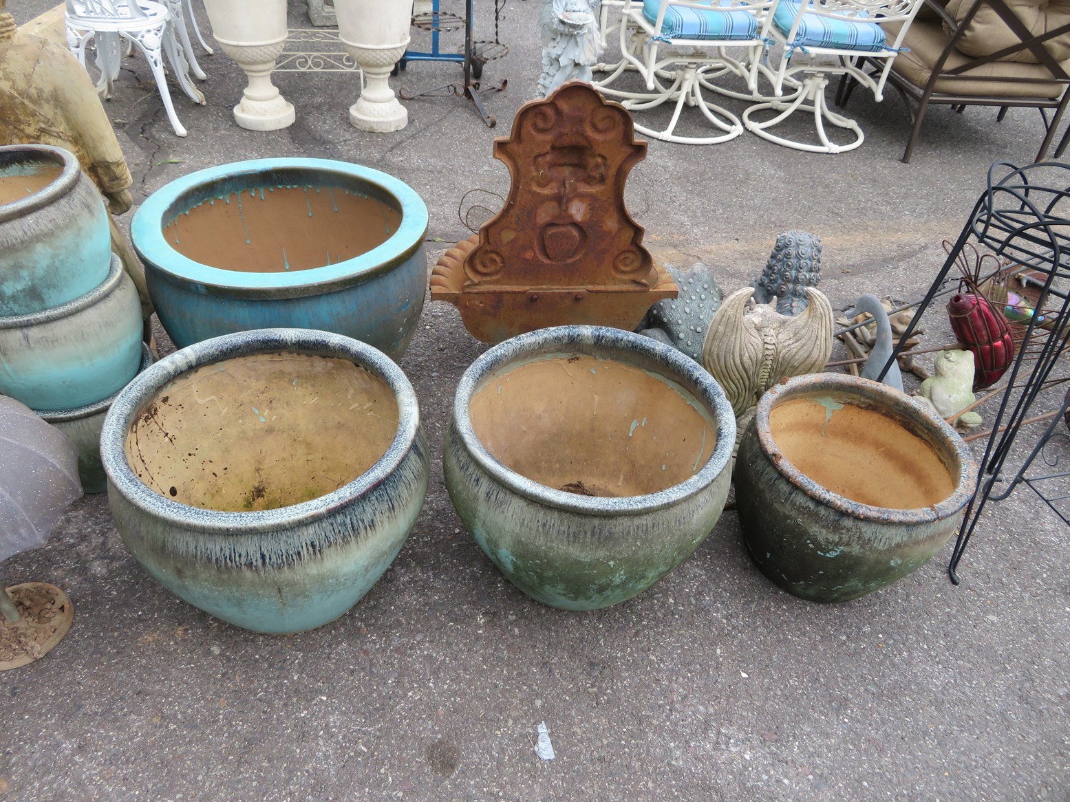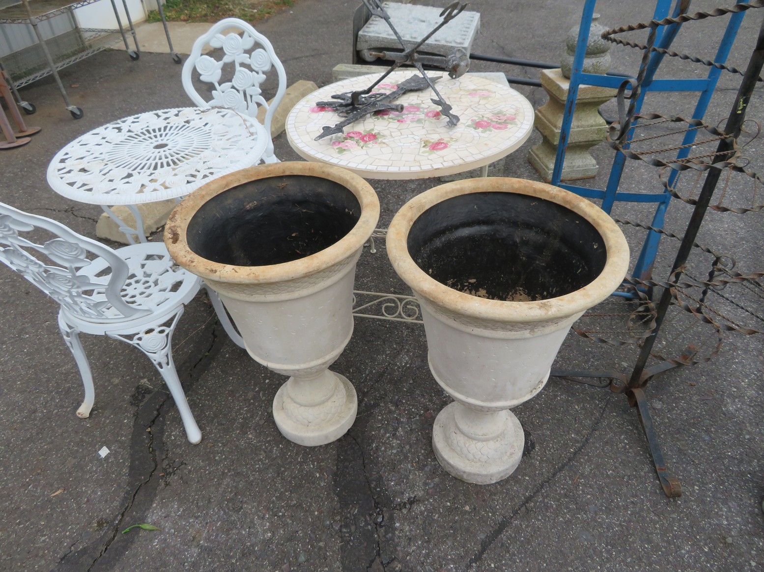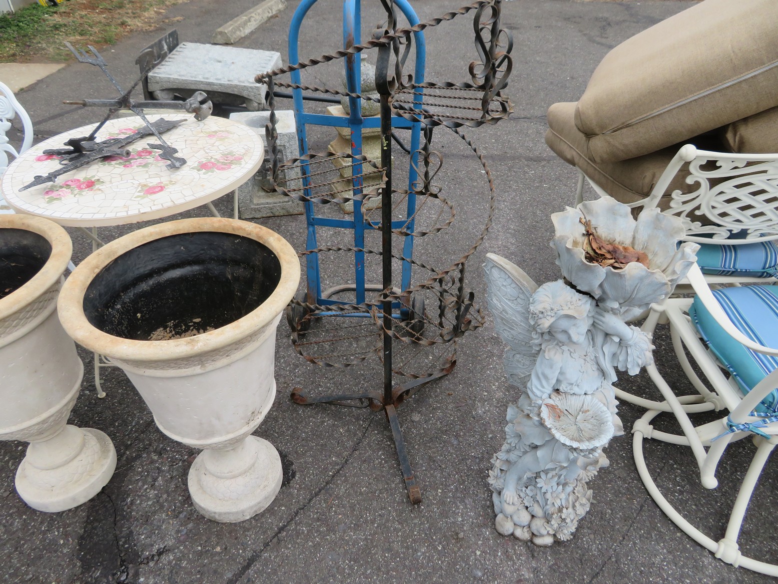 Cast iron corn stick pan; Cornbread wedge cast iron pan; Old brass hanging scales; Enamel ware kettle with lid; Decorated enamel ware kettle; Baskets; Garden statues; Urns; Pagoda lights; Large collection of handled planters; Pedestals; Cast iron table & chairs; Tile top outdoor table set; Wrought iron tea cart; Milk can; Folding chairs; Wrought iron patio furniture; Poolside furniture; Sunburst plaque; MUCH MUCH MORE!!!!!!