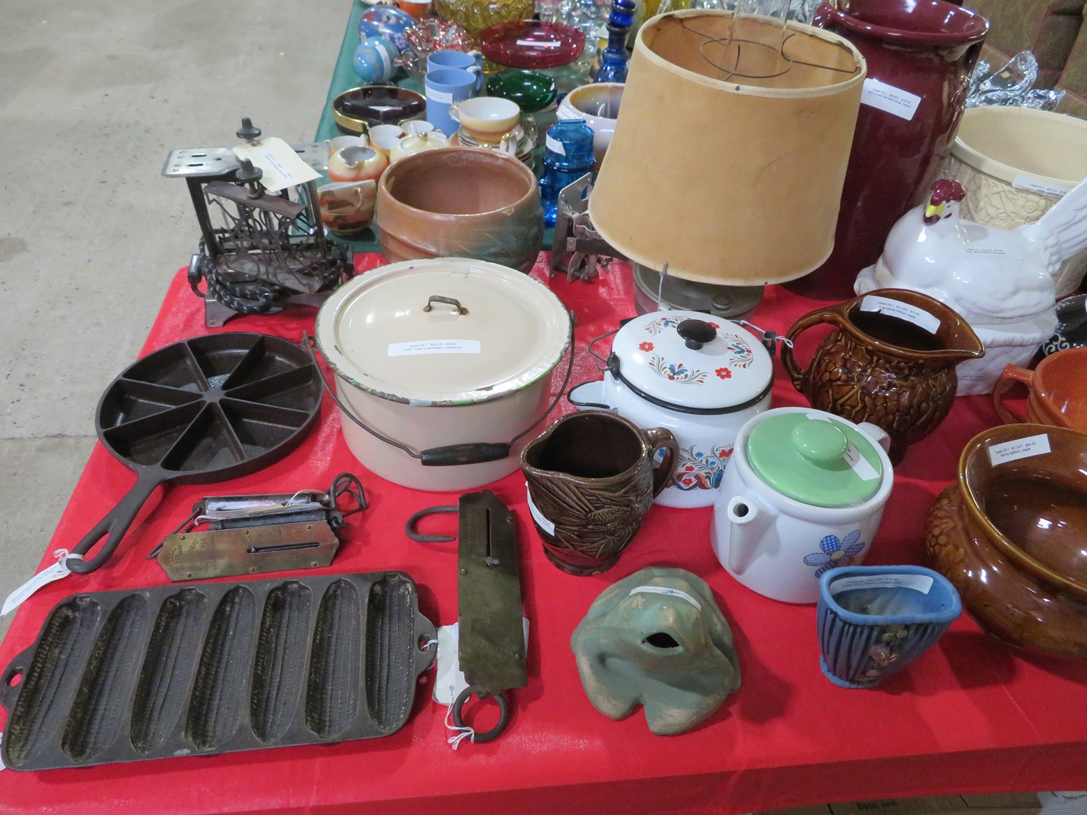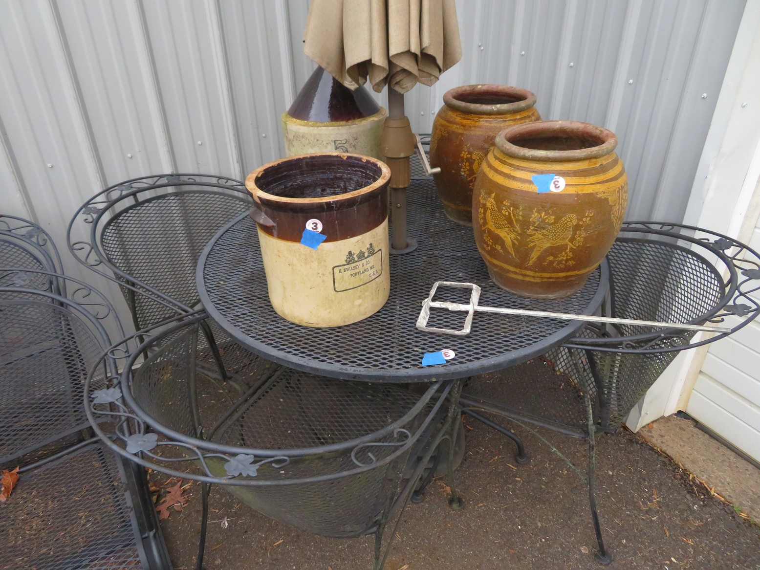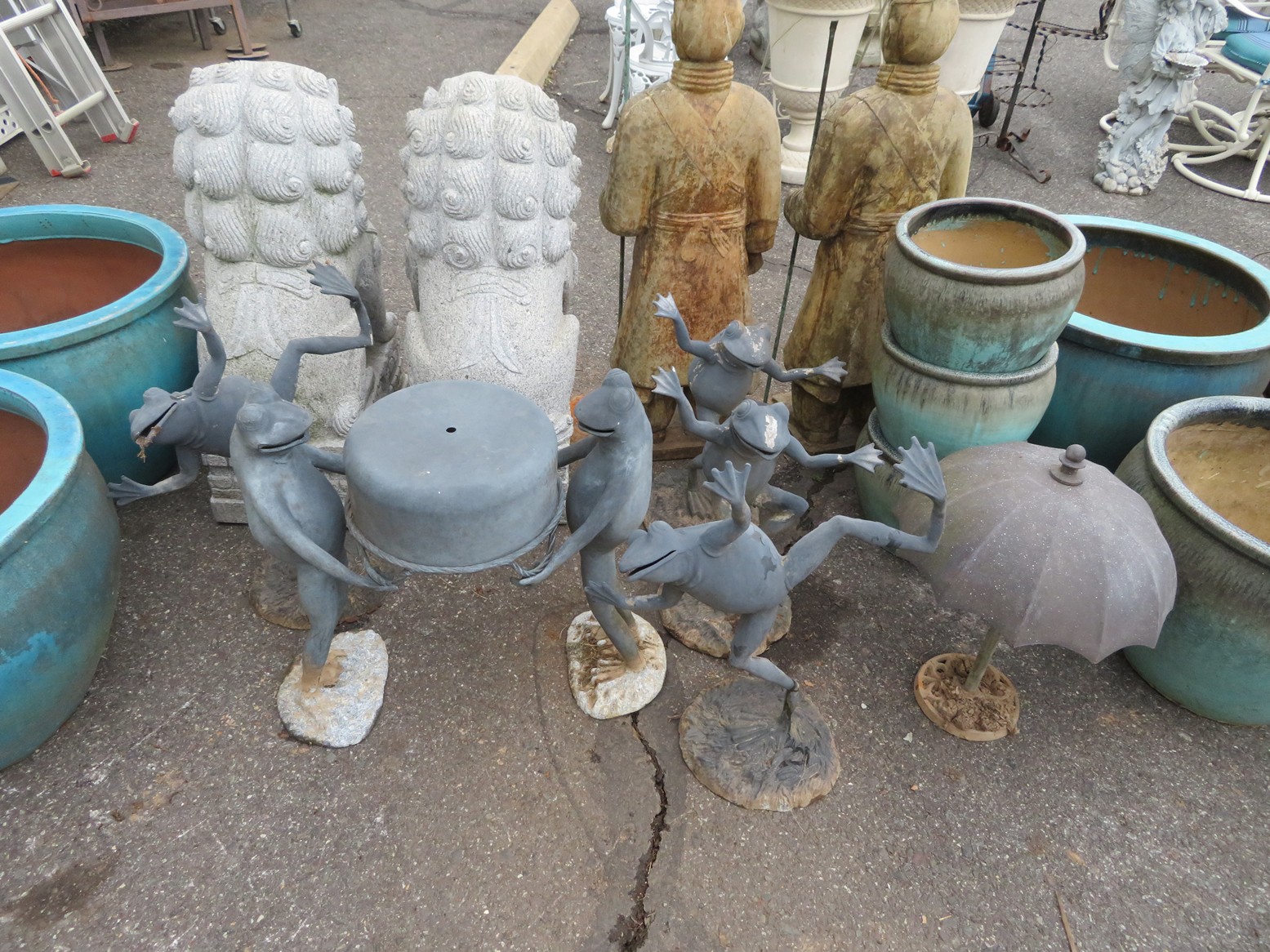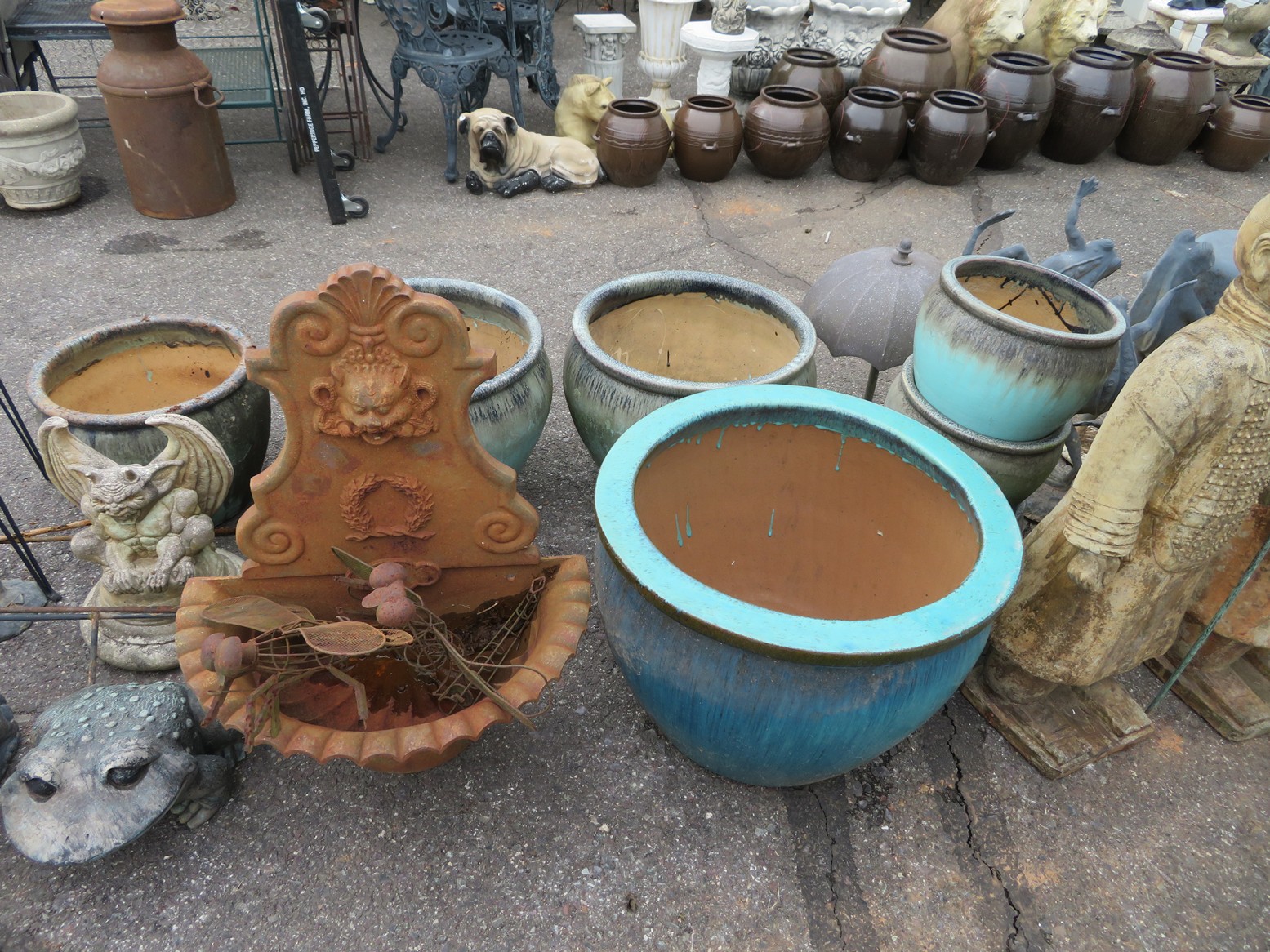 Cast iron corn stick pan; Cornbread wedge cast iron pan; Old brass hanging scales; Enamel ware kettle with lid; Decorated enamel ware kettle; Baskets; Garden statues; Urns; Pagoda lights; Large collection of handled planters; Pedestals; Cast iron table & chairs; Tile top outdoor table set; Wrought iron tea cart; Milk can; Folding chairs; Wrought iron patio furniture; Poolside furniture; Sunburst plaque; MUCH MUCH MORE!!!!!!