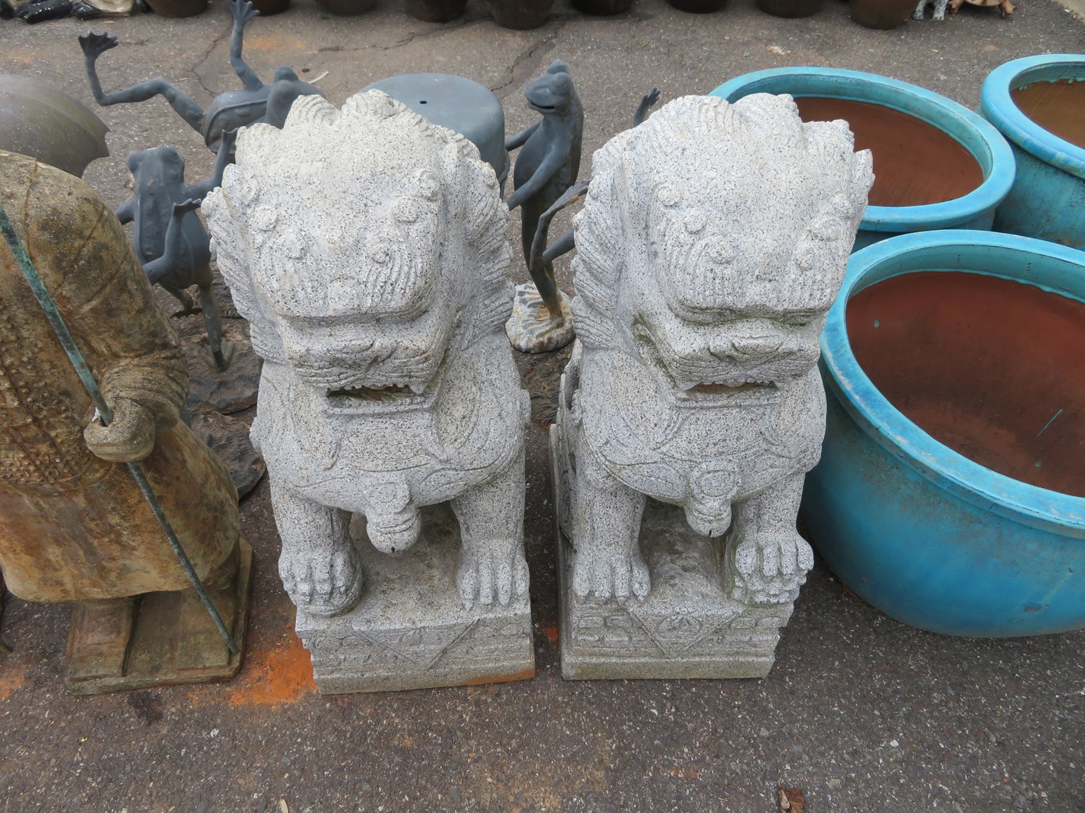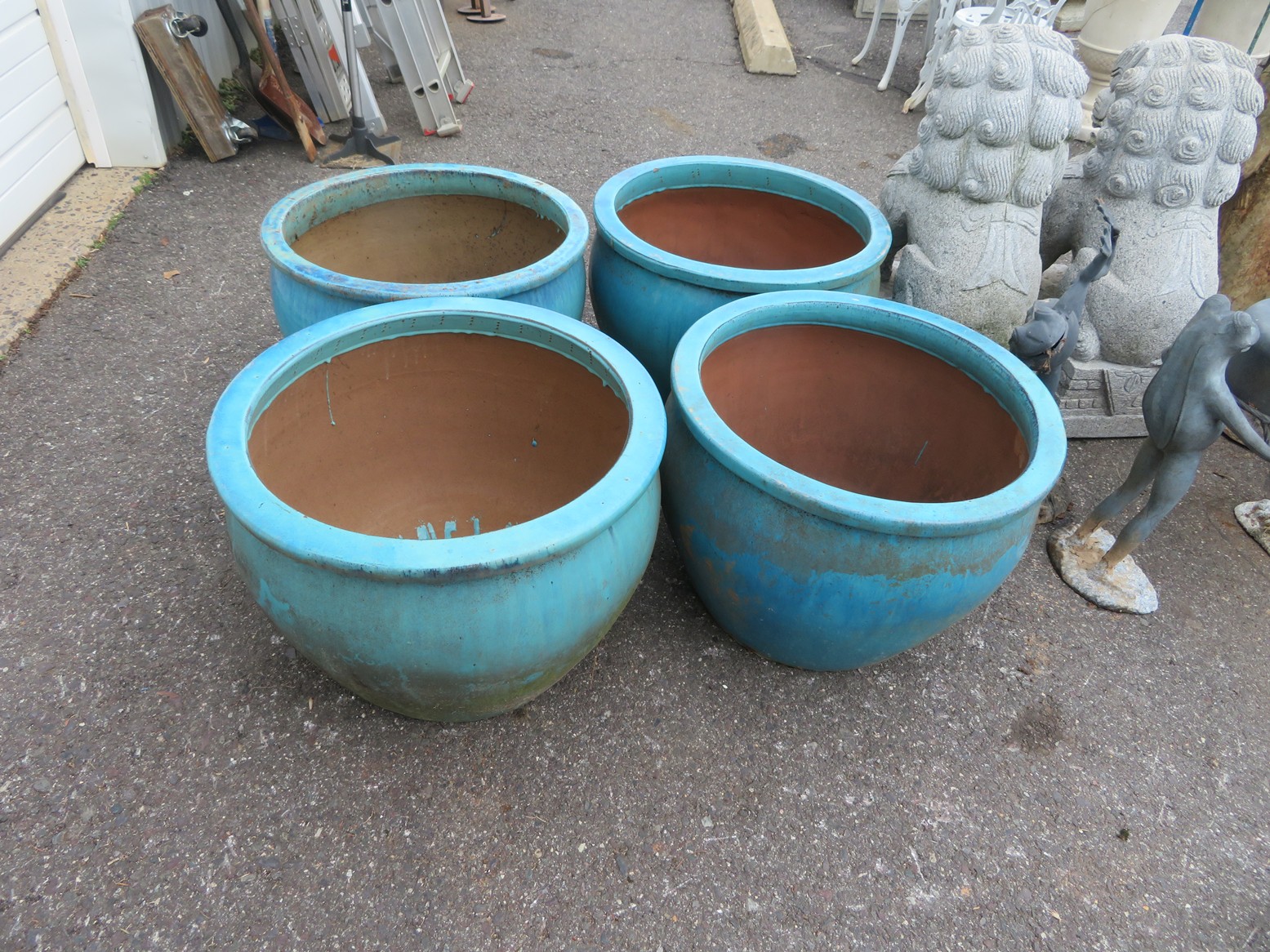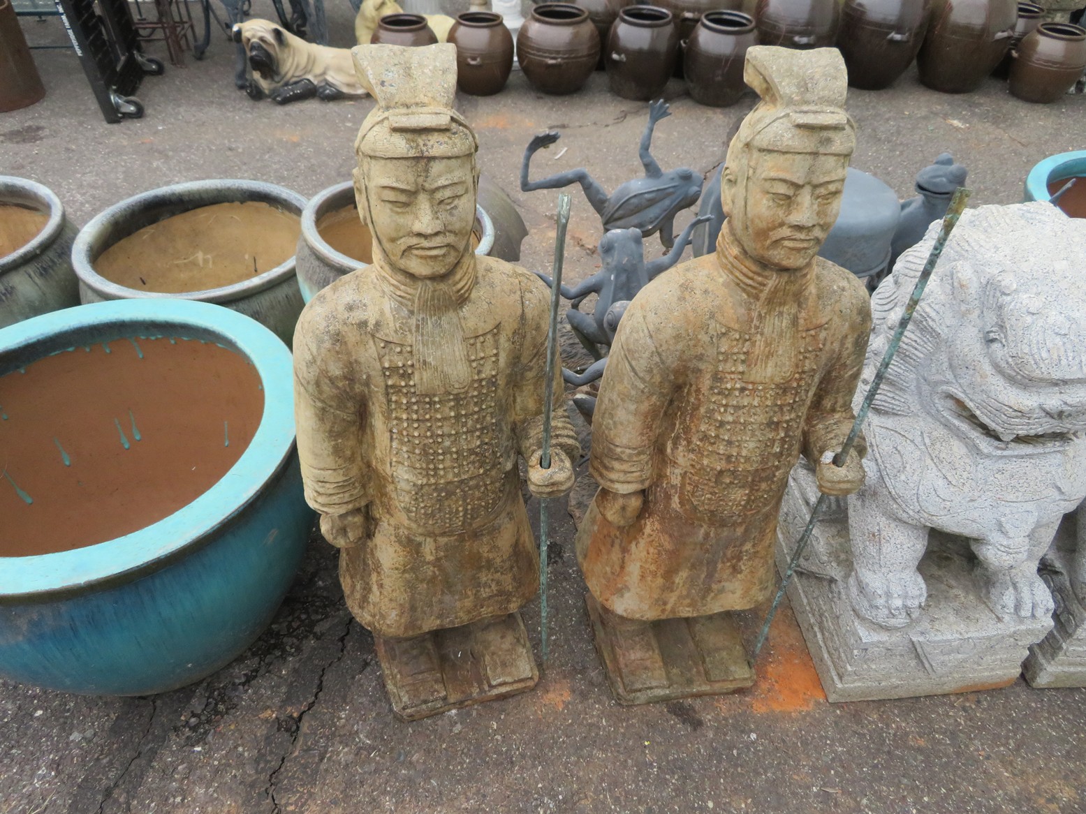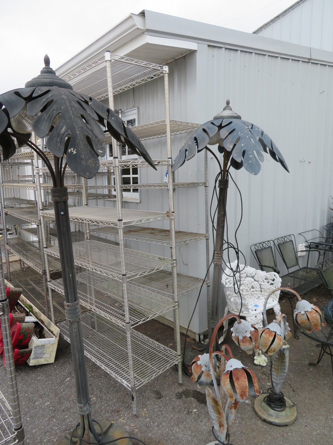 Cast iron corn stick pan; Cornbread wedge cast iron pan; Old brass hanging scales; Enamel ware kettle with lid; Decorated enamel ware kettle; Baskets; Garden statues; Urns; Pagoda lights; Large collection of handled planters; Pedestals; Cast iron table & chairs; Tile top outdoor table set; Wrought iron tea cart; Milk can; Folding chairs; Wrought iron patio furniture; Poolside furniture; Sunburst plaque; MUCH MUCH MORE!!!!!!