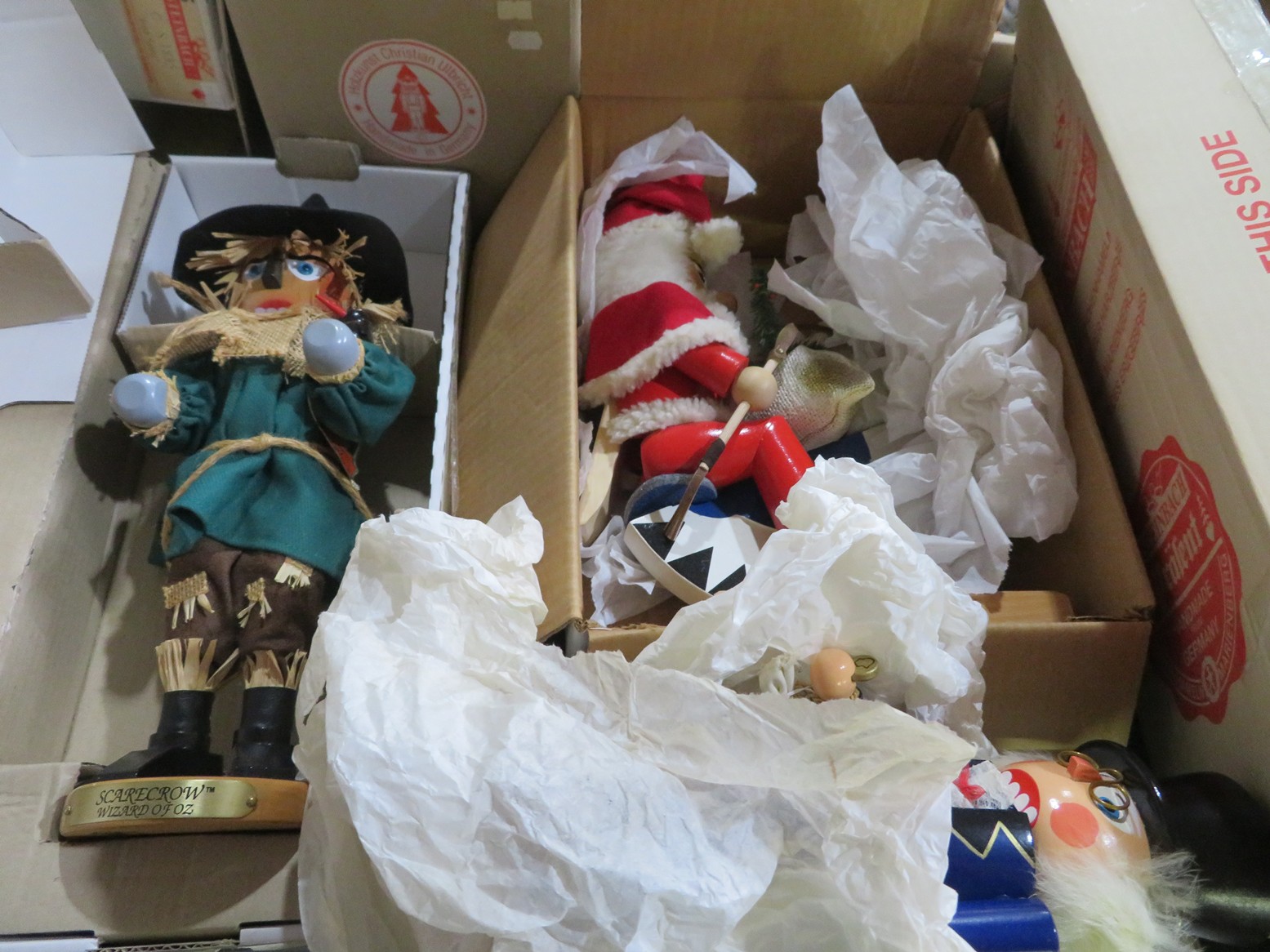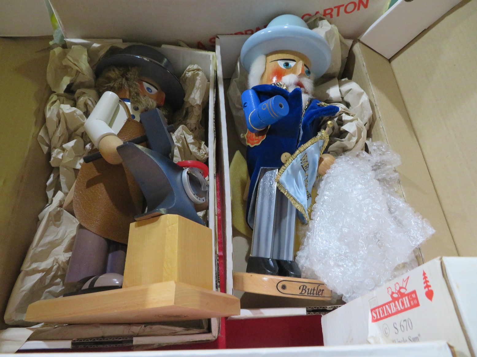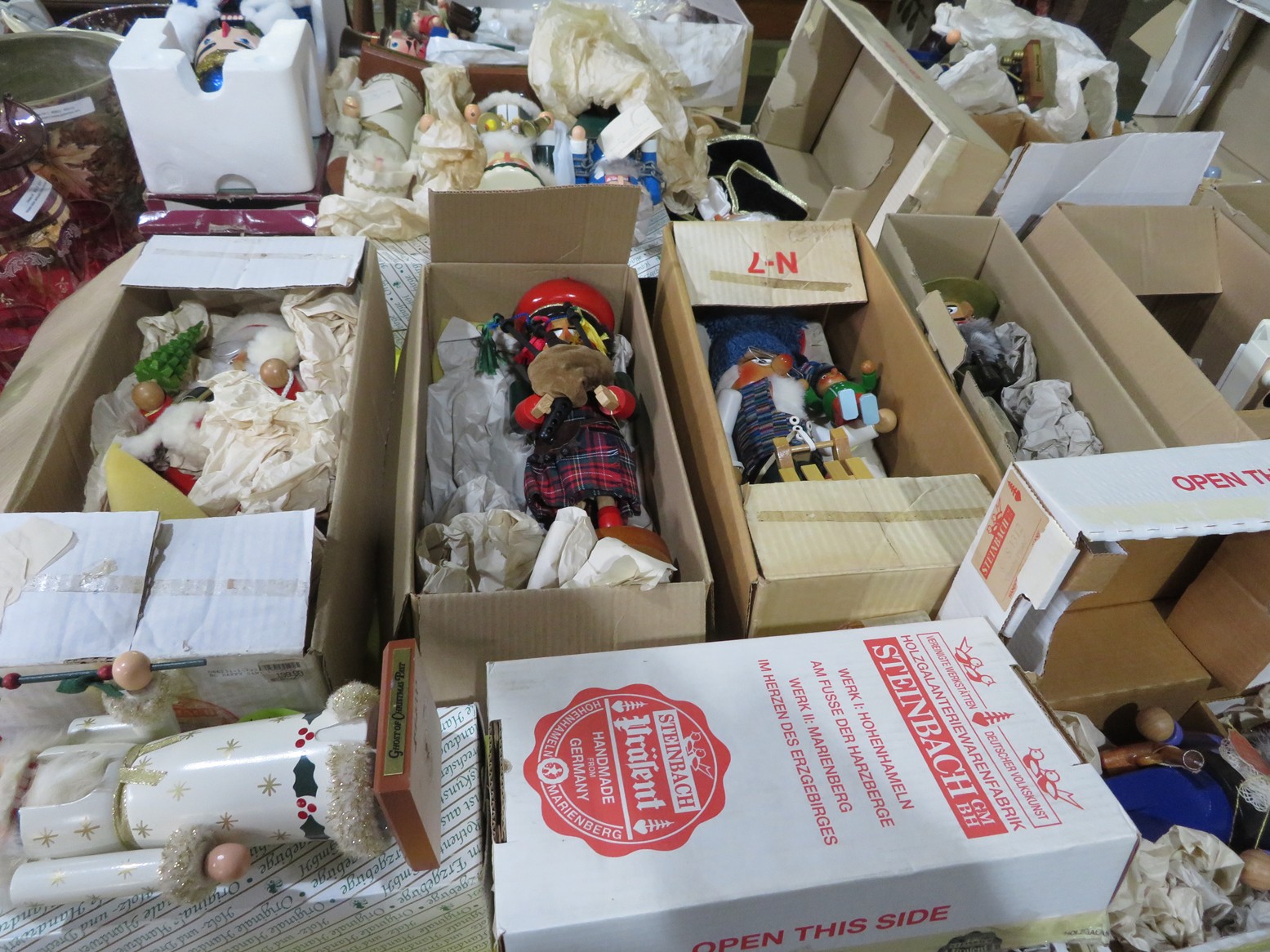 Steinbach nutcrackers in boxes! Including Uncle Sam, Scarecrow, Santa, Butler, Blacksmith & lots more; Enamel ware canister set; Old lantern; Carved gourds; Brass pot; Rolling pin; Melamine divided dishes; Large cardinal decorated canister; Children’s alphabet blocks; Brass serving ladle & knife; Cloisonne eggs;