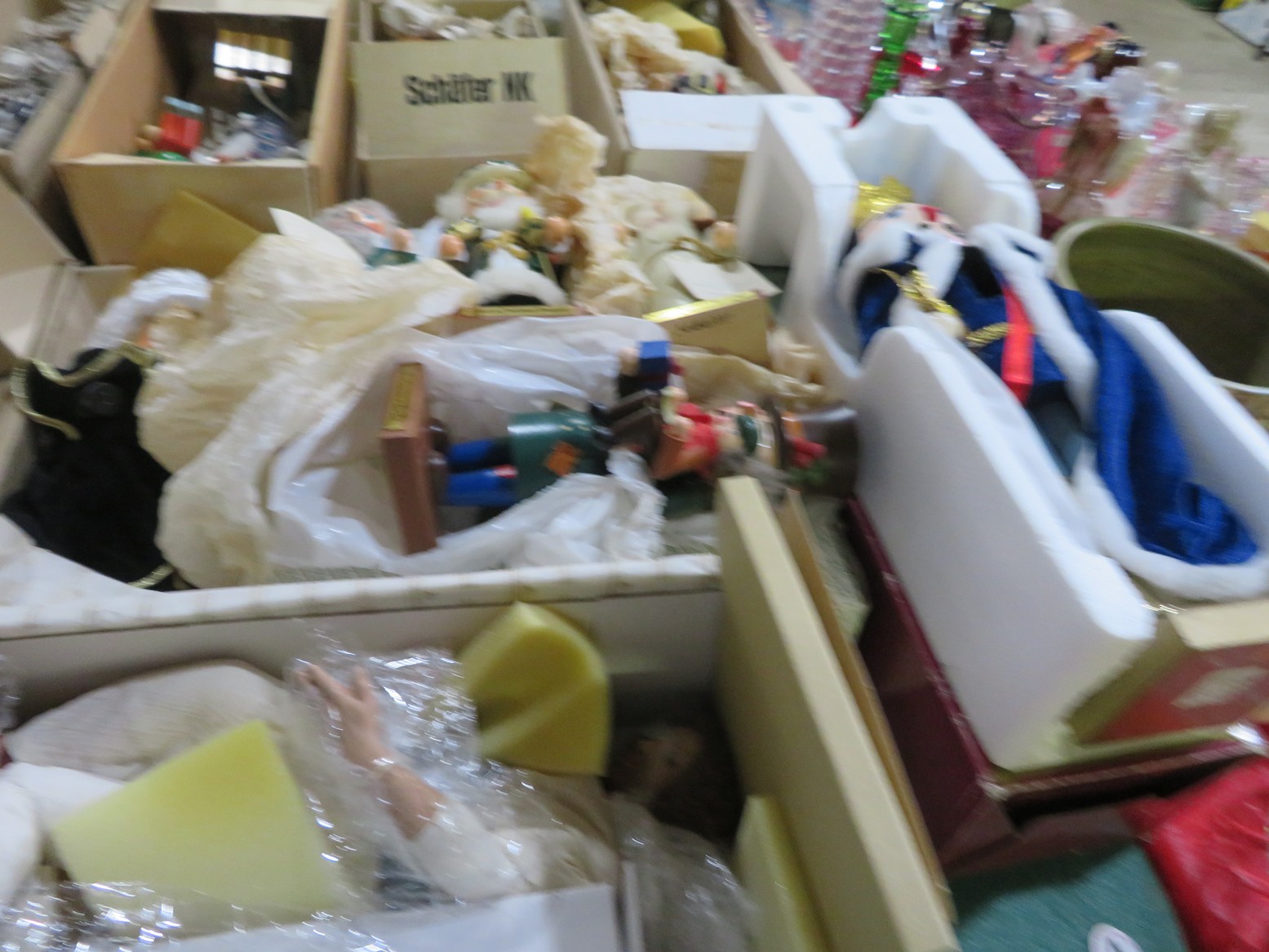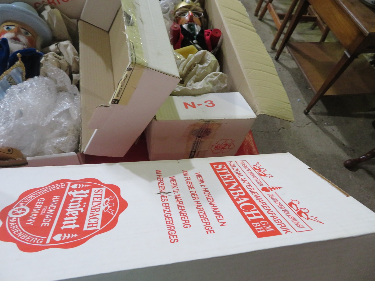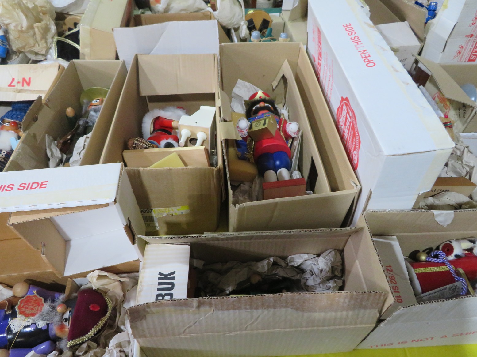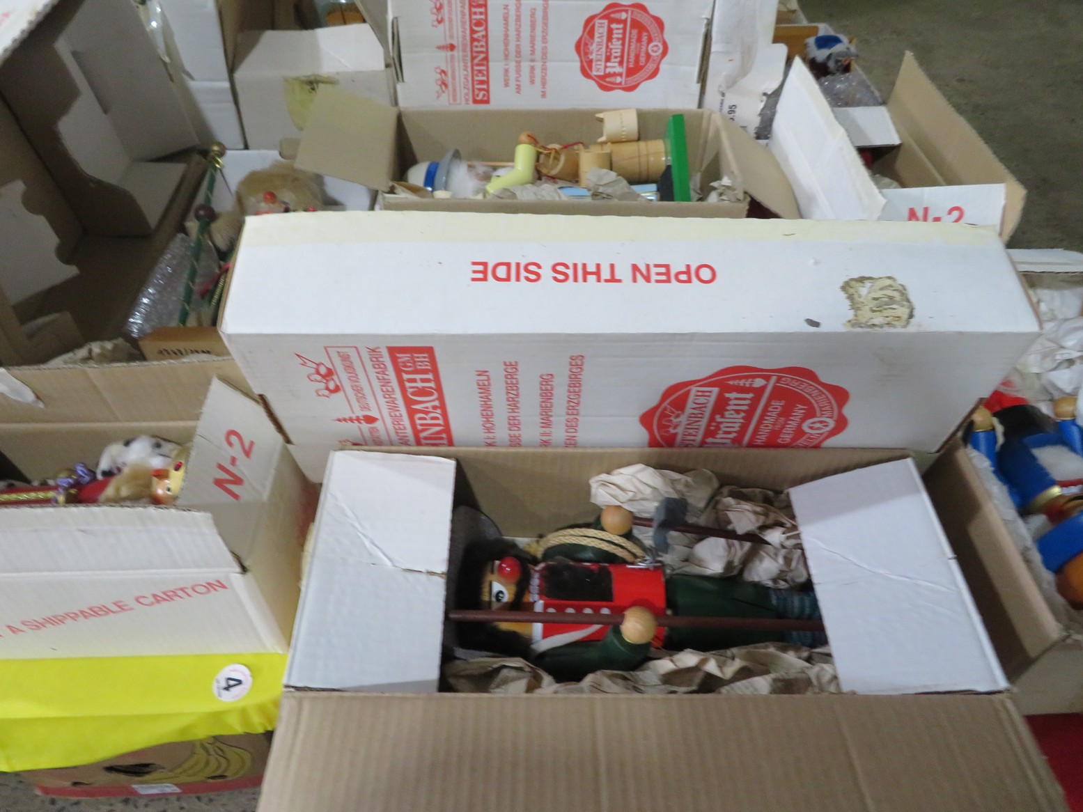 Steinbach nutcrackers in boxes! Including Uncle Sam, Scarecrow, Santa, Butler, Blacksmith & lots more; Enamel ware canister set; Old lantern; Carved gourds; Brass pot; Rolling pin; Melamine divided dishes; Large cardinal decorated canister; Children’s alphabet blocks; Brass serving ladle & knife; Cloisonne eggs;