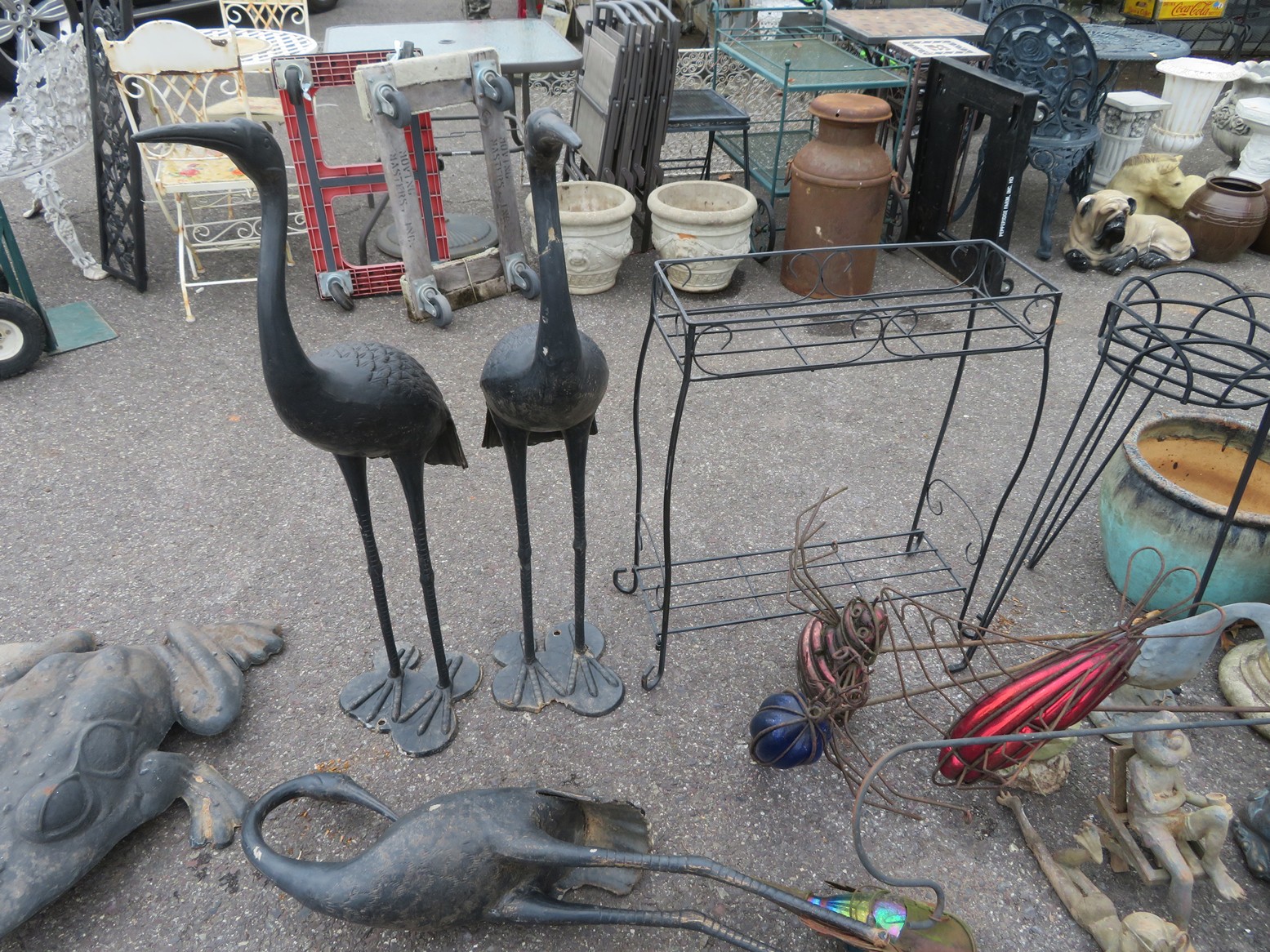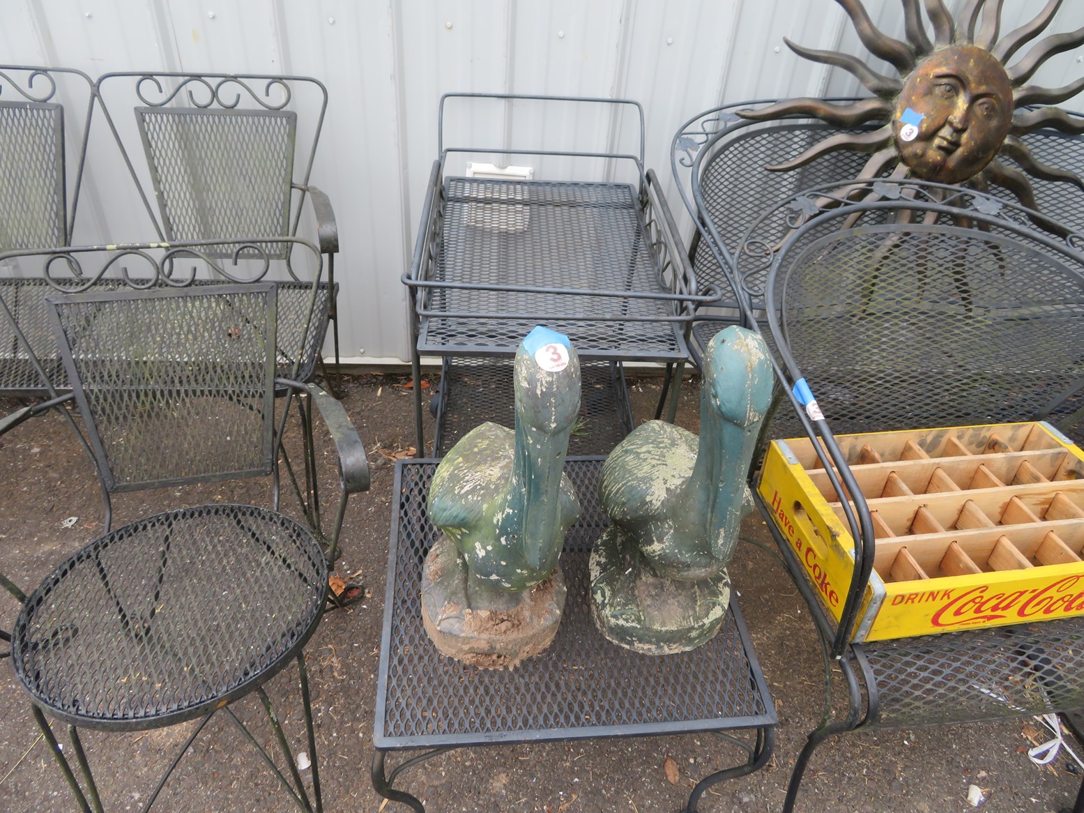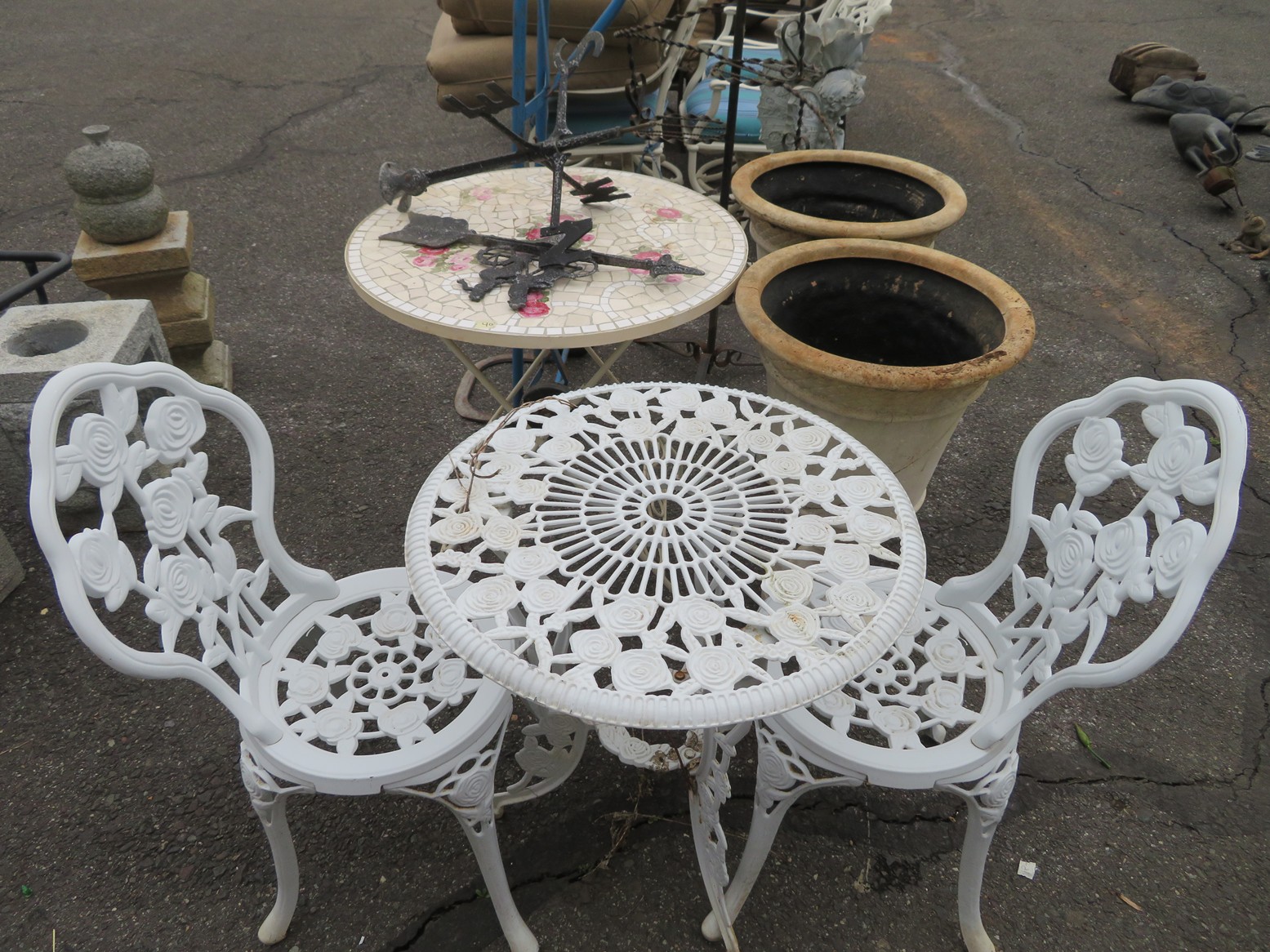 Wall clocks; Sleigh bells; Wall mirrors; Onyx case Waterbury clock; Mantel clock; Victorian side table; Wrought iron patio furniture; Garden decorations; Outdoor planters; Urns; Wrought iron tea cart; Cast iron table & chairs & more!