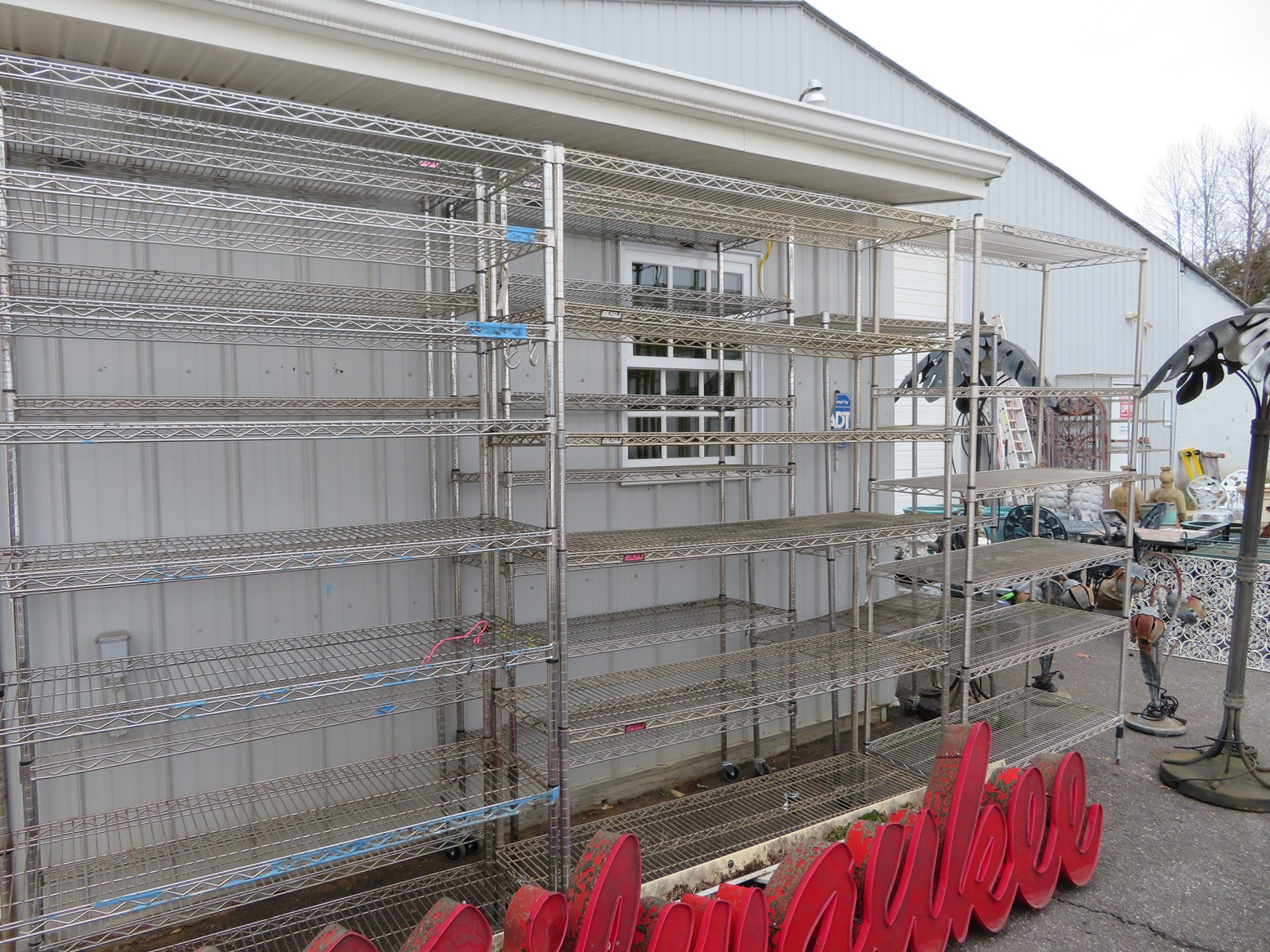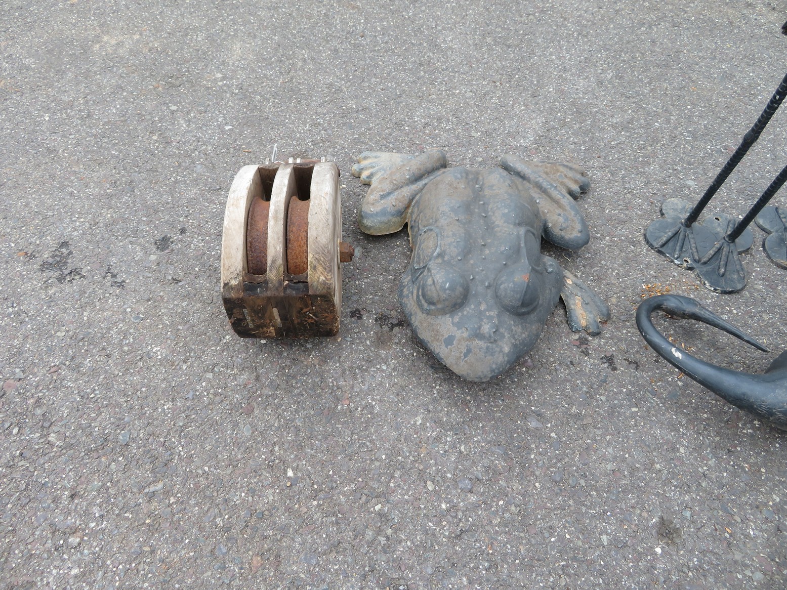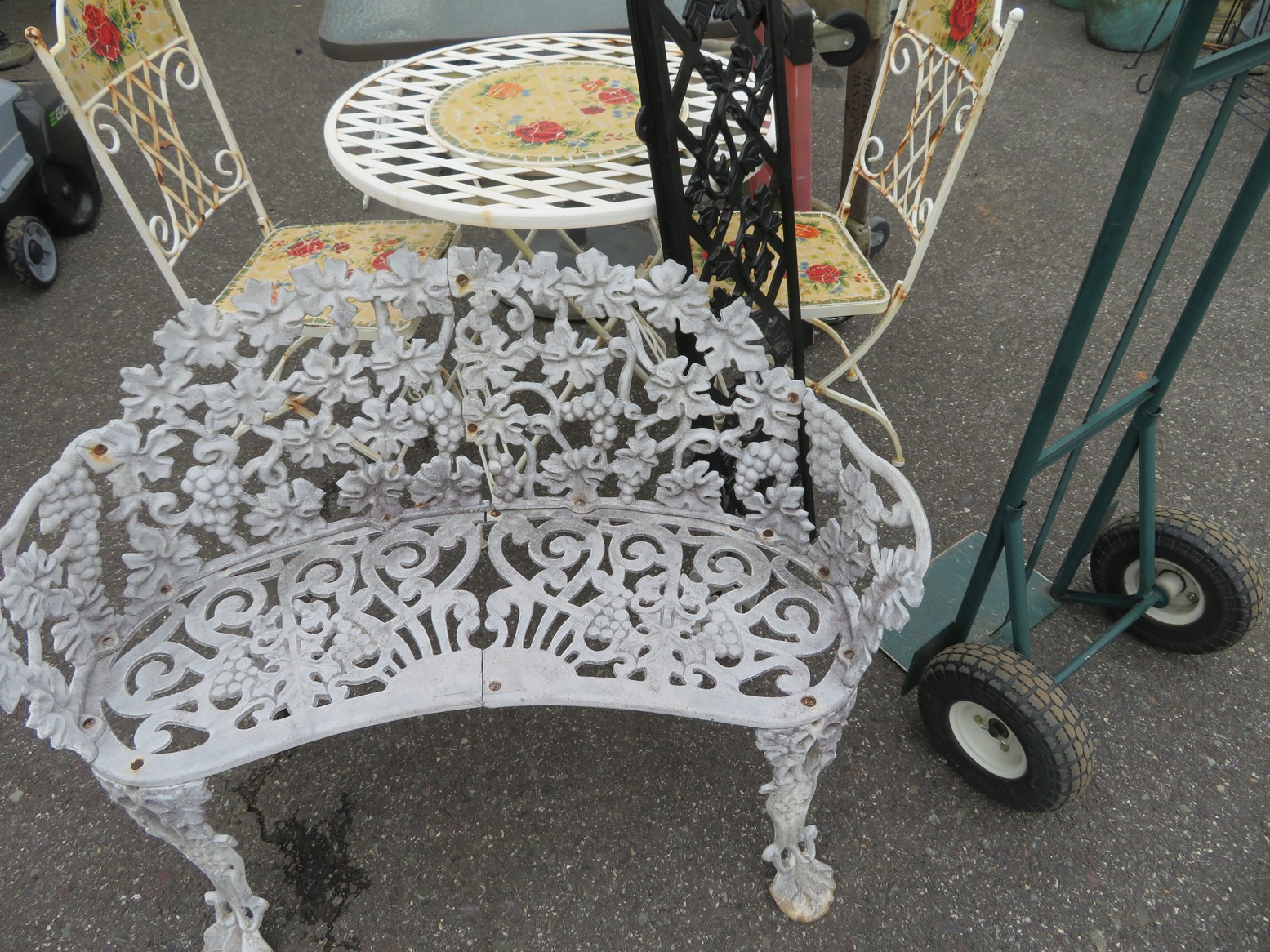 Wall clocks; Sleigh bells; Wall mirrors; Onyx case Waterbury clock; Mantel clock; Victorian side table; Wrought iron patio furniture; Garden decorations; Outdoor planters; Urns; Wrought iron tea cart; Cast iron table & chairs & more!